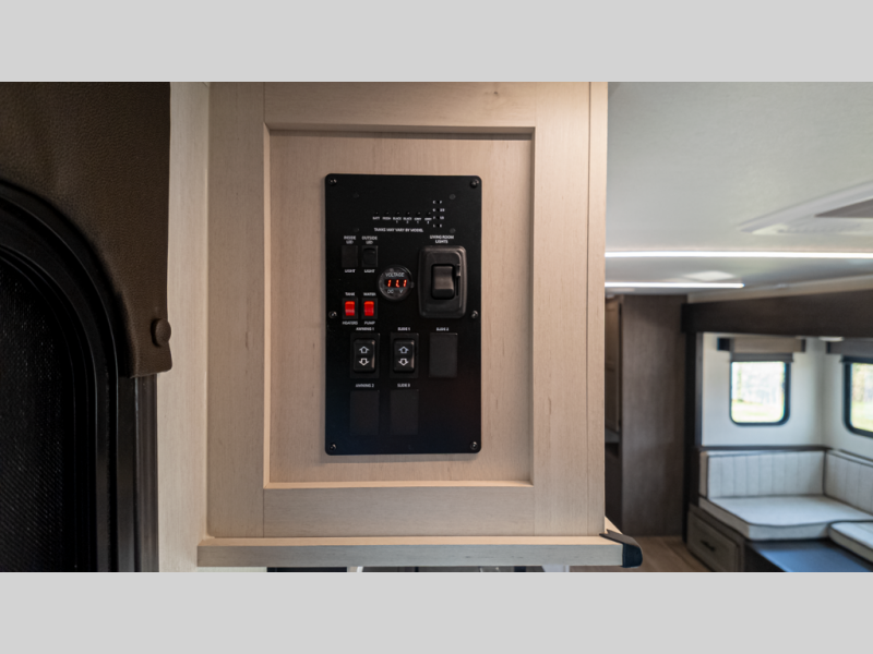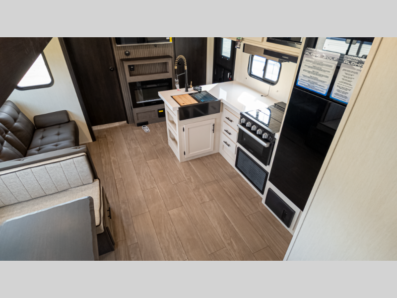 - Kitchen: Residential-style 10 cu ft 12V fridge, 3-burner cooktop, pantry, full sink, outside kitchen under awning