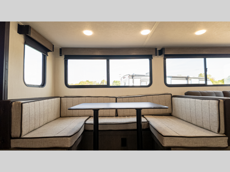 Triple bunk room, U-dinette, outdoor kitchen, and space for 10—all in a tow-friendly 34 ft layout