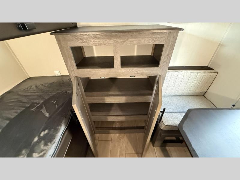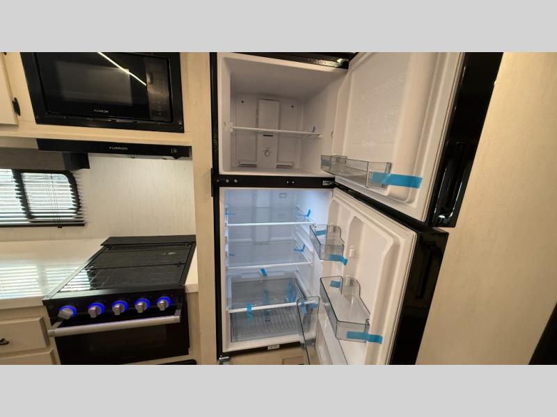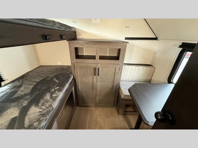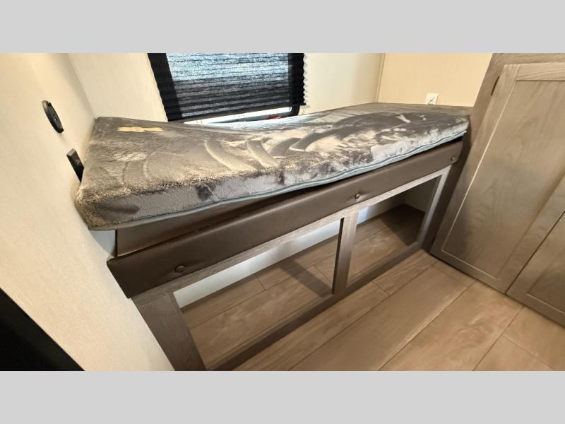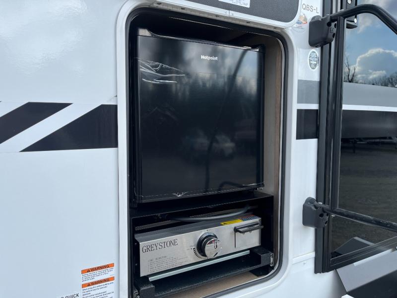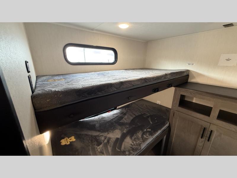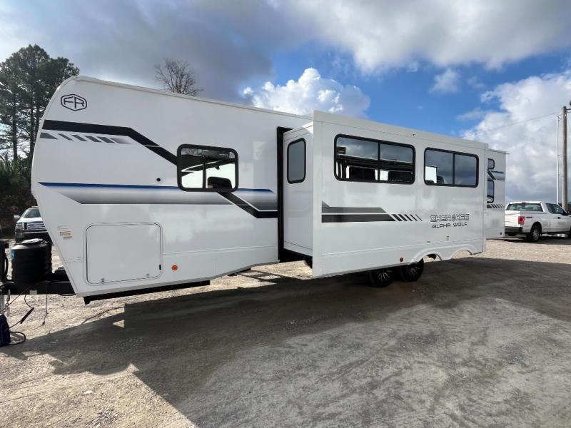 Looking for a spacious travel trailer to sleep nine or ten happy campers? You've found it in this Cherokee Alpha Wolf model with a handy outside kitchen, a bunkhouse with a dinette, a front private bedroom, and a large slide out! The main living and kitchen area has a U-shaped dinette to utilize as a dining table, game table, work station, and/or an extra sleeping space. There is also a jackknife sofa for seating, TV watching, or sleeping. From any seating area you can easily view the entertainment center and fireplace which is centered in the unit with doors on either side to the front private bedroom. You will also find a nice pantry and full kitchen amenities including a large sink, and residential-style refrigerator allowing you to easily create meals for your hungry crew. The exterior provides an 18' awning for an outdoor living area over the outside kitchen, and there is ample exterior storage for all of your camping gear like camp chairs, outside games, rugs, and more.