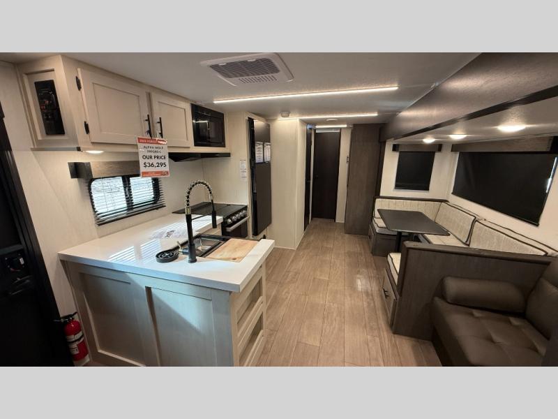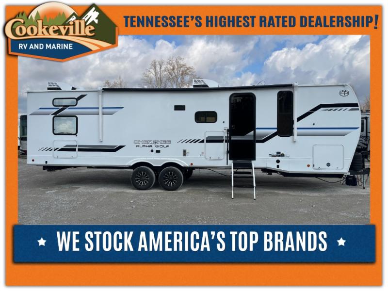 With any Cherokee Alpha Wolf travel trailer by Forest River you'll enjoy outstanding amenities, quality construction, and an affordable price. Each model features a "ToughBend" rigid skirt metal design, 5/8" tongue and groove plywood floor decking, and a "SuperTruss" roof structure that will hold up through years of camping memories. There is a pet friendly "clean sweep" floor design with no heat vents indoors, along with a super lumen lighting system, a 15,000 BTU quick cool central air conditioning, and many more comforts. There are many convenient exterior features such as, Leash Latch pet safety technology, an outside shower with hot and cold water, and exterior steps with oversized landing and quick release. The Weather Guard Package will add protection against the elements with an armored underbelly tank enclosure and forced air heat, thermo-control reflective safety glass windows, and upgraded laminated walls with block foam insulation!