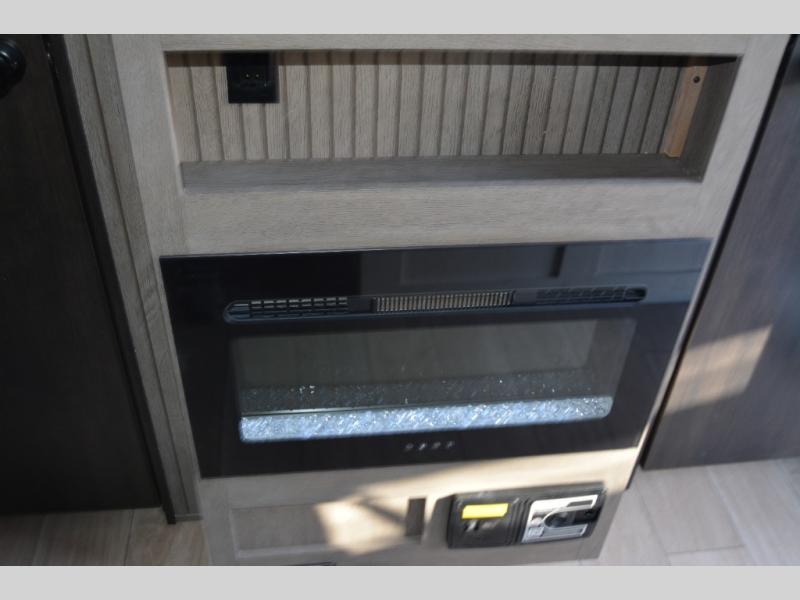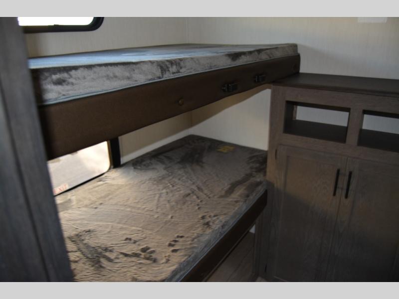 Looking for a spacious travel trailer to sleep nine? You've found it in this Cherokee Alpha Wolf model with a handy outside kitchen, a bunkhouse with a dinette, a front private bedroom, and a large slide out! The main living and kitchen area has a U-shaped dinette to utilize as a dining table, game table, work station, and/or an extra sleeping space. There is also a jackknife sofa for seating, TV watching, or sleeping. From any seating area you can easily view the entertainment center and fireplace which is centered in the unit with doors on either side to the front private bedroom. You will also find a nice pantry and full kitchen amenities including a large sink, and residential-style refrigerator allowing you to easily create meals for your hungry crew. The exterior provides an 18' awning for an outdoor living area over the outside kitchen, and there is ample exterior storage for all of your camping gear like camp chairs, outside games, rugs, and more.