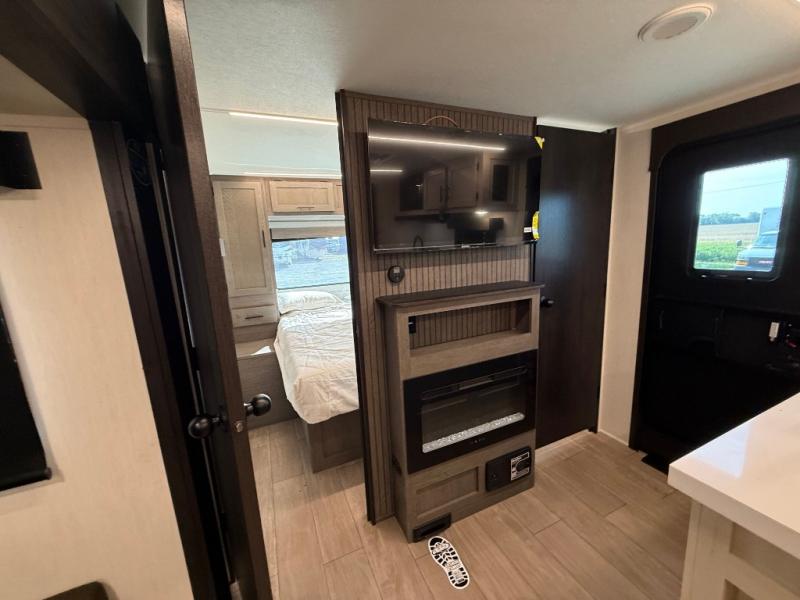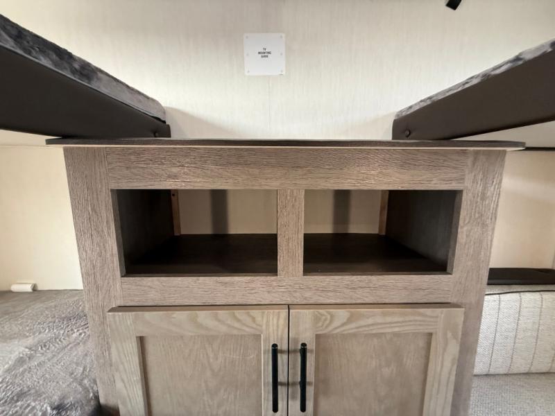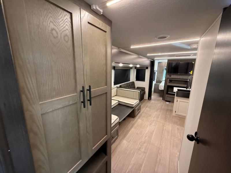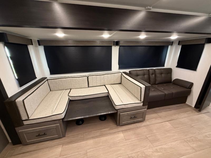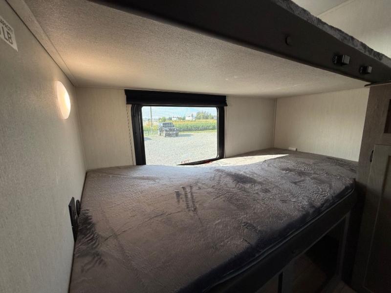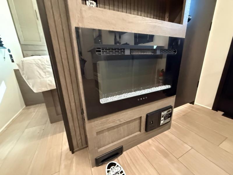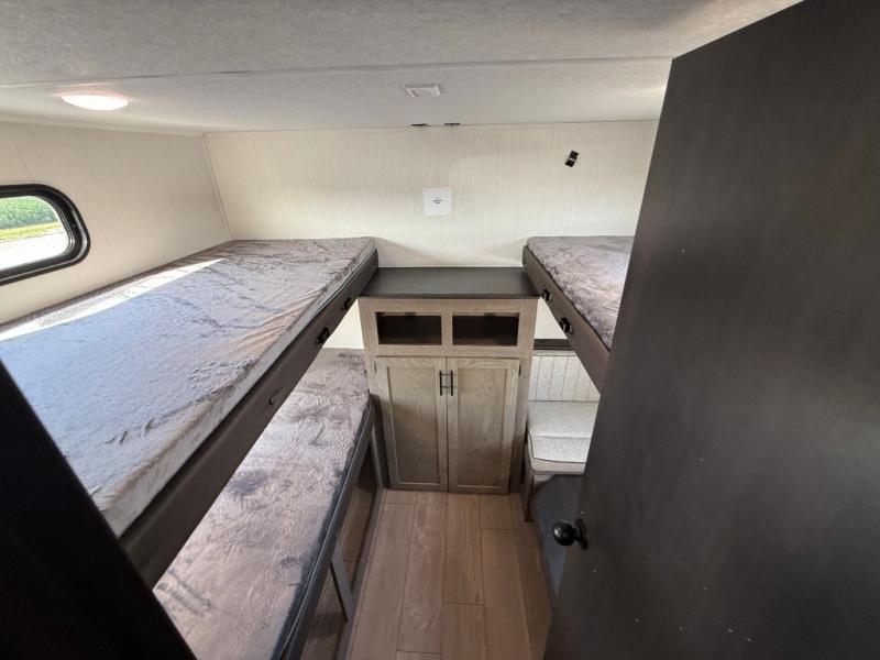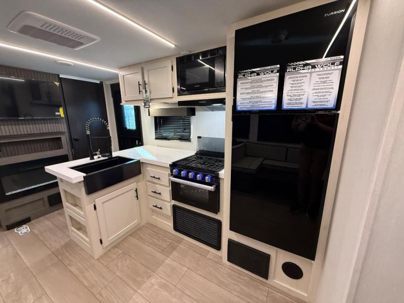 Looking for a spacious travel trailer to sleep nine or ten happy campers? You've found it in this Cherokee Alpha Wolf model with a handy outside kitchen, a bunkhouse with a dinette, a front private bedroom, and a large slide out! The main living and kitchen area has a U-shaped dinette to utilize as a dining table, game table, work station, and/or an extra sleeping space. There is also a jackknife sofa for seating, TV watching, or sleeping. From any seating area you can easily view the entertainment center and fireplace which is centered in the unit with doors on either side to the front private bedroom. You will also find a nice pantry and full kitchen amenities including a large sink, and residential-style refrigerator allowing you to easily create meals for your hungry crew. The exterior provides an 18' awning for an outdoor living area over the outside kitchen, and there is ample exterior storage for all of your camping gear like camp chairs, outside games, rugs, and more.
