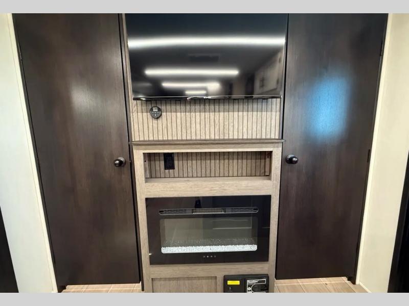 Looking for a spacious travel trailer to sleep nine or ten happy campers? You've found it in this Cherokee Alpha Wolf model with a handy outside kitchen, a bunkhouse with a dinette, a front private bedroom, and a large slide out! The main living and kitchen area has a U-shaped dinette to utilize as a dining table, game table, work station, and/or an extra sleeping space. There is also a jackknife sofa for seating, TV watching, or sleeping. From any seating area you can easily view the entertainment center and fireplace which is centered in the unit with doors on either side to the front private bedroom. You will also find a nice pantry and full kitchen amenities including a large sink, and residential-style refrigerator allowing you to easily create meals for your hungry crew. The exterior provides an 18' awning for an outdoor living area over the outside kitchen, and there is ample exterior storage for all of your camping gear like camp chairs, outside games, rugs, and more.