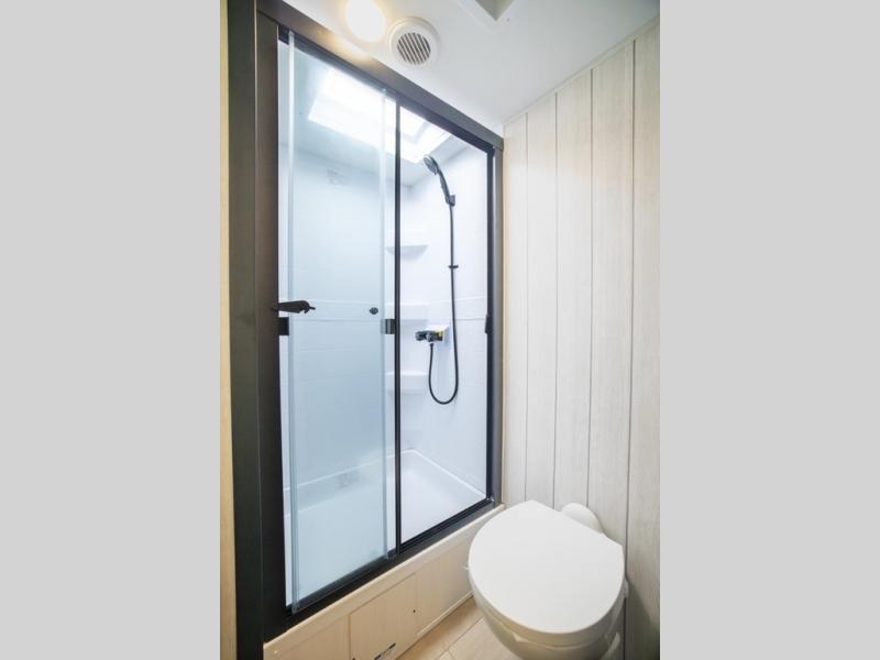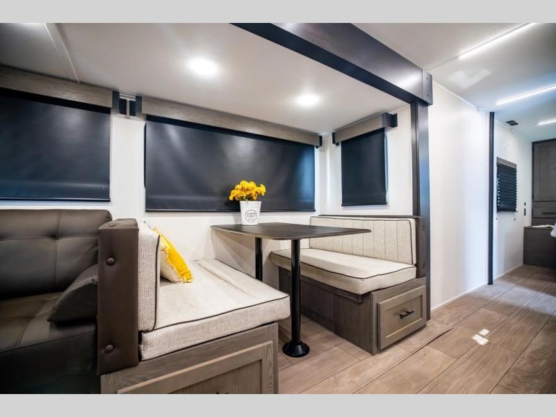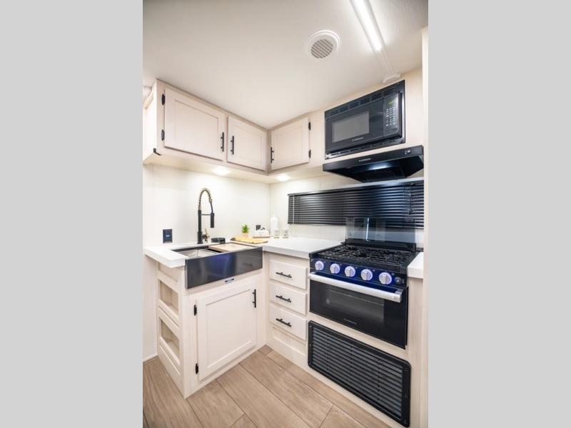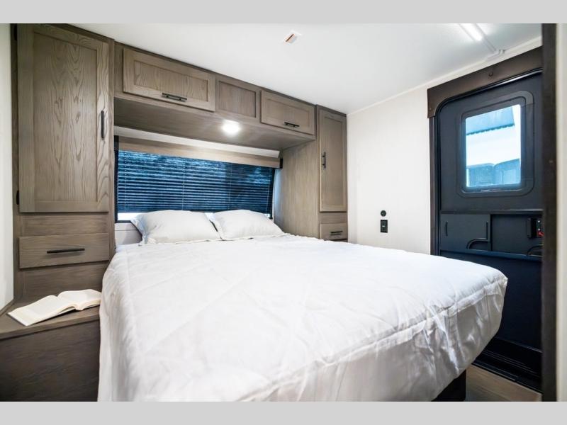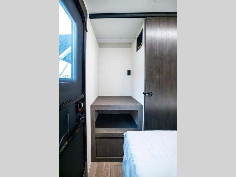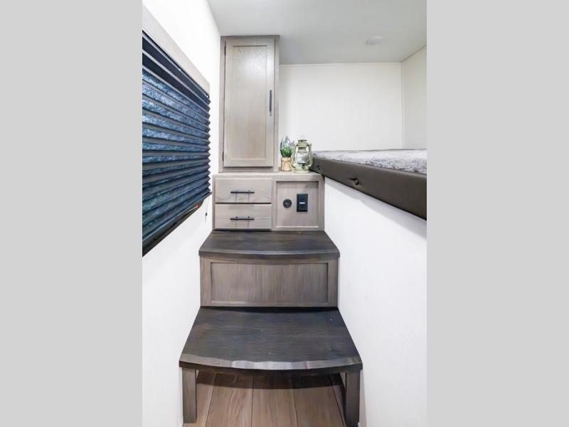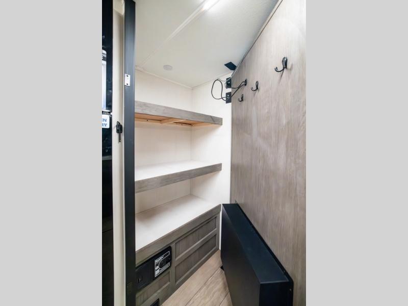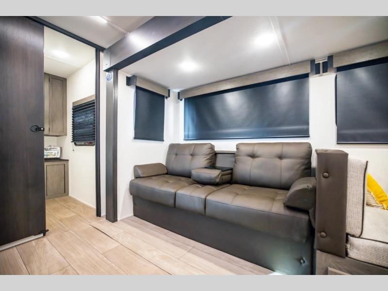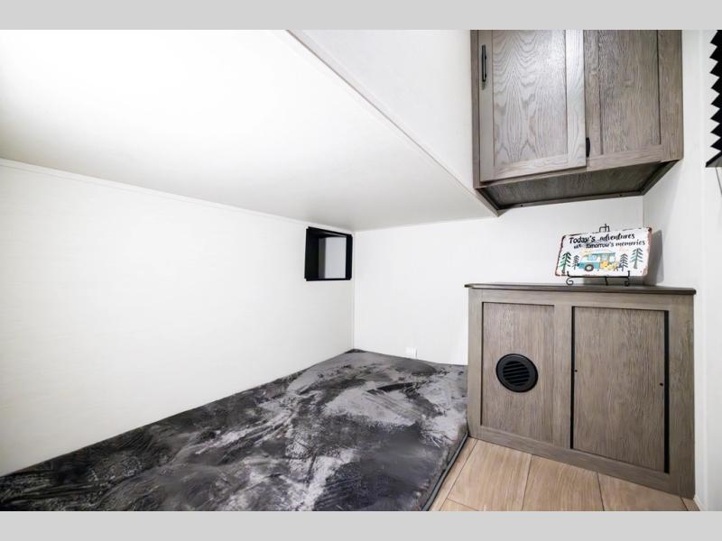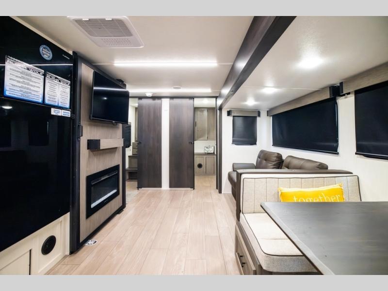 Starting at the front, this travel trailer welcomes you with a spacious main bedroom featuring a 60" x 80" queen bed for a restful night’s sleep, along with a nightstand and wardrobe on each side, plus an additional wardrobe and overhead cabinets for ample storage. Moving down the hall, you’ll find the full bathroom equipped with a shower, porcelain stool toilet, and a sink with generous counter space to help you get ready for the day. At the center of the trailer, the kitchen and living area open up with a large slide-out containing the jackknife sofa and dinette, creating an inviting space to relax. Across, the fully equipped kitchen offers a 10-cu. ft. refrigerator, farmhouse-style sink, and a three-burner stove with microwave, everything you need to prepare your favorite meals. Beside the kitchen, the entertainment center with fireplace adds warmth and ambiance, and conceals a hidden pantry for all your dry goods. At the rear, the split 38" x 72" bunks provide exceptional privacy and comfort: the lower bunk features its own wardrobe, nightstand, and sliding door, while the upper bunk includes its own wardrobe, steps, and sliding door, making this a cozy retreat for everyone.