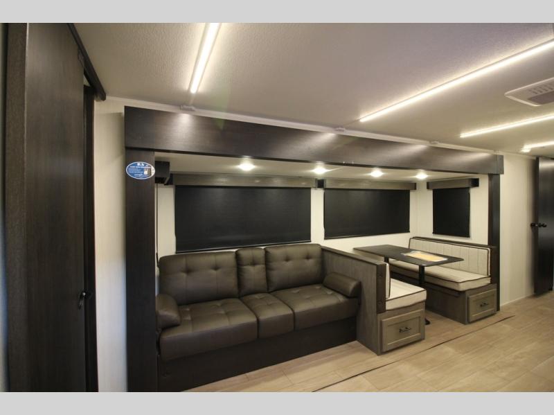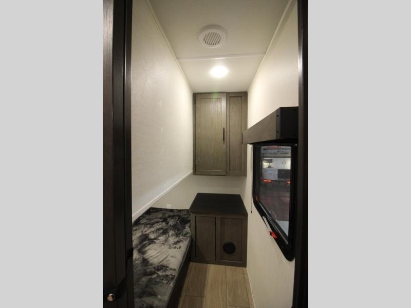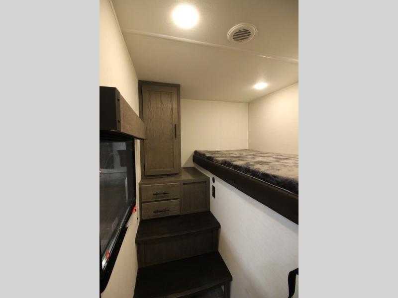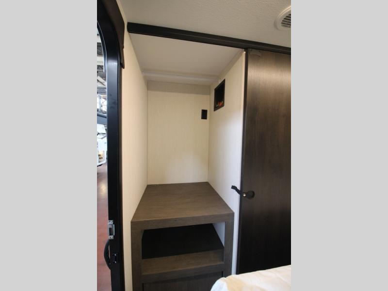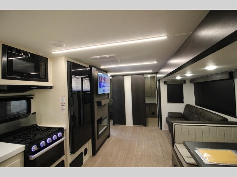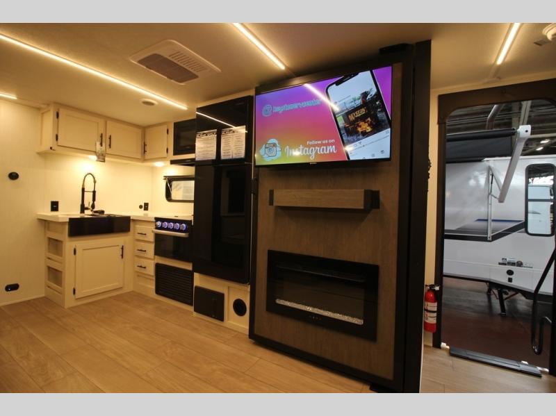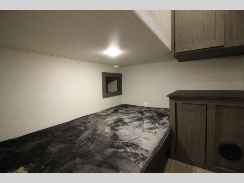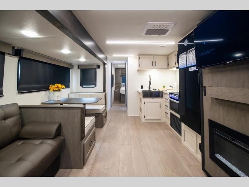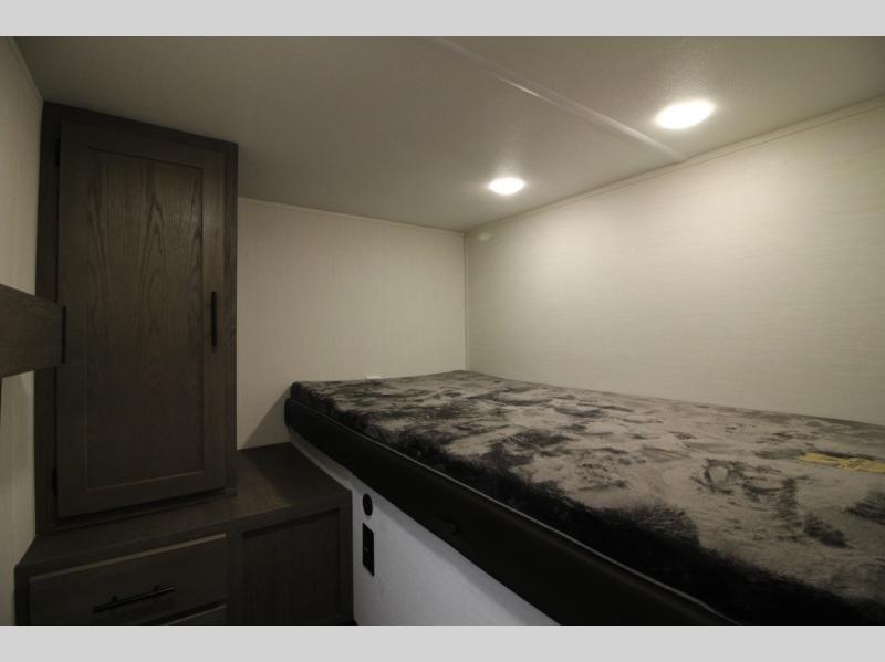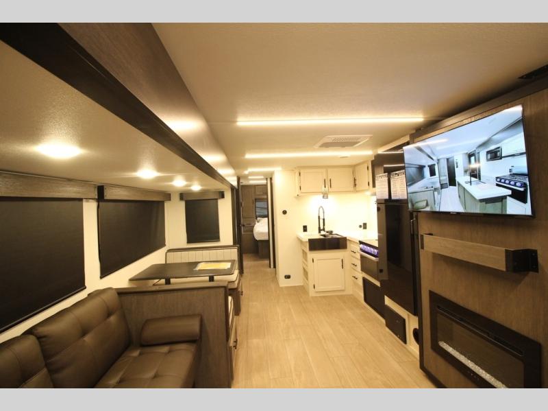 Starting at the front, this travel trailer welcomes you with a spacious main bedroom featuring a 60" x 80" queen bed for a restful night’s sleep, along with a nightstand and wardrobe on each side, plus an additional wardrobe and overhead cabinets for ample storage. Moving down the hall, you’ll find the full bathroom equipped with a shower, porcelain stool toilet, and a sink with generous counter space to help you get ready for the day. At the center of the trailer, the kitchen and living area open up with a large slide-out containing the jackknife sofa and dinette, creating an inviting space to relax. Across, the fully equipped kitchen offers a 10-cu. ft. refrigerator, farmhouse-style sink, and a three-burner stove with microwave, everything you need to prepare your favorite meals. Beside the kitchen, the entertainment center with fireplace adds warmth and ambiance, and conceals a hidden pantry for all your dry goods. At the rear, the split 38" x 72" bunks provide exceptional privacy and comfort: the lower bunk features its own wardrobe, nightstand, and sliding door, while the upper bunk includes its own wardrobe, steps, and sliding door, making this a cozy retreat for everyone.