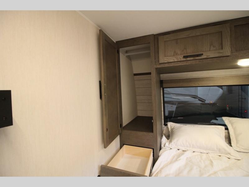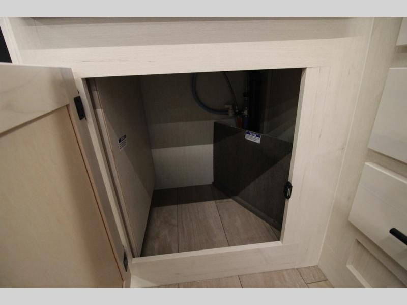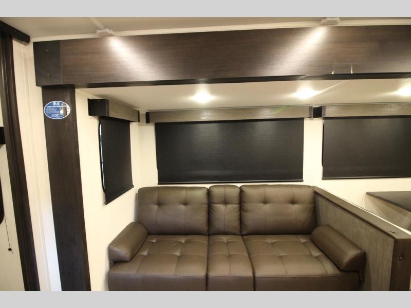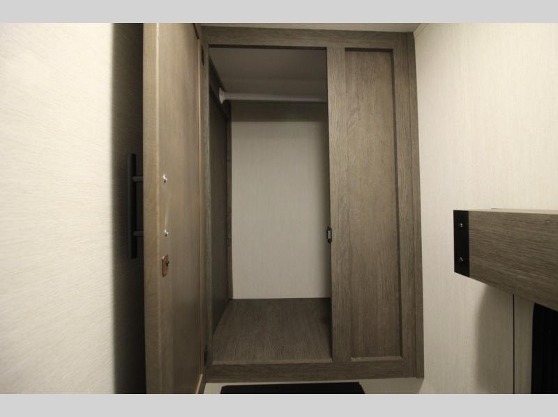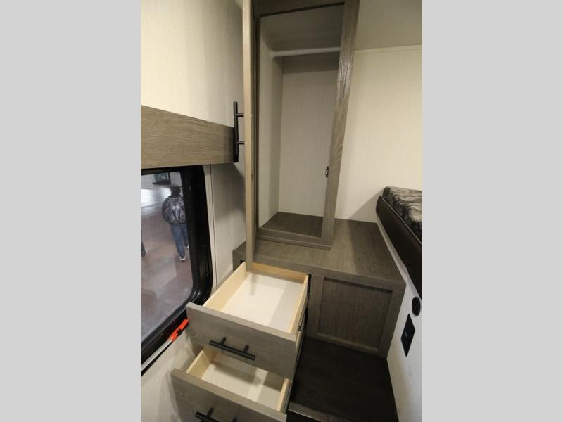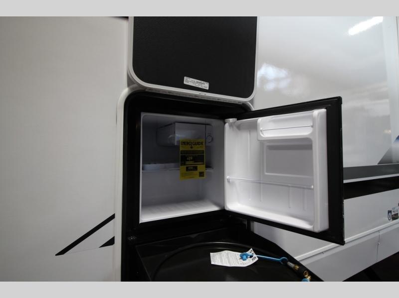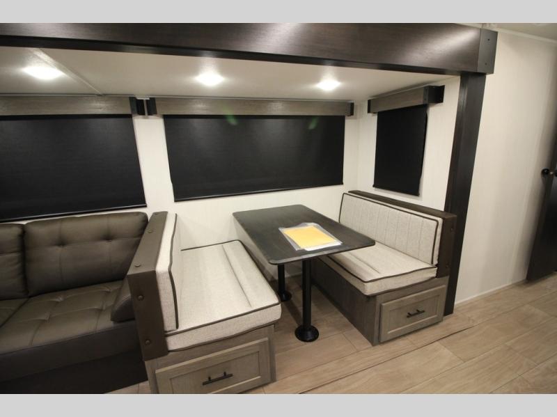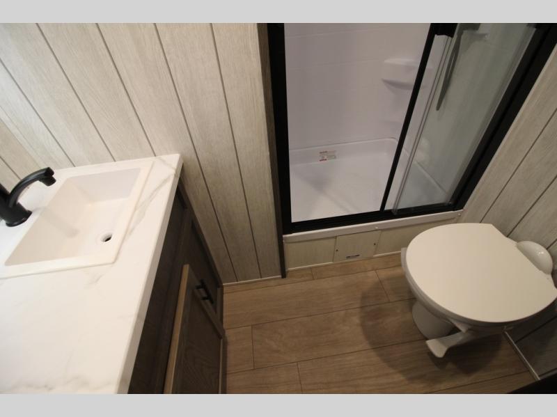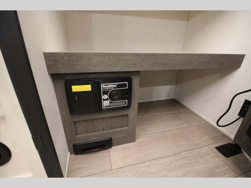 Starting at the front, this travel trailer welcomes you with a spacious main bedroom featuring a 60" x 80" queen bed for a restful night’s sleep, along with a nightstand and wardrobe on each side, plus an additional wardrobe and overhead cabinets for ample storage. Moving down the hall, you’ll find the full bathroom equipped with a shower, porcelain stool toilet, and a sink with generous counter space to help you get ready for the day. At the center of the trailer, the kitchen and living area open up with a large slide-out containing the jackknife sofa and dinette, creating an inviting space to relax. Across, the fully equipped kitchen offers a 10-cu. ft. refrigerator, farmhouse-style sink, and a three-burner stove with microwave, everything you need to prepare your favorite meals. Beside the kitchen, the entertainment center with fireplace adds warmth and ambiance, and conceals a hidden pantry for all your dry goods. At the rear, the split 38" x 72" bunks provide exceptional privacy and comfort: the lower bunk features its own wardrobe, nightstand, and sliding door, while the upper bunk includes its own wardrobe, steps, and sliding door, making this a cozy retreat for everyone.