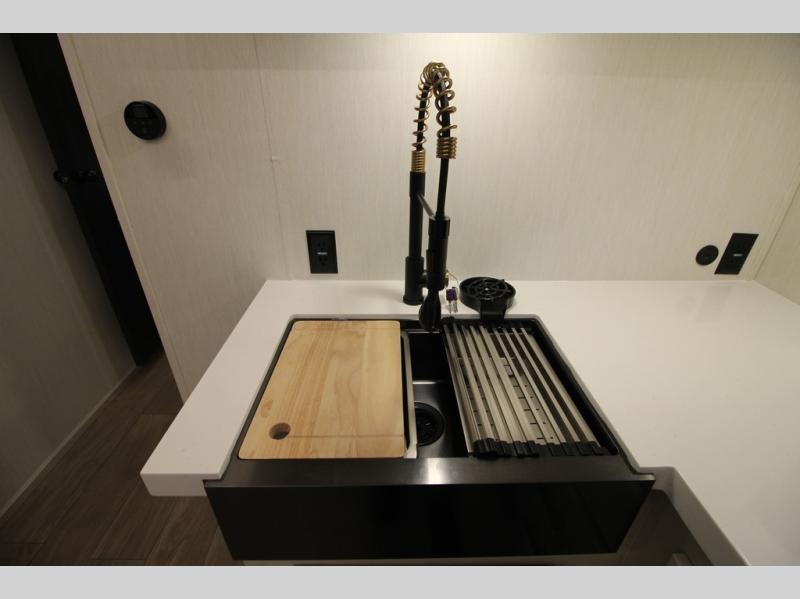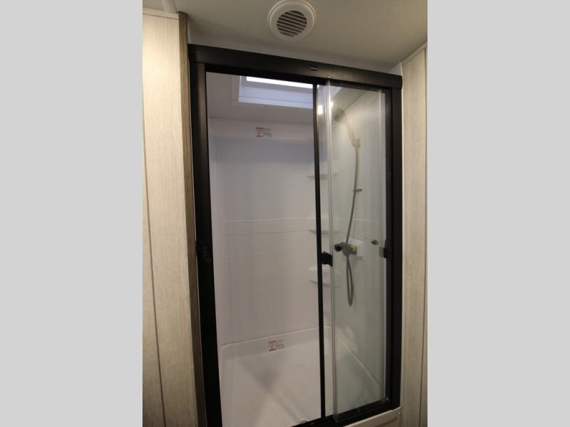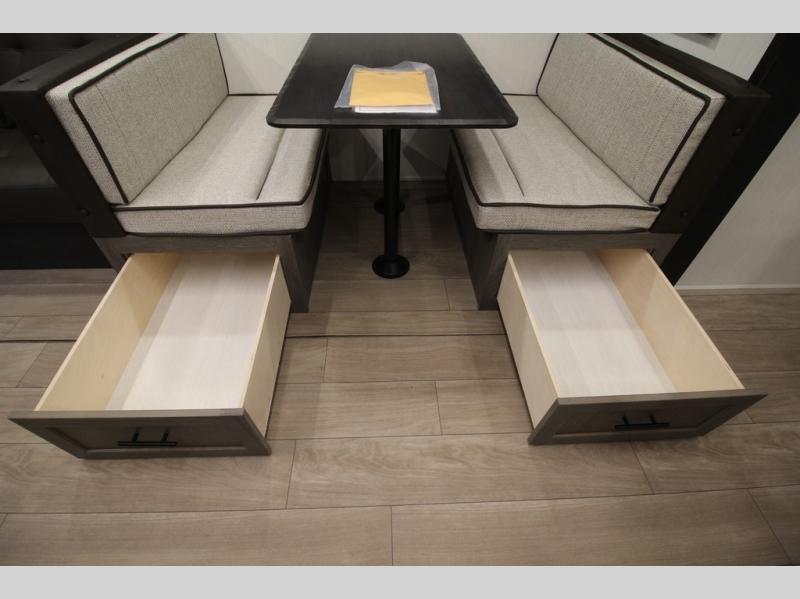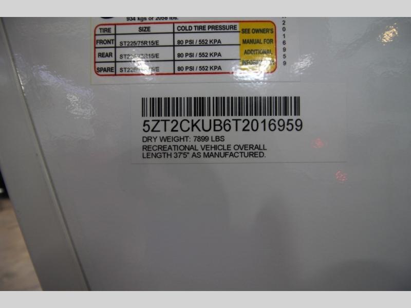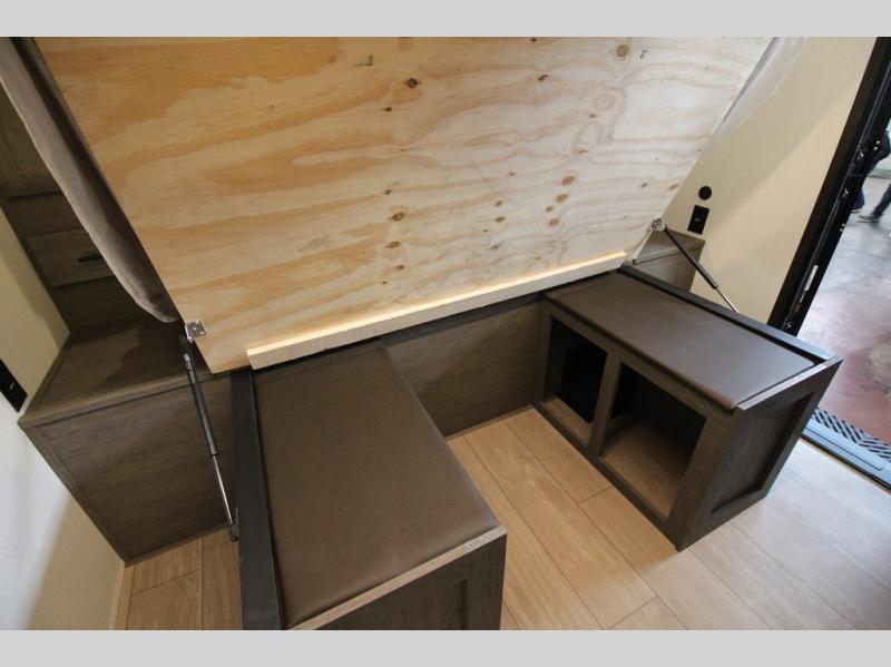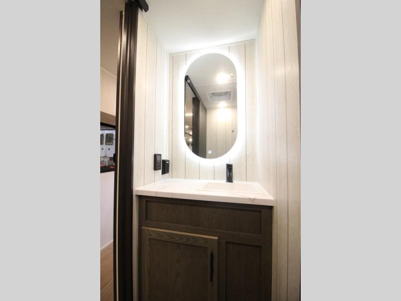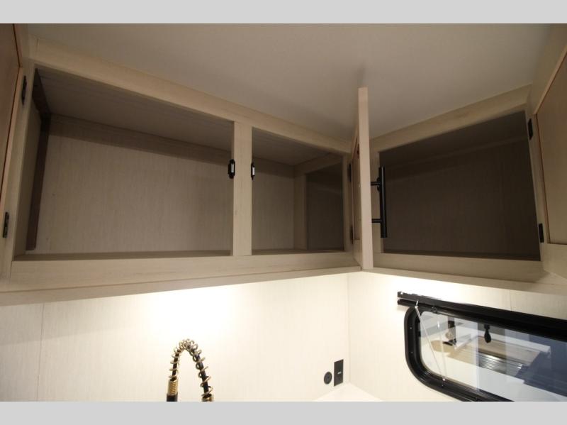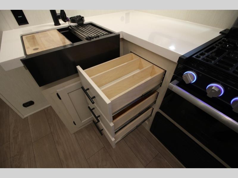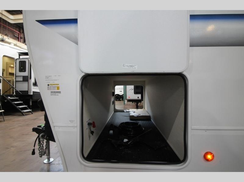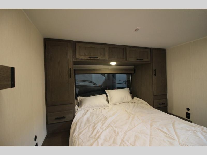 Starting at the front, this travel trailer welcomes you with a spacious main bedroom featuring a 60" x 80" queen bed for a restful night’s sleep, along with a nightstand and wardrobe on each side, plus an additional wardrobe and overhead cabinets for ample storage. Moving down the hall, you’ll find the full bathroom equipped with a shower, porcelain stool toilet, and a sink with generous counter space to help you get ready for the day. At the center of the trailer, the kitchen and living area open up with a large slide-out containing the jackknife sofa and dinette, creating an inviting space to relax. Across, the fully equipped kitchen offers a 10-cu. ft. refrigerator, farmhouse-style sink, and a three-burner stove with microwave, everything you need to prepare your favorite meals. Beside the kitchen, the entertainment center with fireplace adds warmth and ambiance, and conceals a hidden pantry for all your dry goods. At the rear, the split 38" x 72" bunks provide exceptional privacy and comfort: the lower bunk features its own wardrobe, nightstand, and sliding door, while the upper bunk includes its own wardrobe, steps, and sliding door, making this a cozy retreat for everyone.