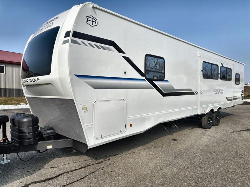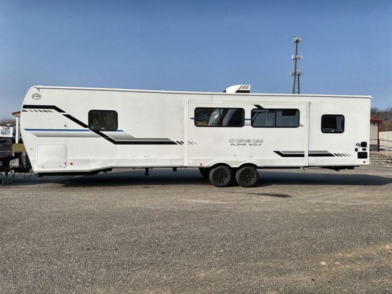 With any Cherokee Alpha Wolf travel trailer by Forest River, you'll enjoy outstanding amenities, quality construction, and an affordable price. Each model features a "ToughBend" rigid skirt metal design, 5/8" tongue and groove plywood floor decking, and a "SuperTruss" roof structure built for countless camping memories. There is a pet friendly "clean sweep" floor design with no heat vents indoors, along with a super lumen lighting system, a 15,000 BTU quick cool central air conditioning, and many more comforts. There are many convenient exterior features such as, Leash Latch pet safety technology, an outside shower with hot and cold water, and exterior steps with oversized landing and quick release. The Weather Guard Package will add protection against the elements with an armored underbelly tank enclosure and forced air heat, thermo-control reflective safety glass windows, and upgraded laminated exterior walls with block foam insulation!