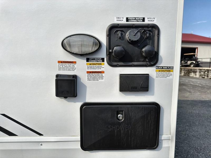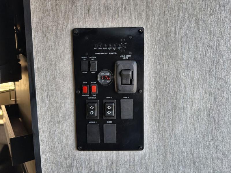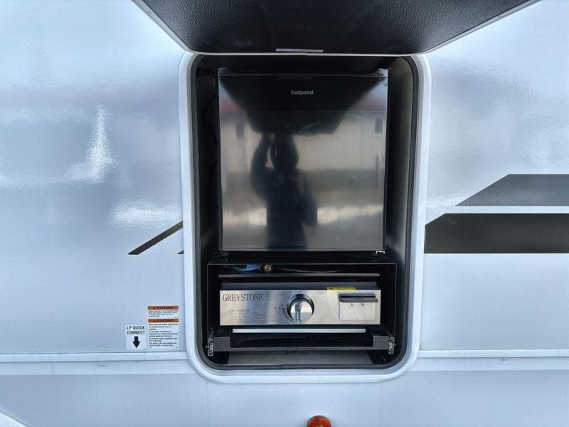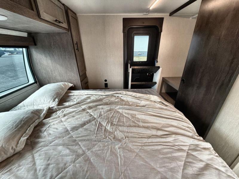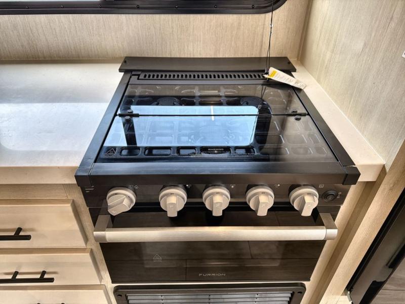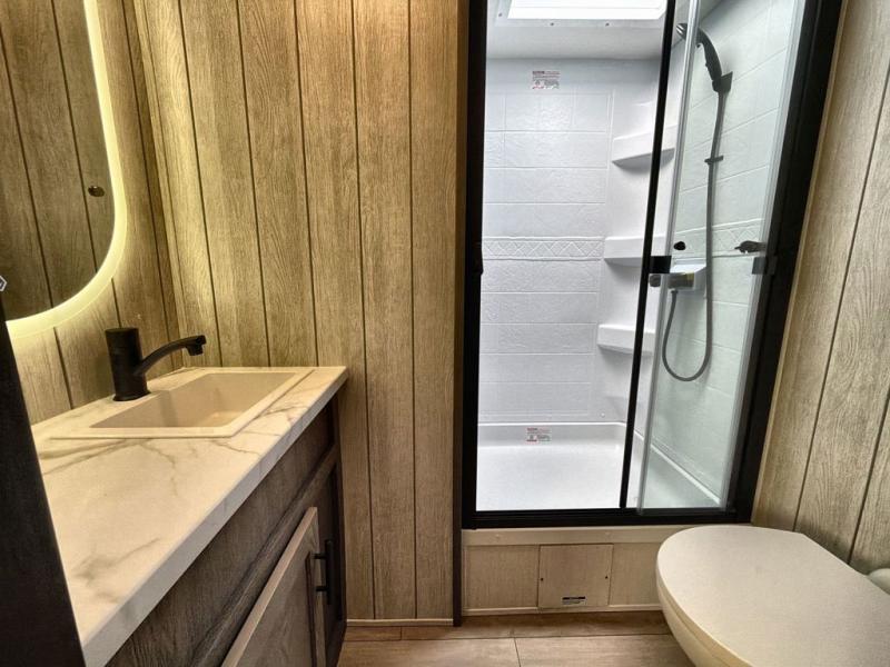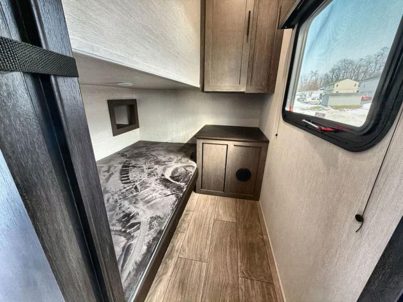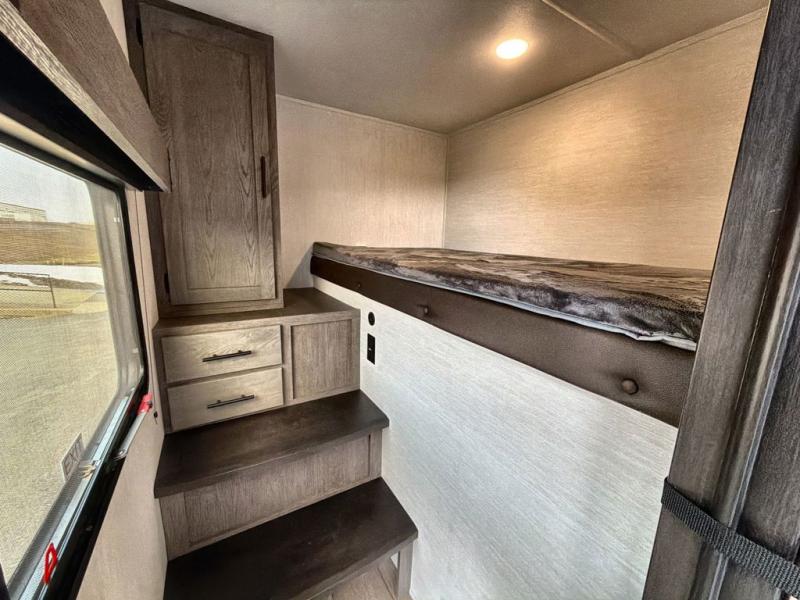 Starting at the front, this travel trailer welcomes you with a spacious main bedroom featuring a 60" x 80" queen bed for a restful night’s sleep, along with a nightstand and wardrobe on each side, plus an additional wardrobe and overhead cabinets for ample storage. Moving down the hall, you’ll find the full bathroom equipped with a shower, porcelain stool toilet, and a sink with generous counter space to help you get ready for the day. At the center of the trailer, the kitchen and living area open up with a large slide-out containing the jackknife sofa and dinette, creating an inviting space to relax. Across, the fully equipped kitchen offers a 10-cu. ft. refrigerator, farmhouse-style sink, and a three-burner stove with microwave, everything you need to prepare your favorite meals. Beside the kitchen, the entertainment center with fireplace adds warmth and ambiance, and conceals a hidden pantry for all your dry goods. At the rear, the split 38" x 72" bunks provide exceptional privacy and comfort: the lower bunk features its own wardrobe, nightstand, and sliding door, while the upper bunk includes its own wardrobe, steps, and sliding door, making this a cozy retreat for everyone.