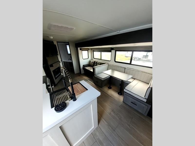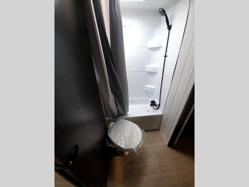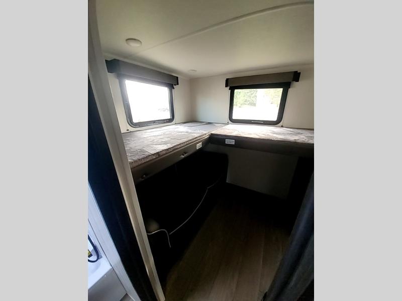 This stunning travel trailer is designed to provide comfort, luxury, and excitement on the open road. Starting with the two flip-up top bunk beds, perfect for kids or adults alike. The tri-fold sofa and jackknife sofa offer additional sleeping space or comfortable spots to lounge, making it easy to accommodate guests. The walk-through bathroom provides convenience and comfort, while the entertainment center with fireplace is a hub for fun and relaxation. Cozy up by the fire on chilly evenings and enjoy quality time with loved ones. The U-shaped dinette is ideal for meals or socializing, and the pantry, 12V refrigerator, microwave, and overhead cabinet ensure that you're well-equipped for cooking and storing food on the go. Featuring a spacious queen bed, convenient nightstands, stylish wardrobes, and overhead head cabinets for storing your belongings, this peaceful sanctuary is the perfect place to rest and recharge after a day of adventure.
