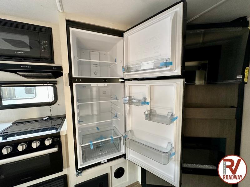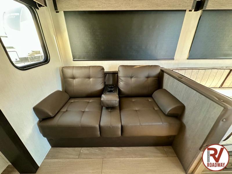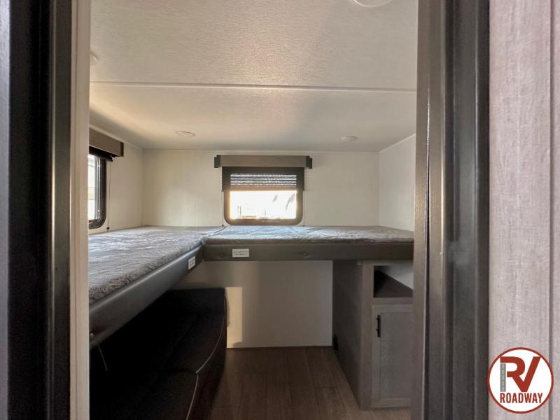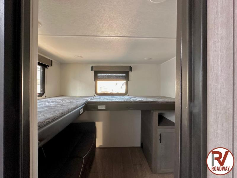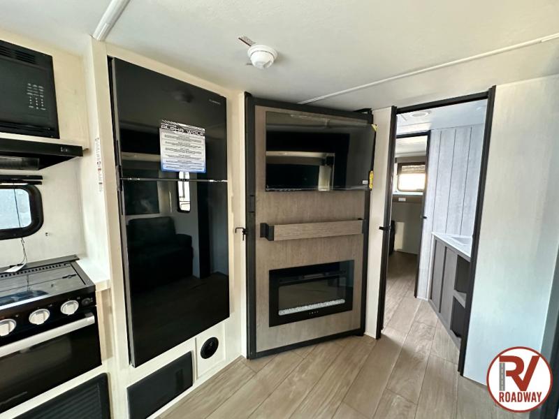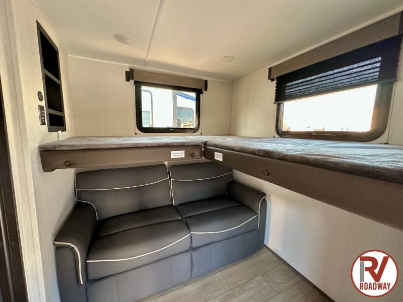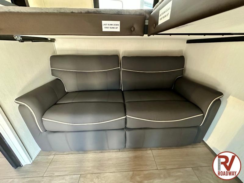 This stunning travel trailer is designed to provide comfort, luxury, and excitement on the open road. Starting with the two flip-up top bunk beds, perfect for kids or adults alike. The tri-fold sofa and jackknife sofa offer additional sleeping space or comfortable spots to lounge, making it easy to accommodate guests. The walk-through bathroom provides convenience and comfort, while the entertainment center with fireplace is a hub for fun and relaxation. Cozy up by the fire on chilly evenings and enjoy quality time with loved ones. The U-shaped dinette is ideal for meals or socializing, and the pantry, 12V refrigerator, microwave, and overhead cabinet ensure that you're well-equipped for cooking and storing food on the go. Featuring a spacious queen bed, convenient nightstands, stylish wardrobes, and overhead head cabinets for storing your belongings, this peaceful sanctuary is the perfect place to rest and recharge after a day of adventure.