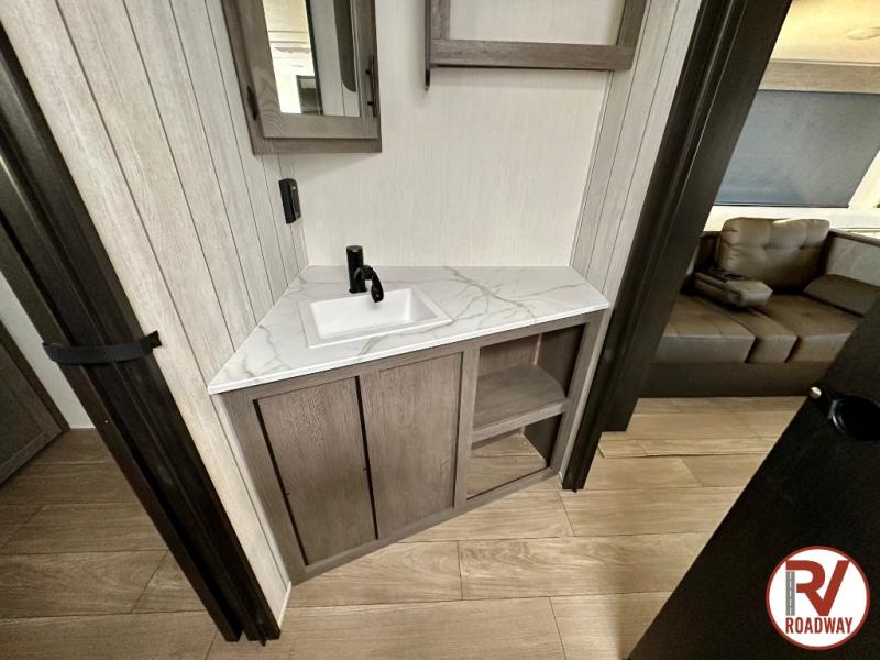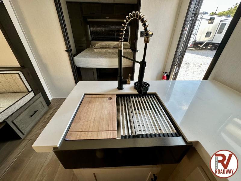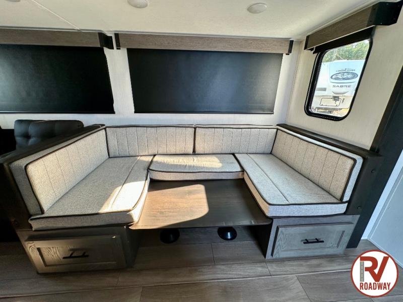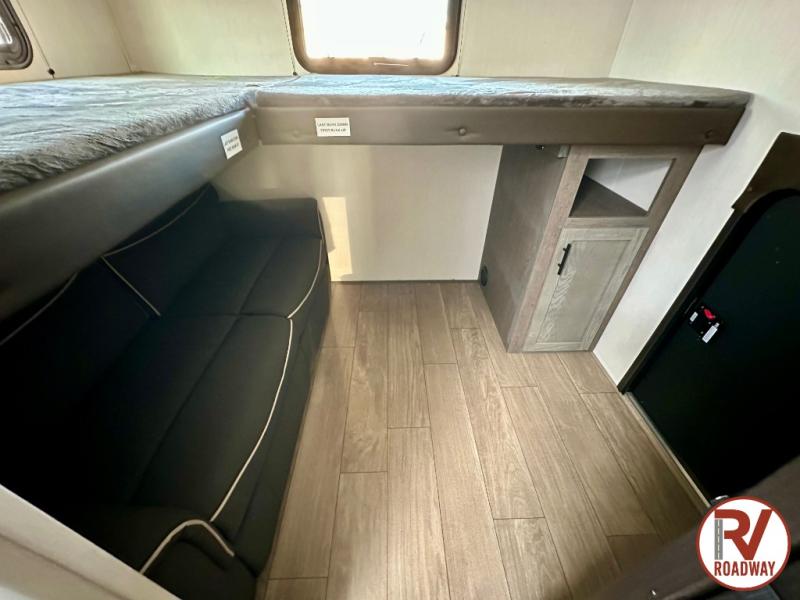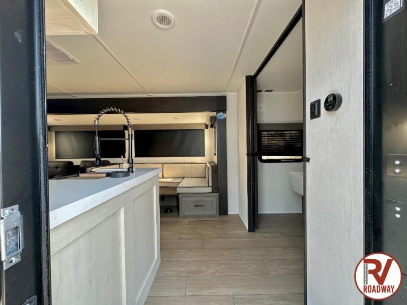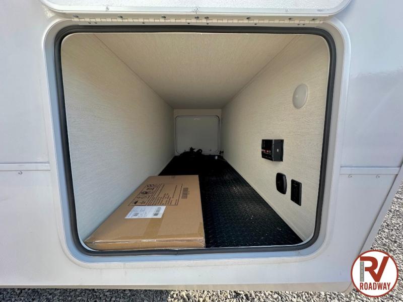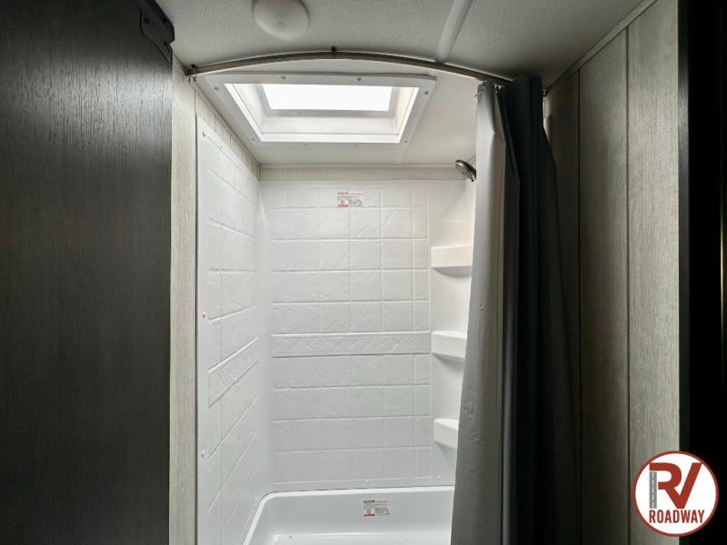 This stunning travel trailer is designed to provide comfort, luxury, and excitement on the open road. Starting with the two flip-up top bunk beds, perfect for kids or adults alike. The tri-fold sofa and jackknife sofa offer additional sleeping space or comfortable spots to lounge, making it easy to accommodate guests. The walk-through bathroom provides convenience and comfort, while the entertainment center with fireplace is a hub for fun and relaxation. Cozy up by the fire on chilly evenings and enjoy quality time with loved ones. The U-shaped dinette is ideal for meals or socializing, and the pantry, 12V refrigerator, microwave, and overhead cabinet ensure that you're well-equipped for cooking and storing food on the go. Featuring a spacious queen bed, convenient nightstands, stylish wardrobes, and overhead head cabinets for storing your belongings, this peaceful sanctuary is the perfect place to rest and recharge after a day of adventure.