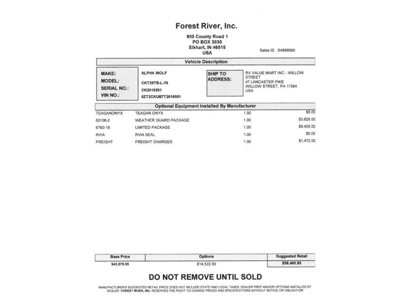 With any Cherokee Alpha Wolf travel trailer by Forest River you'll enjoy outstanding amenities, quality construction, and an affordable price. Each model features a "ToughBend" rigid skirt metal design, 5/8" tongue and groove plywood floor decking, and a "SuperTruss" roof structure that will hold up through years of camping memories. There is a pet friendly "clean sweep" floor design with no heat vents indoors, along with a super lumen lighting system, a 15,000 BTU quick cool central air conditioning, and many more comforts. There are many convenient exterior features such as, Leash Latch pet safety technology, an outside shower with hot and cold water, and exterior steps with oversized landing and quick release. The Weather Guard Package will add protection against the elements with an armored underbelly tank enclosure and forced air heat, thermo-control reflective safety glass windows, and upgraded laminated walls with block foam insulation!