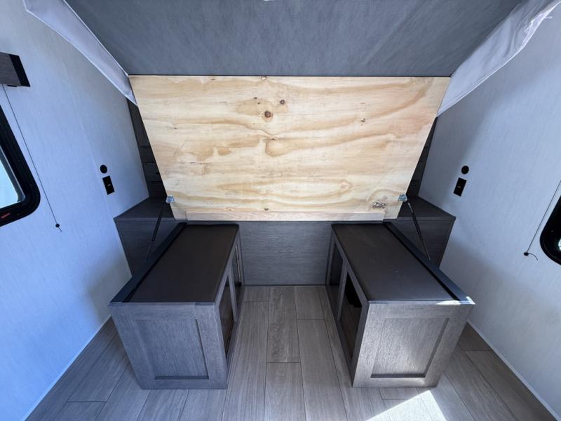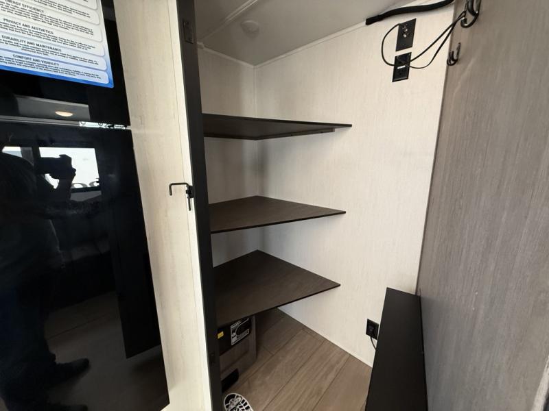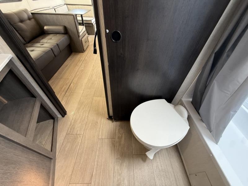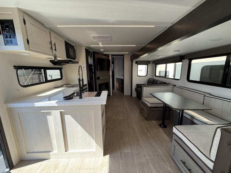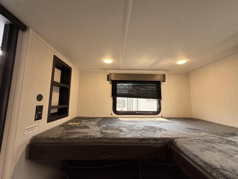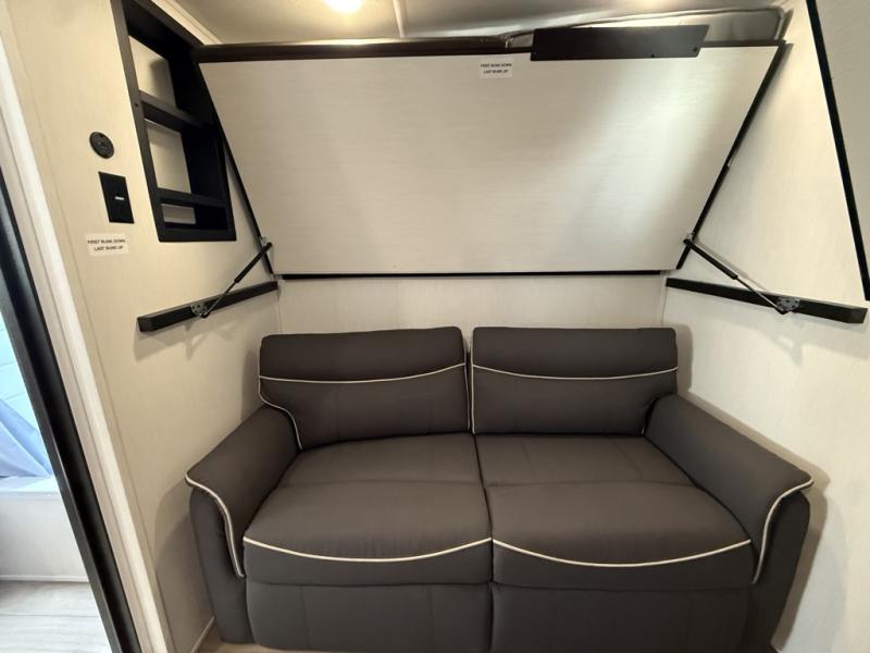 This stunning travel trailer is designed to provide comfort, luxury, and excitement on the open road. Starting with the two flip-up top bunk beds, perfect for kids or adults alike. The tri-fold sofa and jackknife sofa offer additional sleeping space or comfortable spots to lounge, making it easy to accommodate guests. The walk-through bathroom provides convenience and comfort, while the entertainment center with fireplace is a hub for fun and relaxation. Cozy up by the fire on chilly evenings and enjoy quality time with loved ones. The U-shaped dinette is ideal for meals or socializing, and the pantry, 12V refrigerator, microwave, and overhead cabinet ensure that you're well-equipped for cooking and storing food on the go. Featuring a spacious queen bed, convenient nightstands, stylish wardrobes, and overhead head cabinets for storing your belongings, this peaceful sanctuary is the perfect place to rest and recharge after a day of adventure.