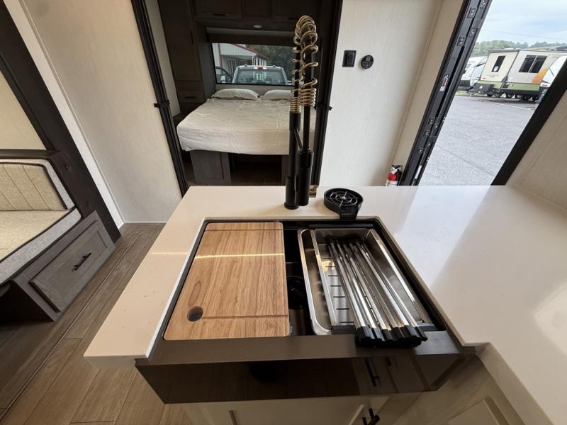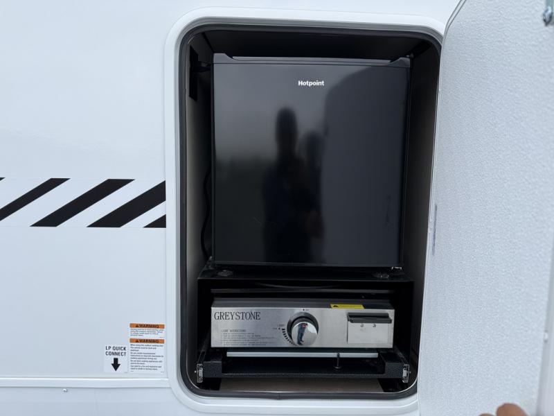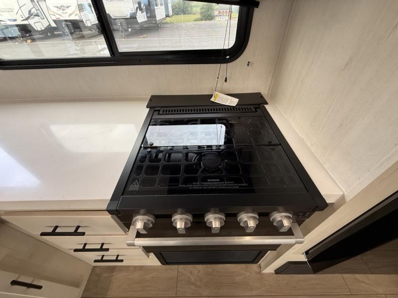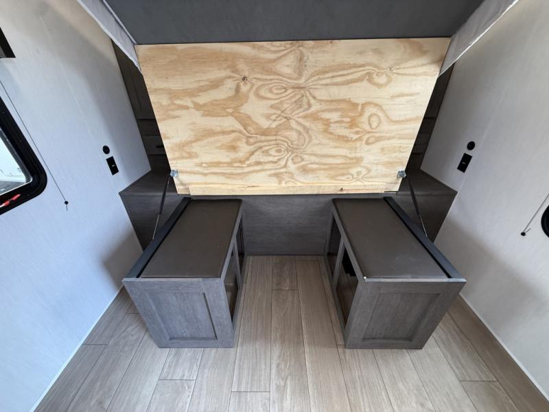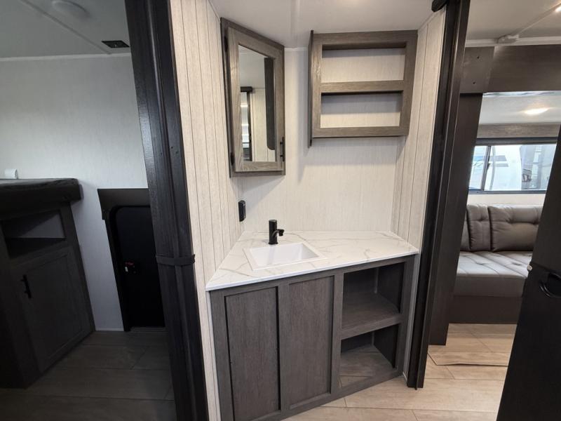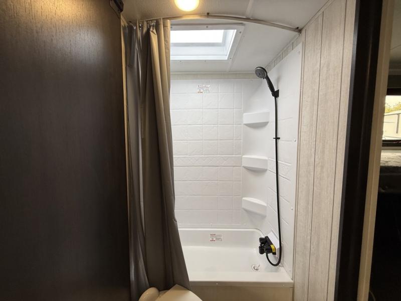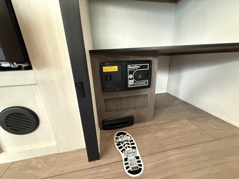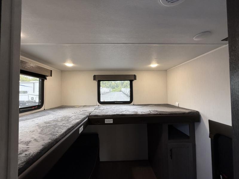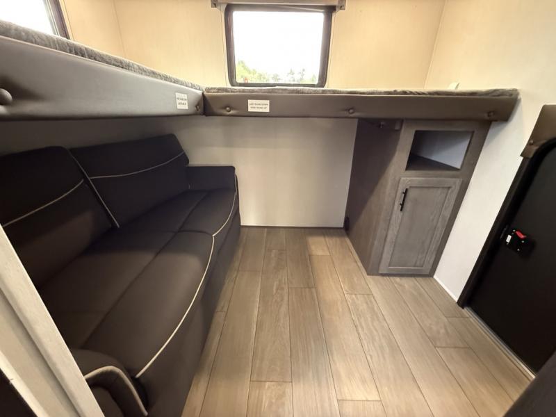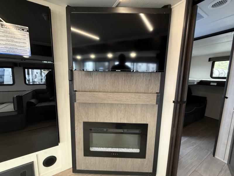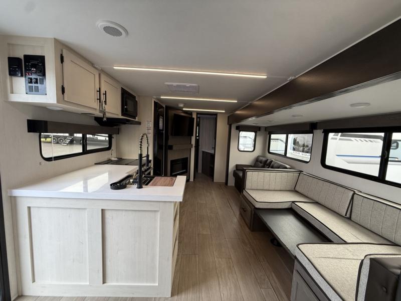 This stunning travel trailer is designed to provide comfort, luxury, and excitement on the open road. Starting with the two flip-up top bunk beds, perfect for kids or adults alike. The tri-fold sofa and jackknife sofa offer additional sleeping space or comfortable spots to lounge, making it easy to accommodate guests. The walk-through bathroom provides convenience and comfort, while the entertainment center with fireplace is a hub for fun and relaxation. Cozy up by the fire on chilly evenings and enjoy quality time with loved ones. The U-shaped dinette is ideal for meals or socializing, and the pantry, 12V refrigerator, microwave, and overhead cabinet ensure that you're well-equipped for cooking and storing food on the go. Featuring a spacious queen bed, convenient nightstands, stylish wardrobes, and overhead head cabinets for storing your belongings, this peaceful sanctuary is the perfect place to rest and recharge after a day of adventure.