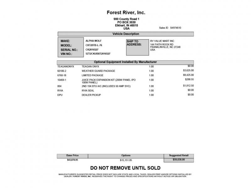 With any Cherokee Alpha Wolf travel trailer by Forest River you'll enjoy outstanding amenities, quality construction, and an affordable price. Each model features a "ToughBend" rigid skirt metal design, 5/8" tongue and groove plywood floor decking, and a "SuperTruss" roof structure that will hold up through years of camping memories. There is a pet friendly "clean sweep" floor design with no heat vents indoors, along with a super lumen lighting system, a 15,000 BTU quick cool central air conditioning, and many more comforts. There are many convenient exterior features such as, Leash Latch pet safety technology, an outside shower with hot and cold water, and exterior steps with oversized landing and quick release. The Weather Guard Package will add protection against the elements with an armored underbelly tank enclosure and forced air heat, thermo-control reflective safety glass windows, and upgraded laminated walls with block foam insulation!