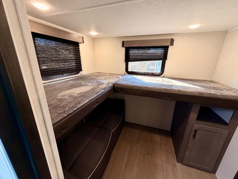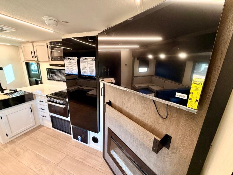 This stunning travel trailer is designed to provide comfort, luxury, and excitement on the open road. Starting with the two flip-up top bunk beds, perfect for kids or adults alike. The tri-fold sofa and jackknife sofa offer additional sleeping space or comfortable spots to lounge, making it easy to accommodate guests. The walk-through bathroom provides convenience and comfort, while the entertainment center with fireplace is a hub for fun and relaxation. Cozy up by the fire on chilly evenings and enjoy quality time with loved ones. The U-shaped dinette is ideal for meals or socializing, and the pantry, 12V refrigerator, microwave, and overhead cabinet ensure that you're well-equipped for cooking and storing food on the go. Featuring a spacious queen bed, convenient nightstands, stylish wardrobes, and overhead head cabinets for storing your belongings, this peaceful sanctuary is the perfect place to rest and recharge after a day of adventure.