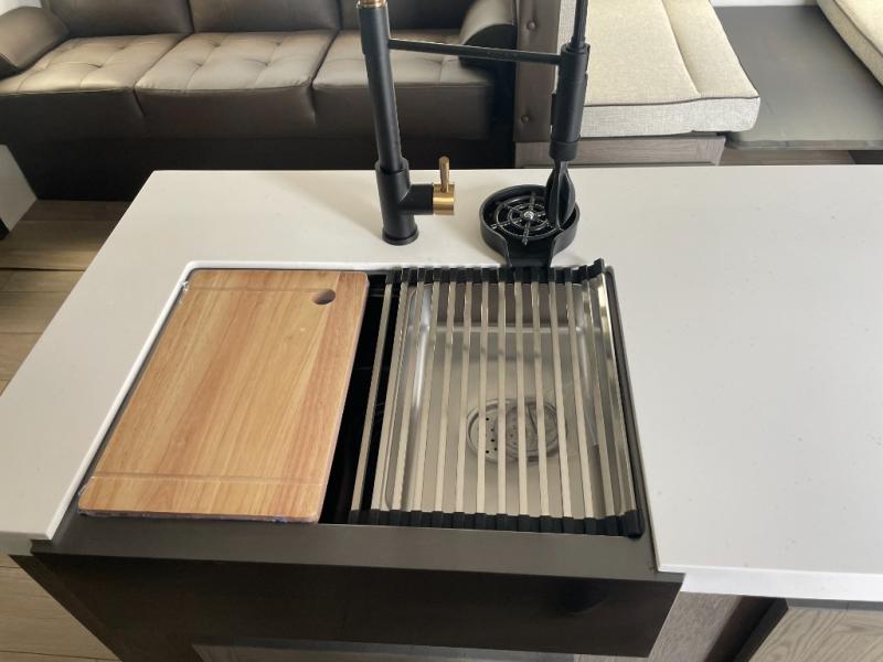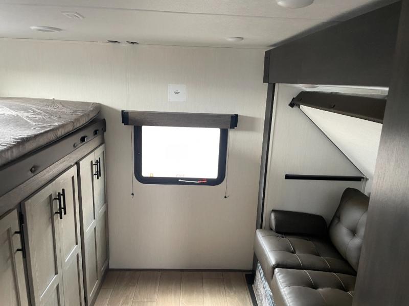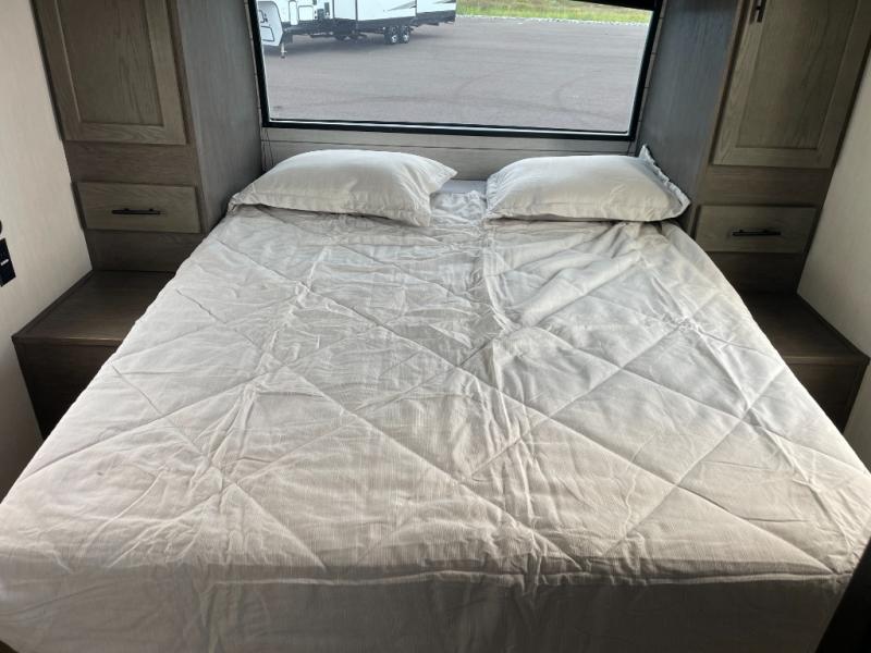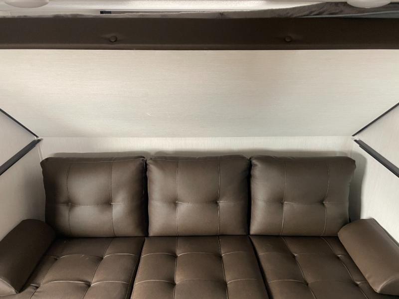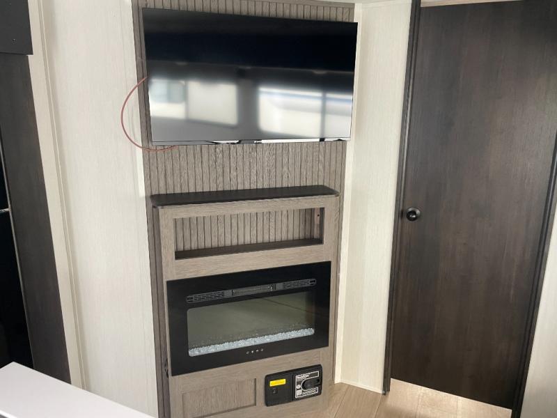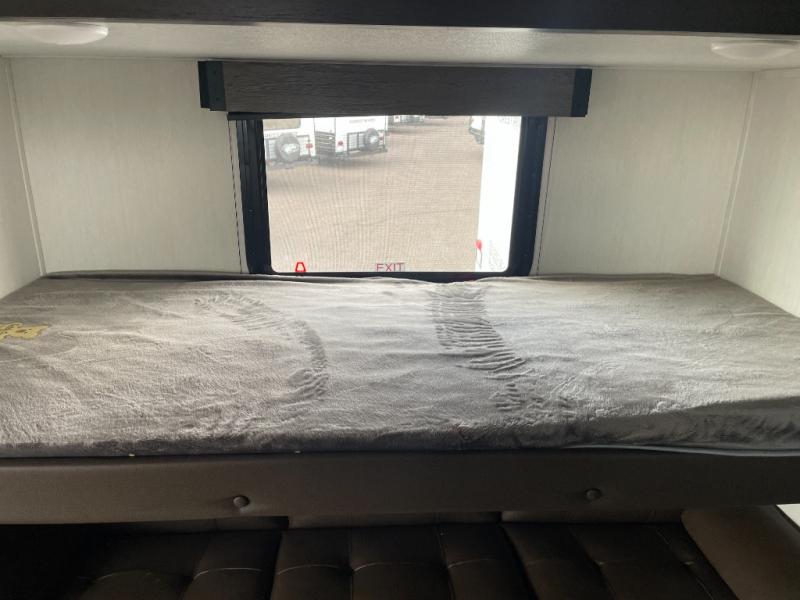 Load up your clothes, food, and outdoor gear to enjoy a long weekend away from the city in this travel trailer! There are triple slide outs, a private bunkhouse with a half bathroom with a second exterior entry/door for convenience, plus an outside kitchen, complete with ice! The bunkhouse also has two bunks, a jackknife sofa and a trundle bed, plus a slide out for more interior floor space. The main living and kitchen area is spacious as well with two opposing slides, a kitchen island with a large sink, a pantry, plus a cozy fireplace. The full walk-through bathroom allows double access, and the front bedroom allows you to sleep like royalty.