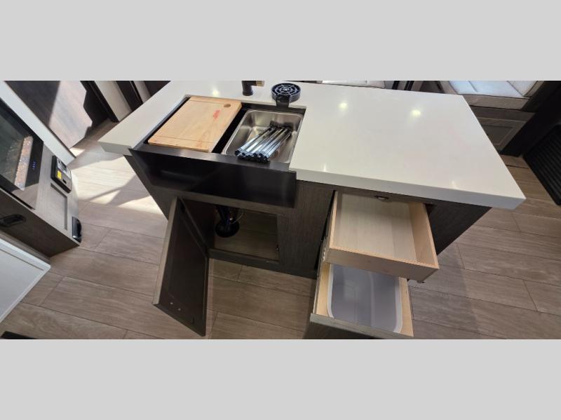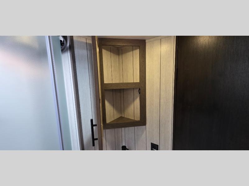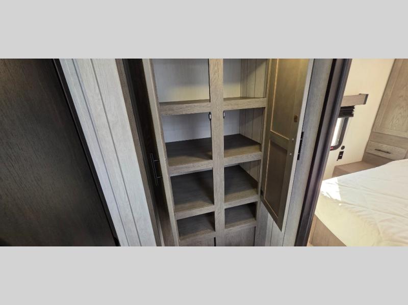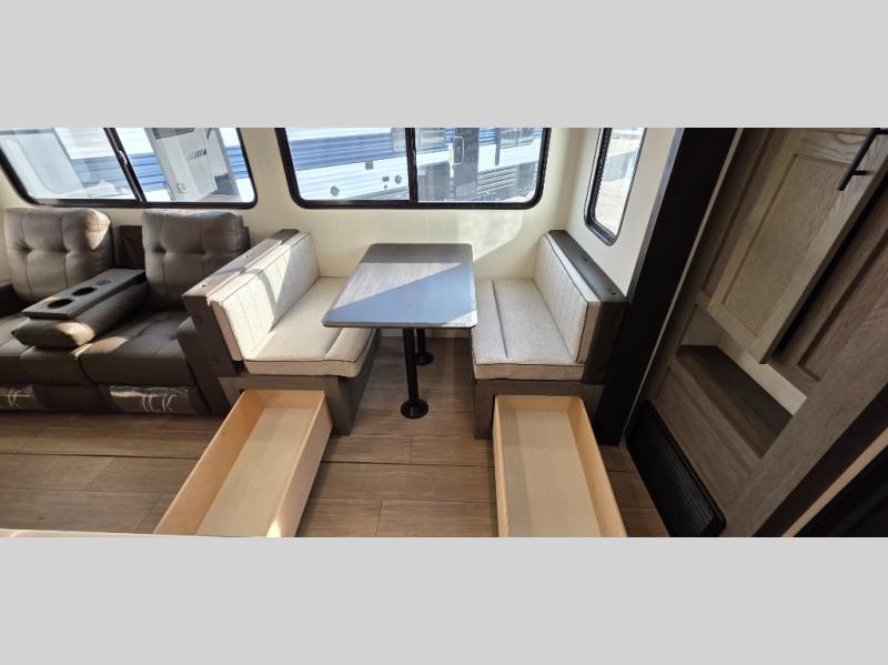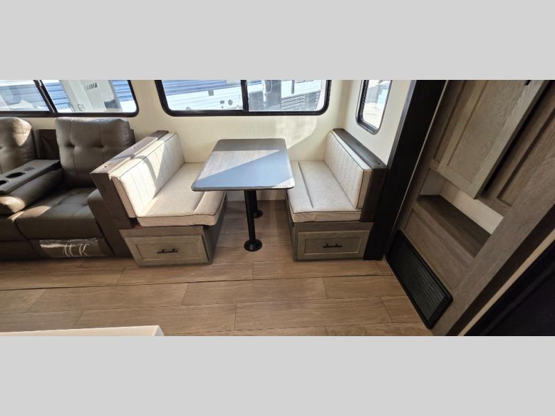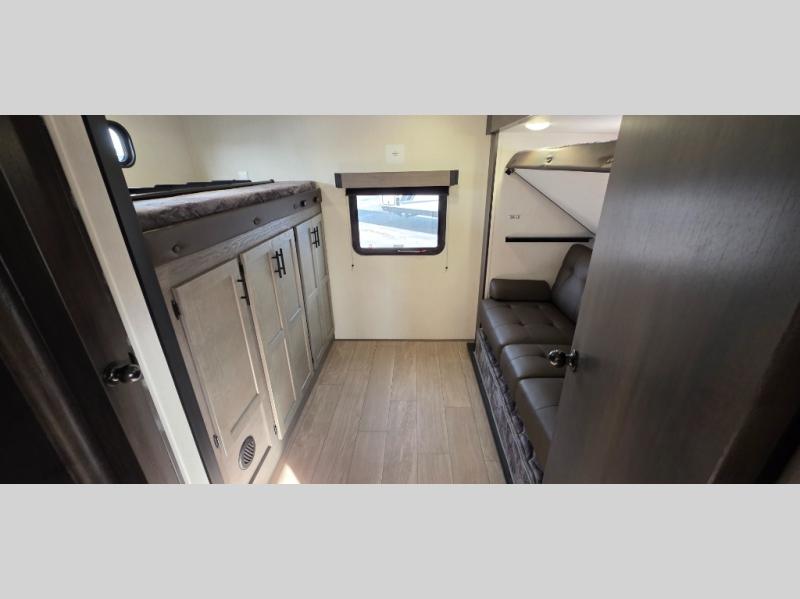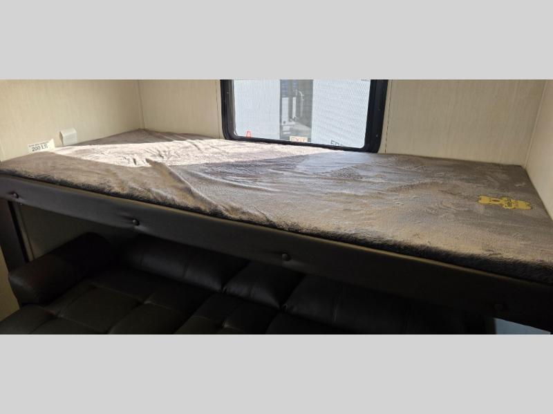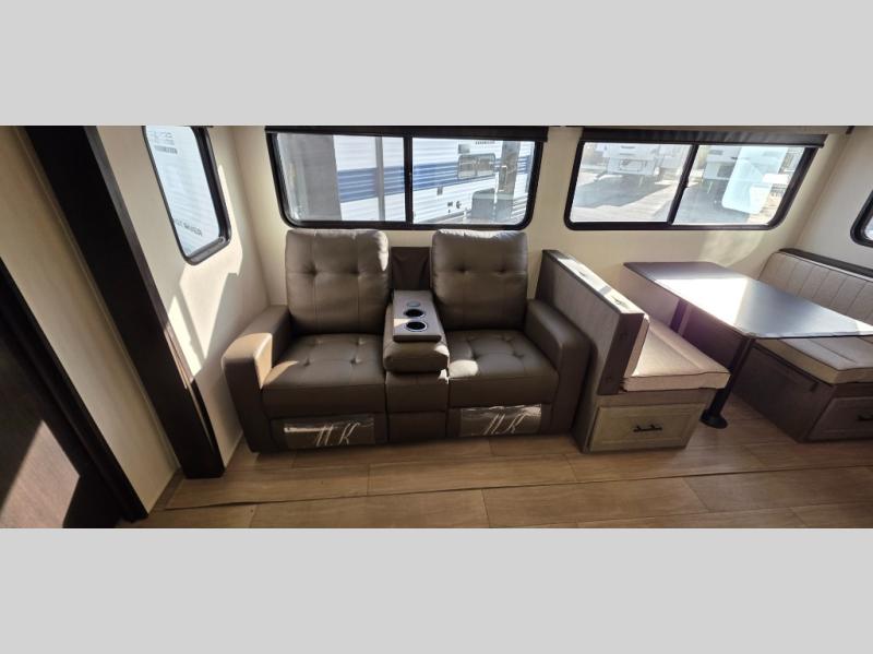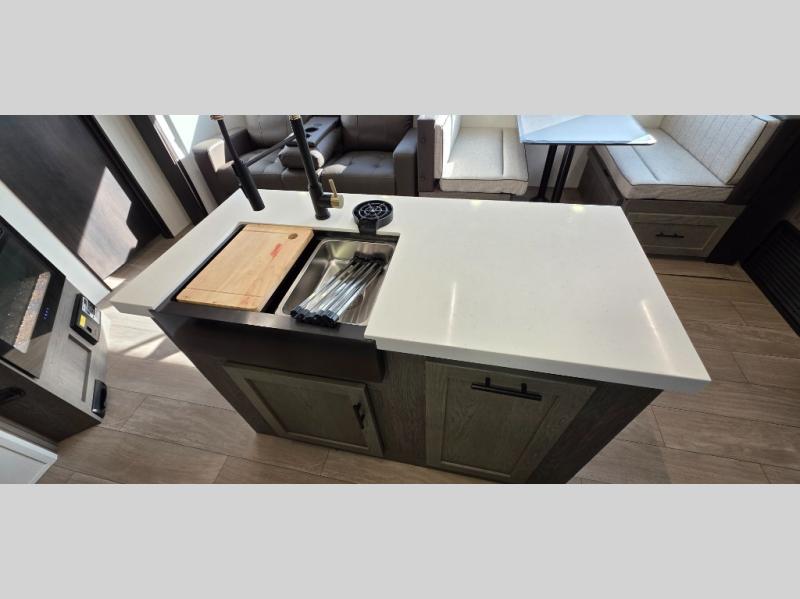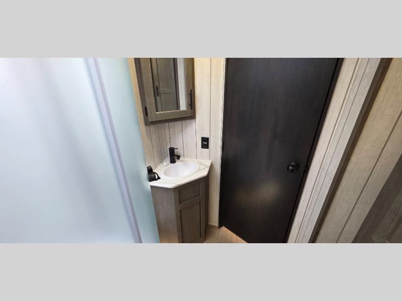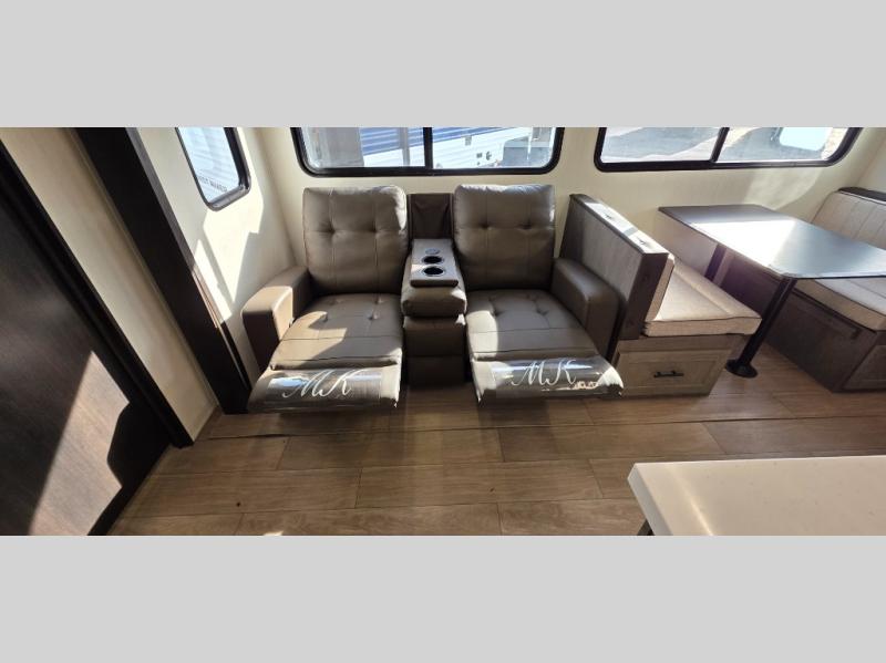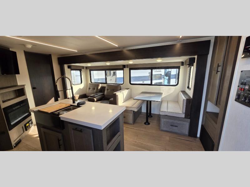 Load up your clothes, food, and outdoor gear to enjoy a long weekend away from the city in this travel trailer! There are triple slide outs, a private bunkhouse with a half bathroom with a second exterior entry/door for convenience, plus an outside kitchen, complete with ice! The bunkhouse also has two bunks, a jackknife sofa and a trundle bed, plus a slide out for more interior floor space. The main living and kitchen area is spacious as well with two opposing slides, a kitchen island with a large sink, a pantry, plus a cozy fireplace. The full walk-through bathroom allows double access, and the front bedroom allows you to sleep like royalty.