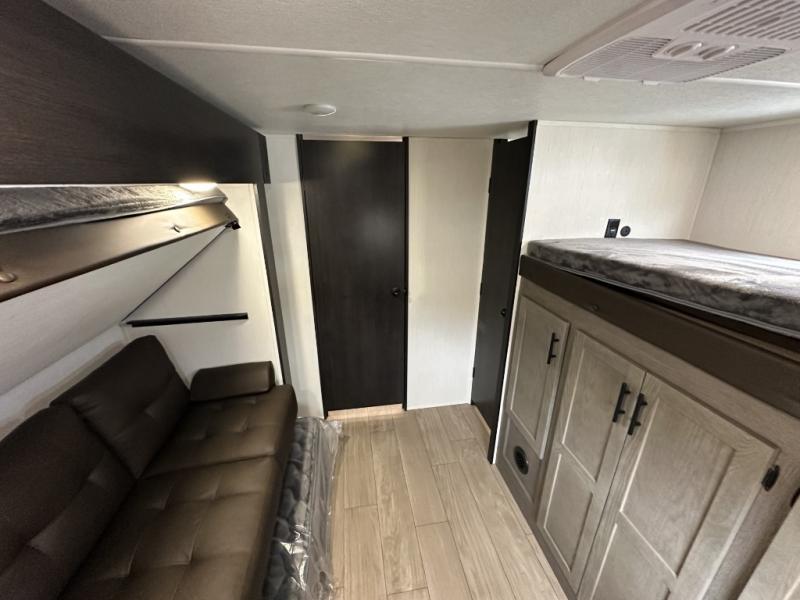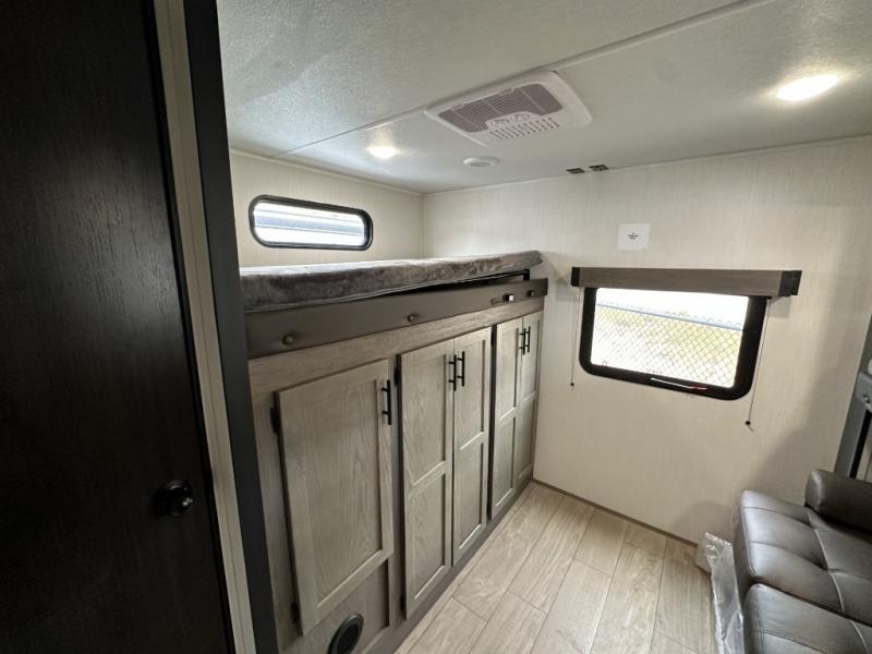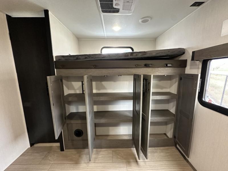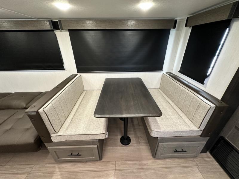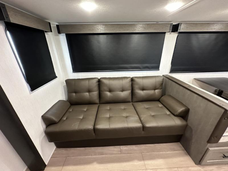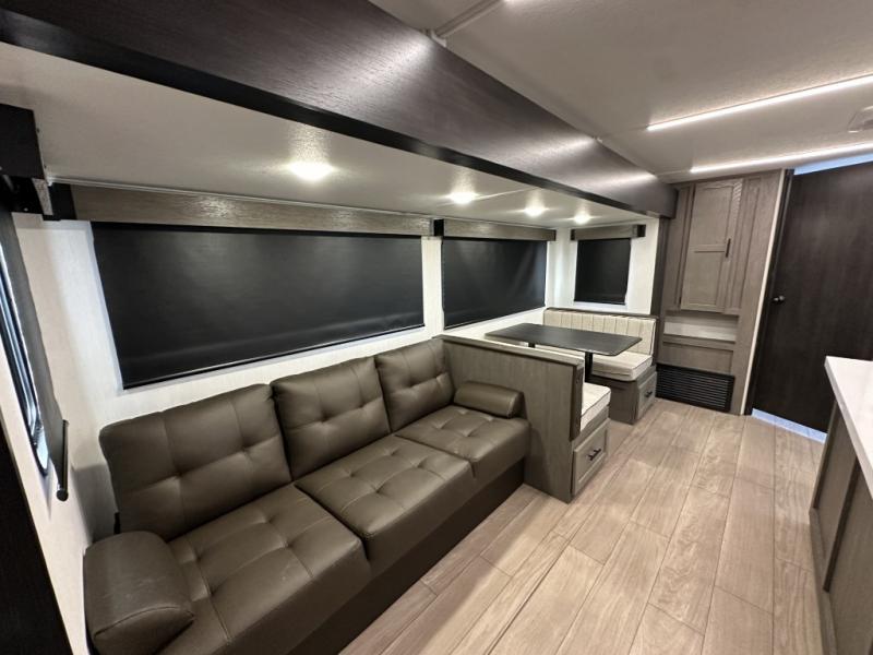 Load up your clothes, food, and outdoor gear to enjoy a long weekend away from the city in this travel trailer! There are triple slide outs, a private bunkhouse with a half bathroom with a second exterior entry/door for convenience, plus an outside kitchen, complete with ice! The bunkhouse also has two bunks, a jackknife sofa and a trundle bed, plus a slide out for more interior floor space. The main living and kitchen area is spacious as well with two opposing slides, a kitchen island with a large sink, a pantry, plus a cozy fireplace. The full walk-through bathroom allows double access, and the front bedroom allows you to sleep like royalty.