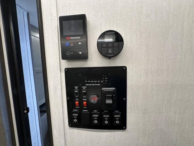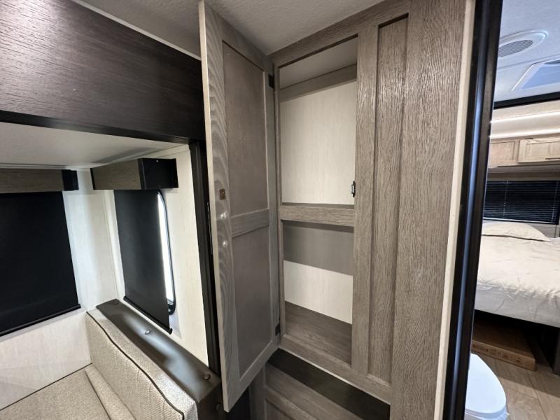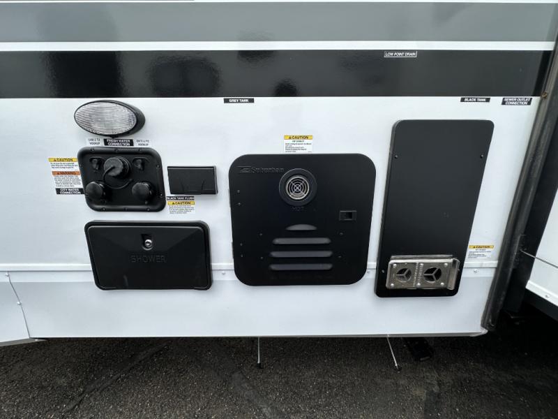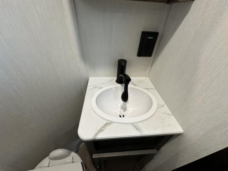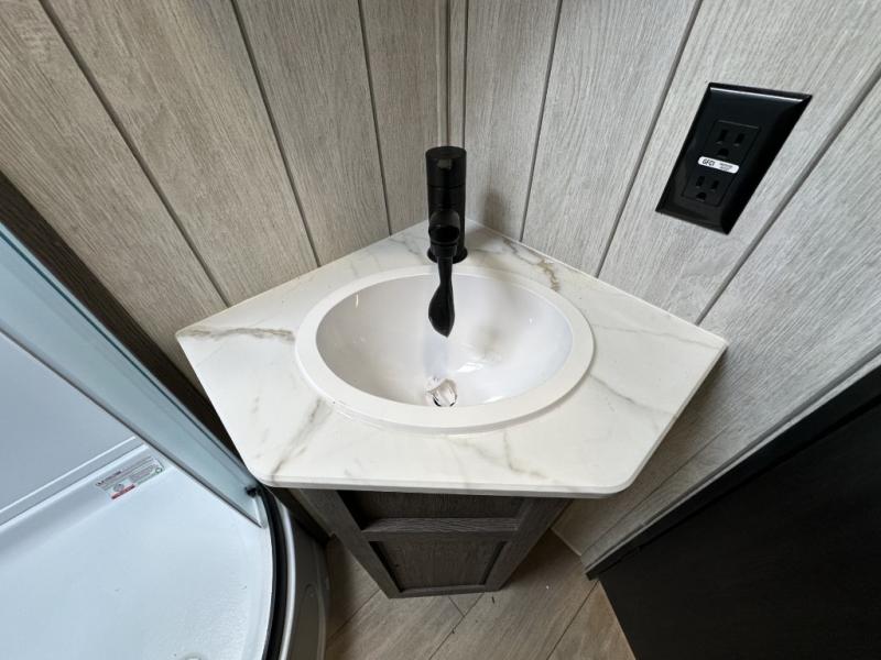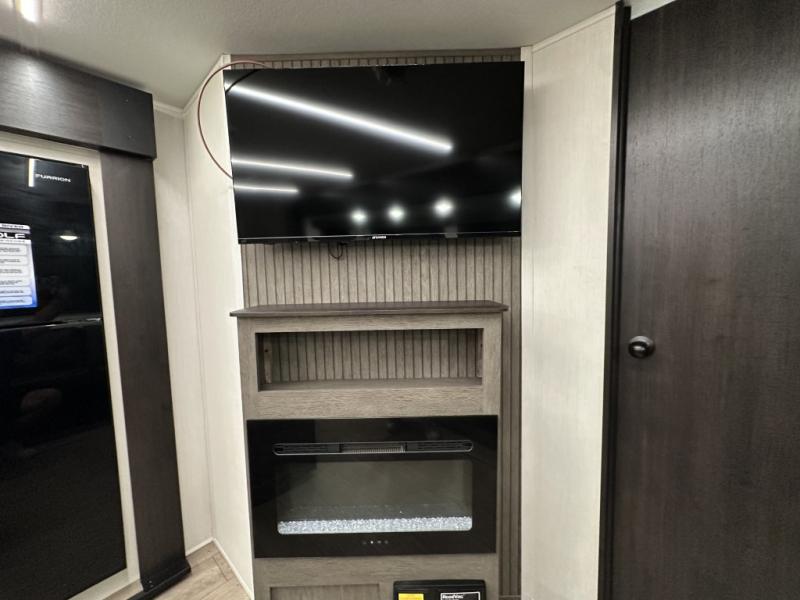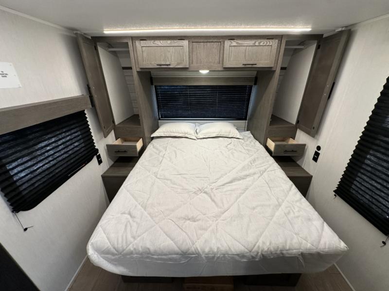 Load up your clothes, food, and outdoor gear to enjoy a long weekend away from the city in this travel trailer! There are triple slide outs, a private bunkhouse with a half bathroom with a second exterior entry/door for convenience, plus an outside kitchen, complete with ice! The bunkhouse also has two bunks, a jackknife sofa and a trundle bed, plus a slide out for more interior floor space. The main living and kitchen area is spacious as well with two opposing slides, a kitchen island with a large sink, a pantry, plus a cozy fireplace. The full walk-through bathroom allows double access, and the front bedroom allows you to sleep like royalty.