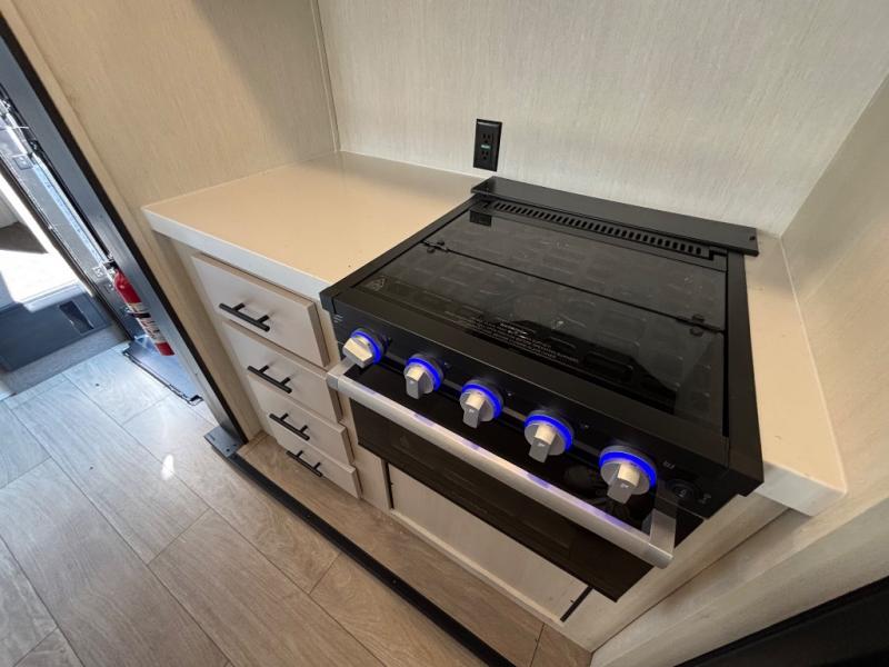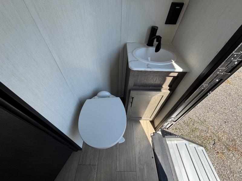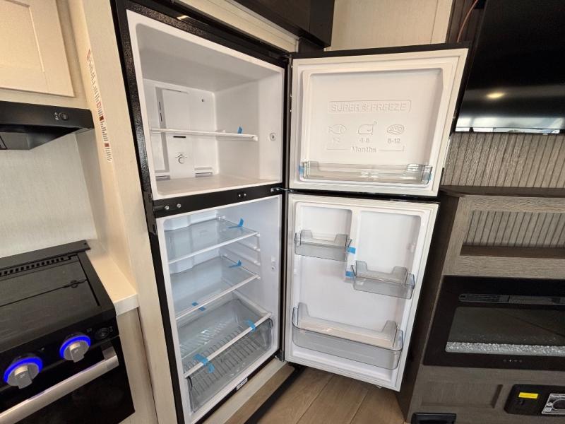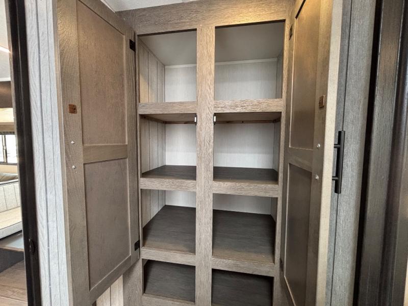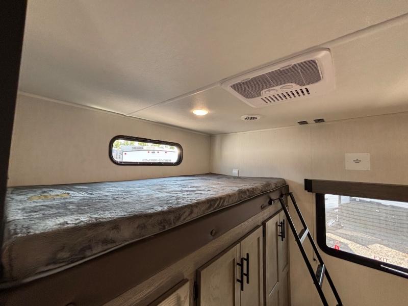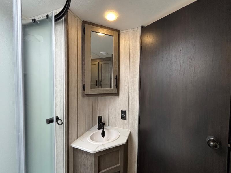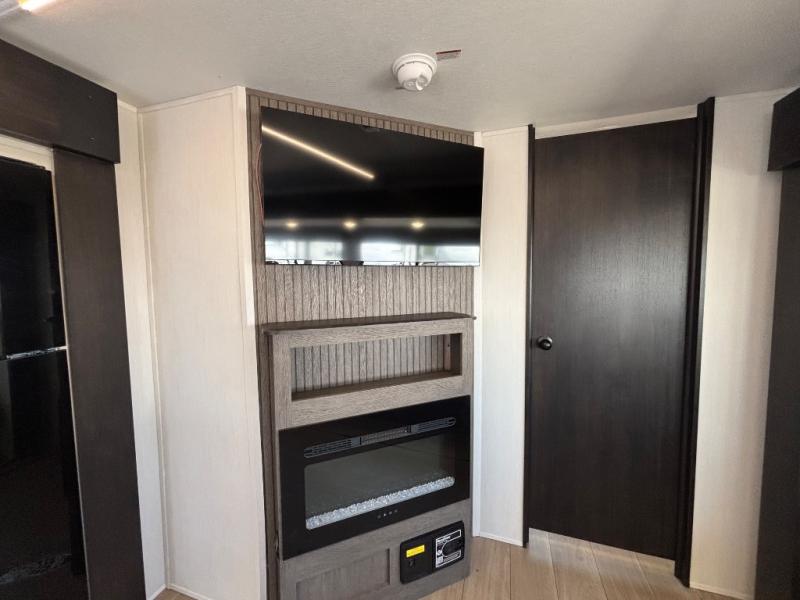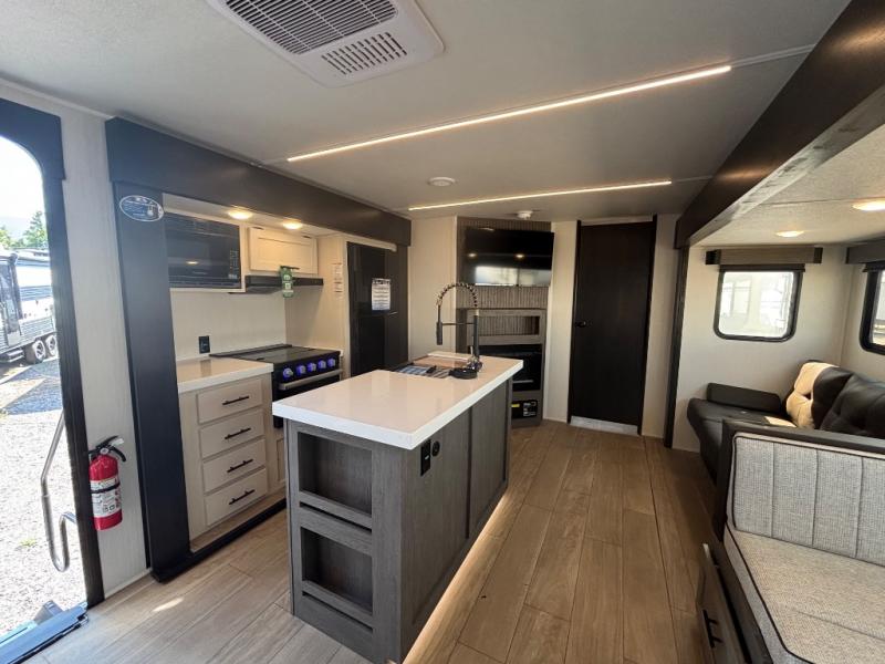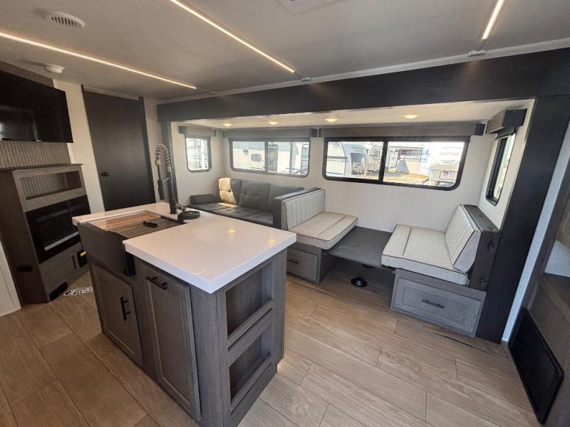Load up your clothes, food, and outdoor gear to enjoy a long weekend away from the city in this travel trailer! There are triple slide outs, a private bunkhouse with a half bathroom with a second exterior entry/door for convenience, plus an outside kitchen, complete with ice! The bunkhouse also has two bunks, a jackknife sofa and a trundle bed, plus a slide out for more interior floor space. The main living and kitchen area is spacious as well with two opposing slides, a kitchen island with a large sink, a pantry, plus a cozy fireplace. The full walk-through bathroom allows double access, and the front bedroom allows you to sleep like royalty.