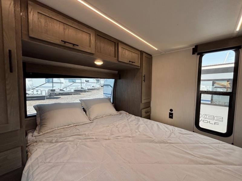With any Cherokee Alpha Wolf travel trailer by Forest River you'll enjoy outstanding amenities, quality construction, and an affordable price. Each model features a "ToughBend" rigid skirt metal design, 5/8" tongue and groove plywood floor decking, and a "SuperTruss" roof structure that will hold up through years of camping memories. There is a pet friendly "clean sweep" floor design with no heat vents indoors, along with a super lumen lighting system, a 15,000 BTU quick cool central air conditioning, and many more comforts. There are many convenient exterior features such as, Leash Latch pet safety technology, an outside shower with hot and cold water, and exterior steps with oversized landing and quick release. The Weather Guard Package will add protection against the elements with an armored underbelly tank enclosure and forced air heat, thermo-control reflective safety glass windows, and upgraded laminated walls with block foam insulation!
