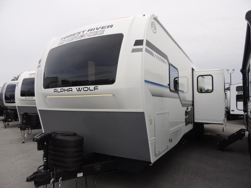 With any Cherokee Alpha Wolf travel trailer by Forest River you'll enjoy outstanding amenities, quality construction, and an affordable price. Each model features a "ToughBend" rigid skirt metal design, 5/8" tongue and groove plywood floor decking, and a "SuperTruss" roof structure that will hold up through years of camping memories. There is a pet friendly "clean sweep" floor design with no heat vents indoors, along with a super lumen lighting system, a 15,000 BTU quick cool central air conditioning, and many more comforts. There are many convenient exterior features such as, Leash Latch pet safety technology, an outside shower with hot and cold water, and exterior steps with oversized landing and quick release. The Weather Guard Package will add protection against the elements with an armored underbelly tank enclosure and forced air heat, thermo-control reflective safety glass windows, and upgraded laminated walls with block foam insulation!