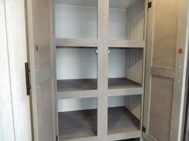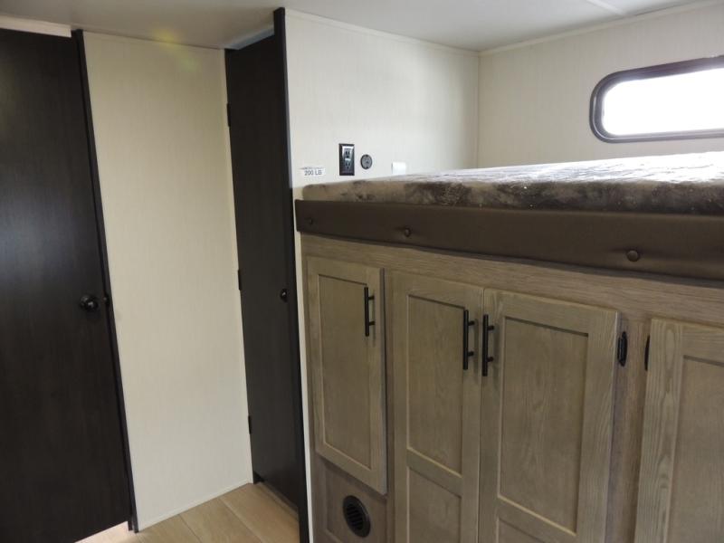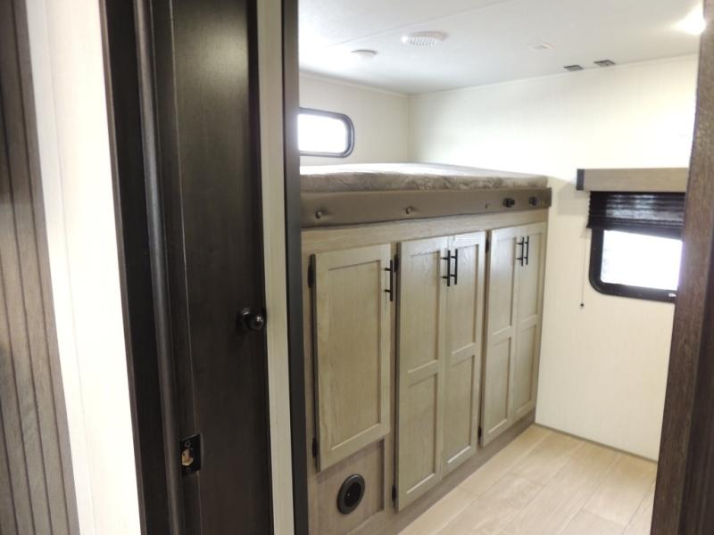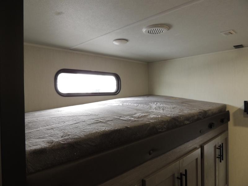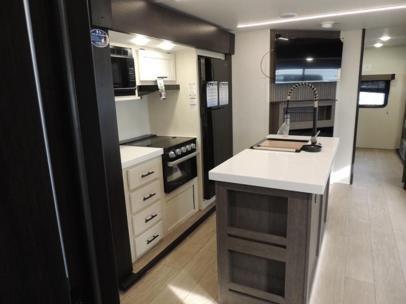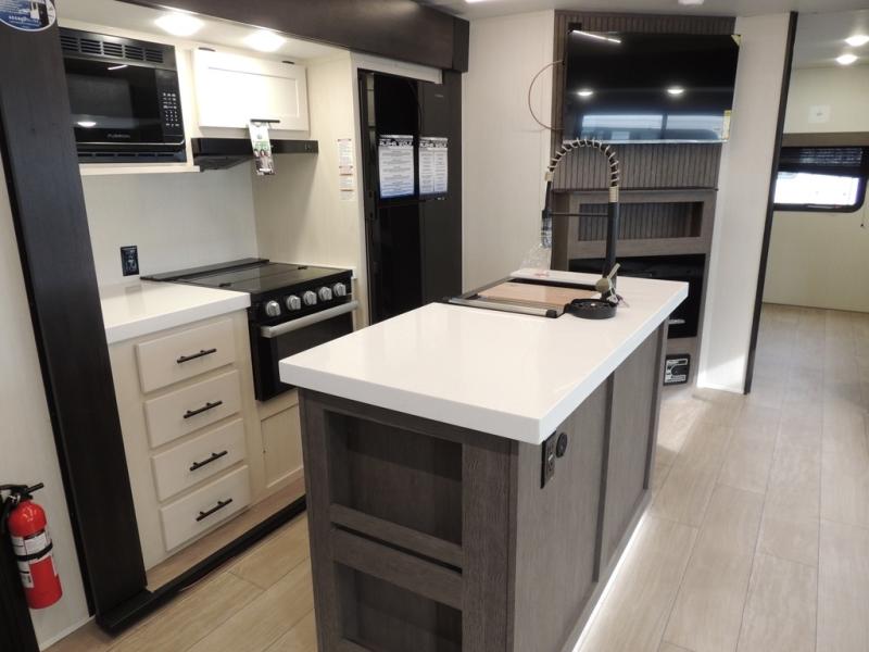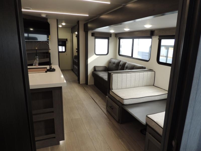 Load up your clothes, food, and outdoor gear to enjoy a long weekend away from the city in this travel trailer! There are triple slide outs, a private bunkhouse with a half bathroom with a second exterior entry/door for convenience, plus an outside kitchen, complete with ice! The bunkhouse also has two bunks, a jackknife sofa and a trundle bed, plus a slide out for more interior floor space. The main living and kitchen area is spacious as well with two opposing slides, a kitchen island with a large sink, a pantry, plus a cozy fireplace. The full walk-through bathroom allows double access, and the front bedroom allows you to sleep like royalty.