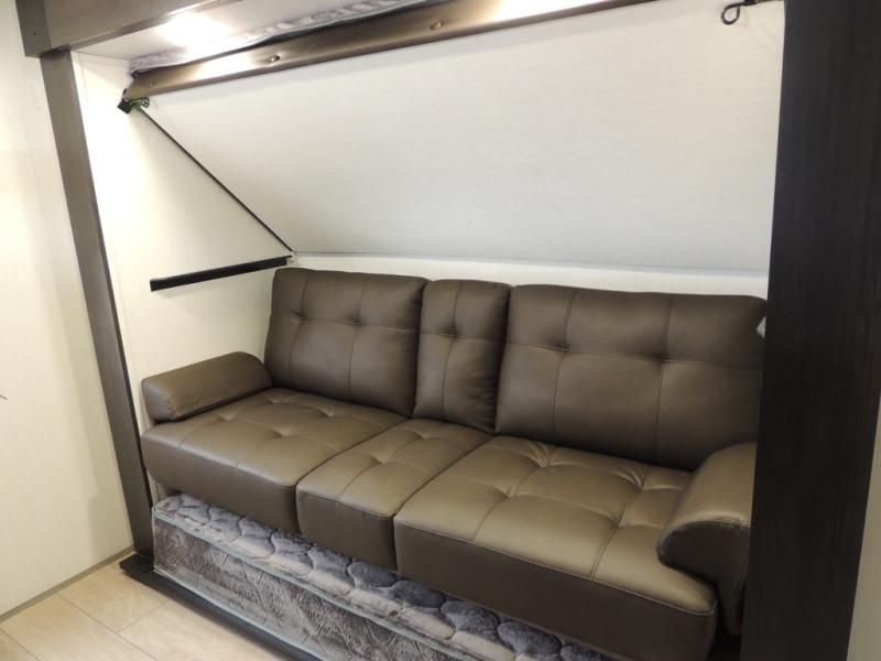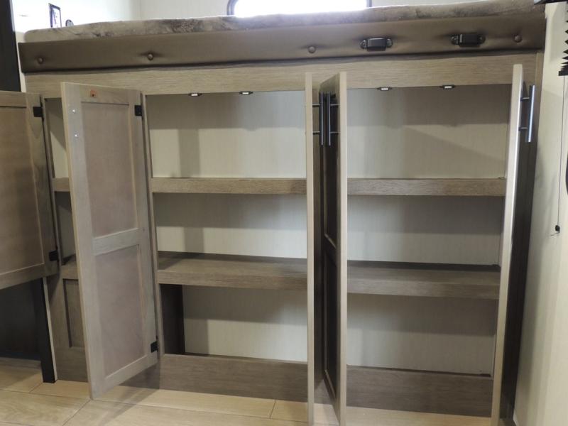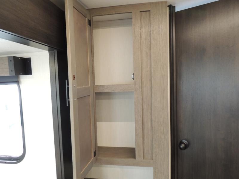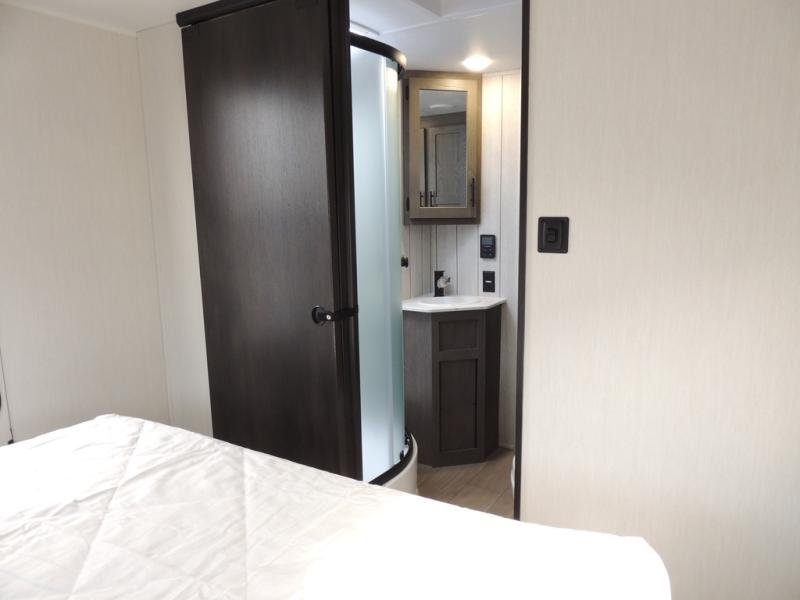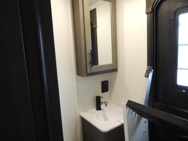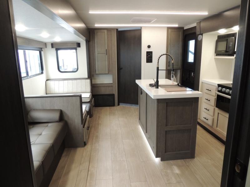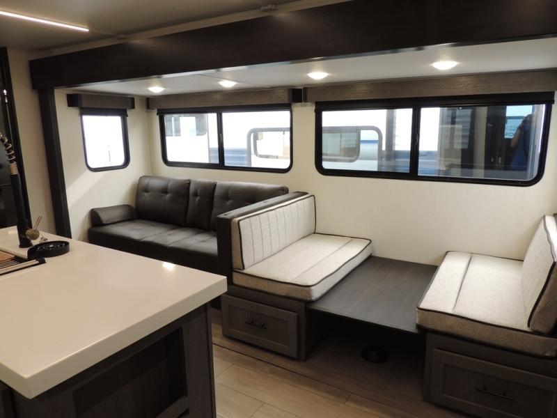 Load up your clothes, food, and outdoor gear to enjoy a long weekend away from the city in this travel trailer! There are triple slide outs, a private bunkhouse with a half bathroom with a second exterior entry/door for convenience, plus an outside kitchen, complete with ice! The bunkhouse also has two bunks, a jackknife sofa and a trundle bed, plus a slide out for more interior floor space. The main living and kitchen area is spacious as well with two opposing slides, a kitchen island with a large sink, a pantry, plus a cozy fireplace. The full walk-through bathroom allows double access, and the front bedroom allows you to sleep like royalty.