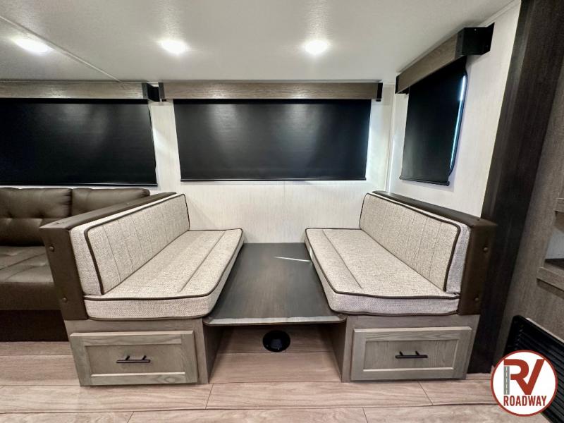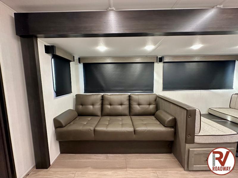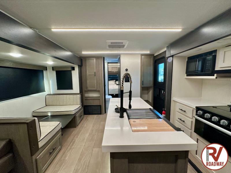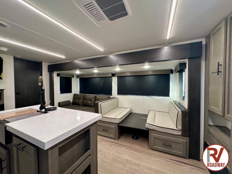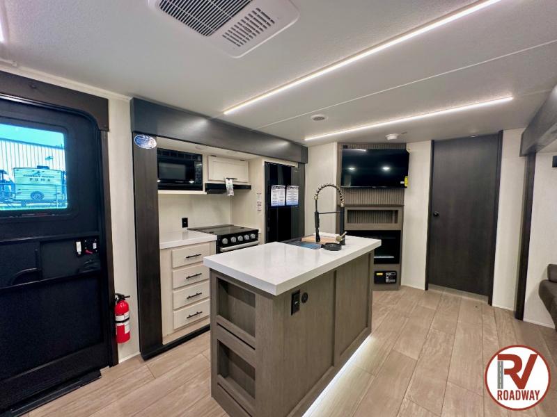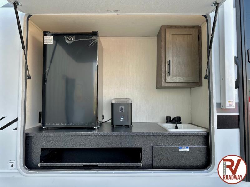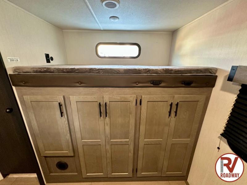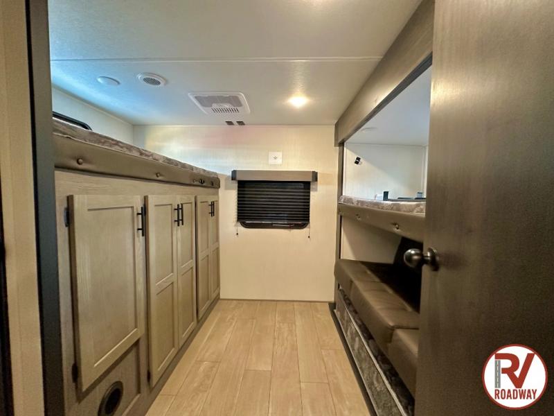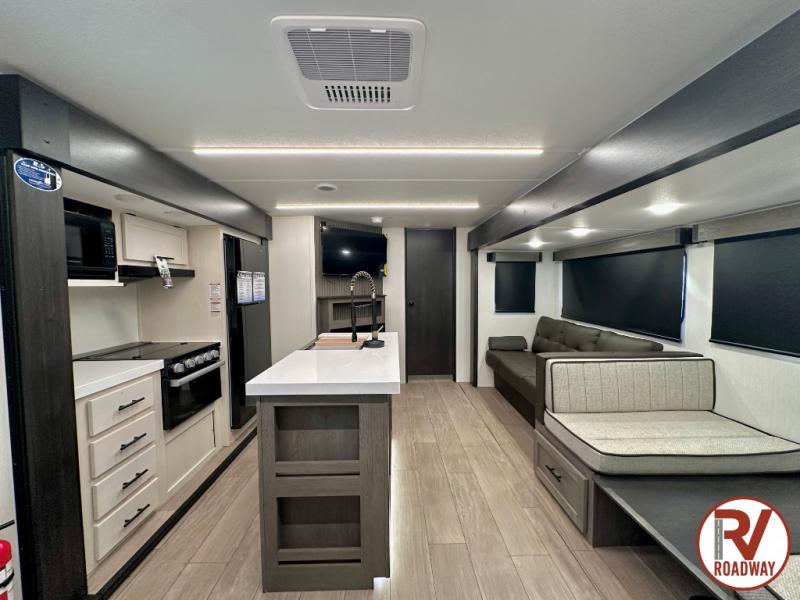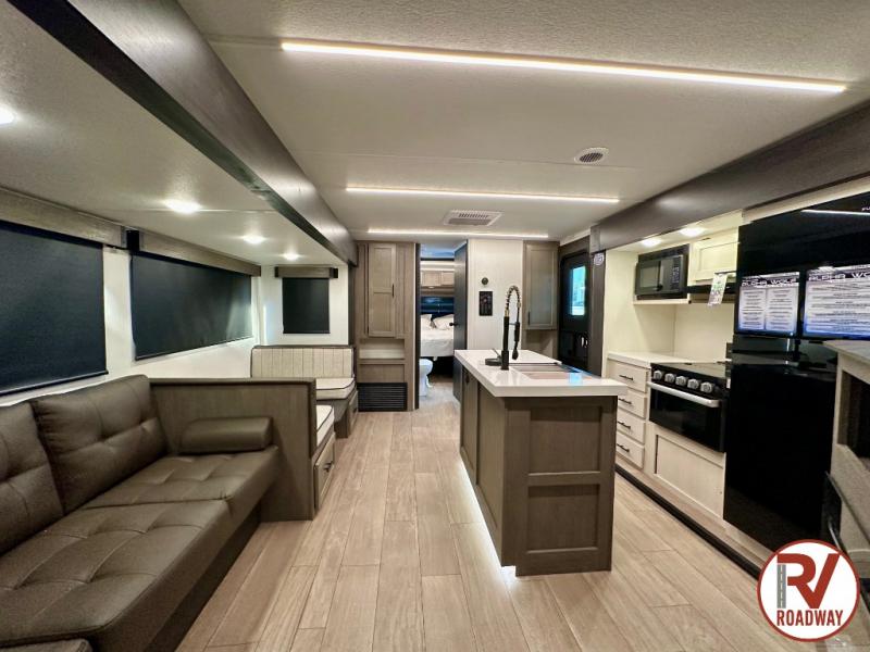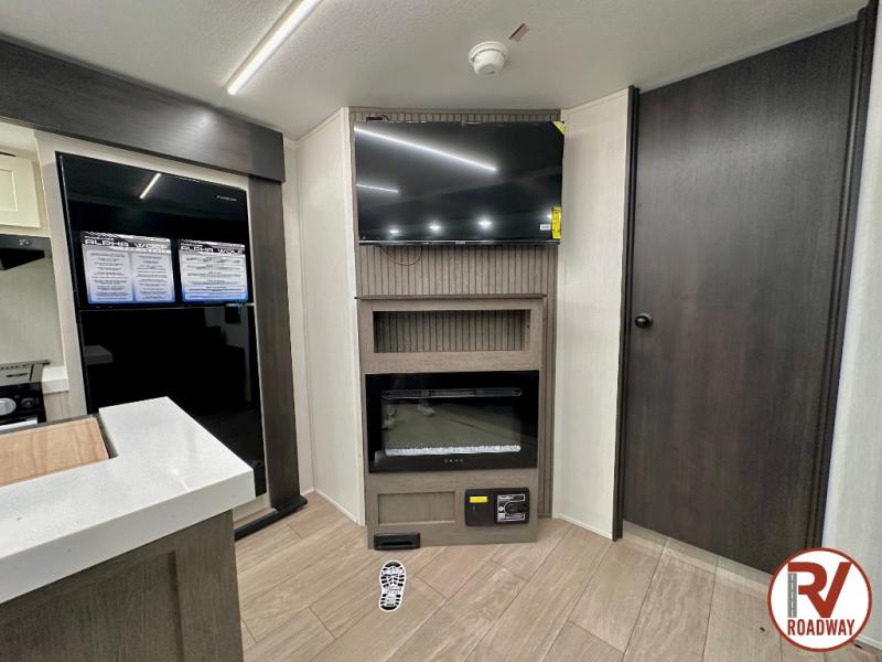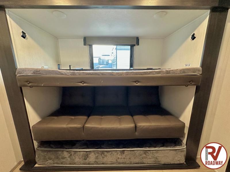 Load up your clothes, food, and outdoor gear to enjoy a long weekend away from the city in this travel trailer! There are triple slide outs, a private bunkhouse with a half bathroom with a second exterior entry/door for convenience, plus an outside kitchen, complete with ice! The bunkhouse also has two bunks, a jackknife sofa and a trundle bed, plus a slide out for more interior floor space. The main living and kitchen area is spacious as well with two opposing slides, a kitchen island with a large sink, a pantry, plus a cozy fireplace. The full walk-through bathroom allows double access, and the front bedroom allows you to sleep like royalty.