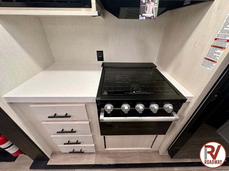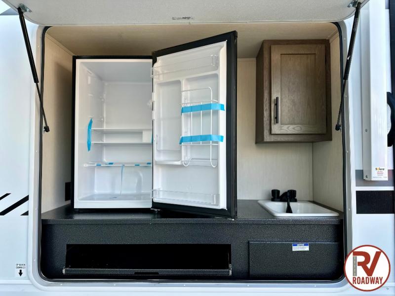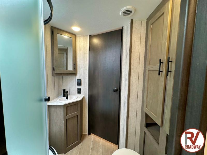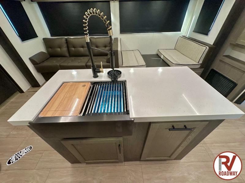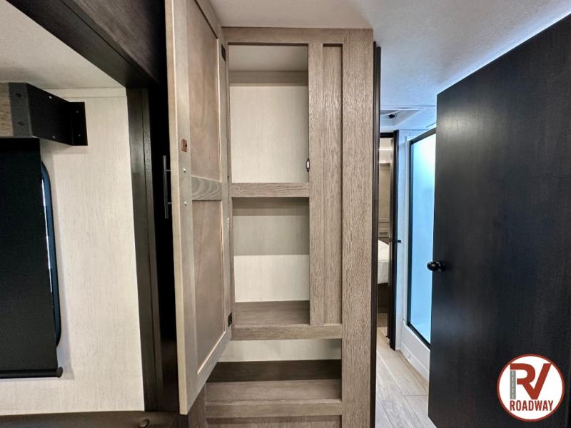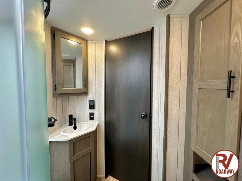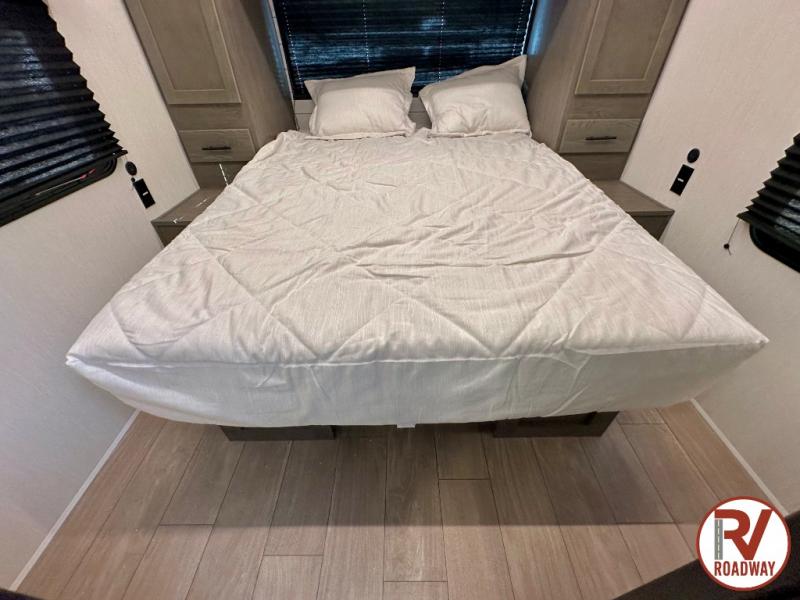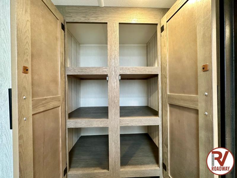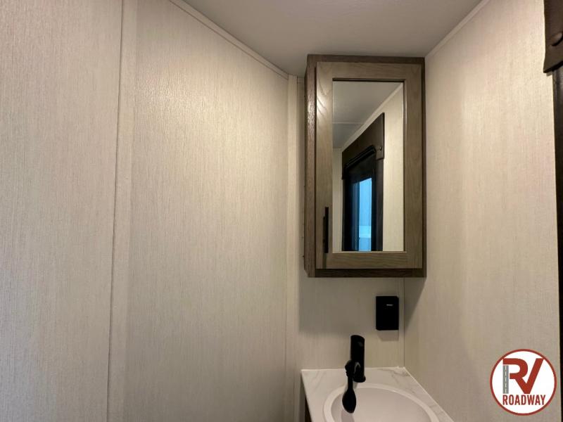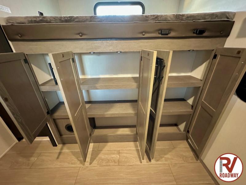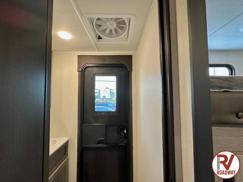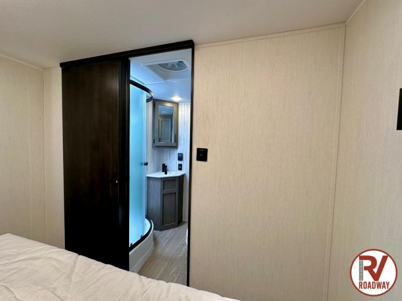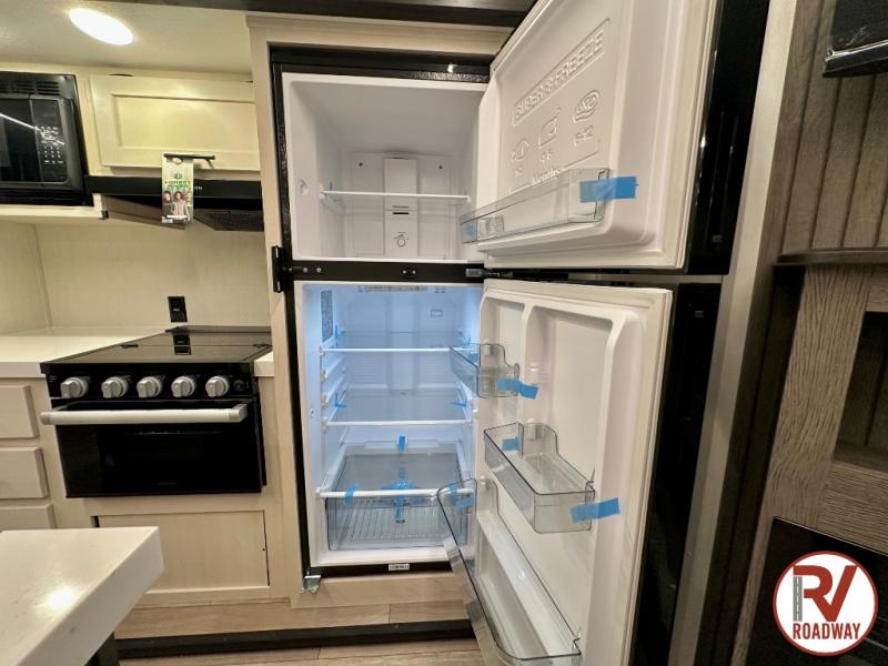Load up your clothes, food, and outdoor gear to enjoy a long weekend away from the city in this travel trailer! There are triple slide outs, a private bunkhouse with a half bathroom with a second exterior entry/door for convenience, plus an outside kitchen, complete with ice! The bunkhouse also has two bunks, a jackknife sofa and a trundle bed, plus a slide out for more interior floor space. The main living and kitchen area is spacious as well with two opposing slides, a kitchen island with a large sink, a pantry, plus a cozy fireplace. The full walk-through bathroom allows double access, and the front bedroom allows you to sleep like royalty.