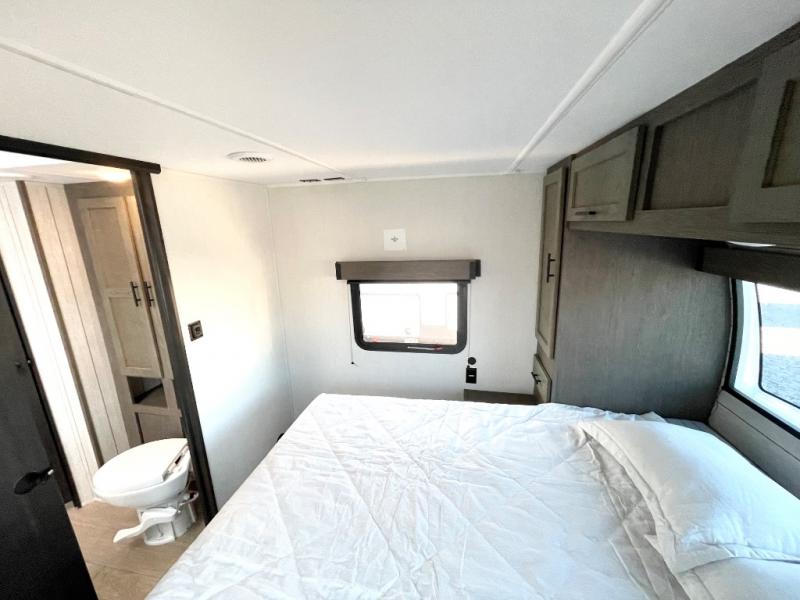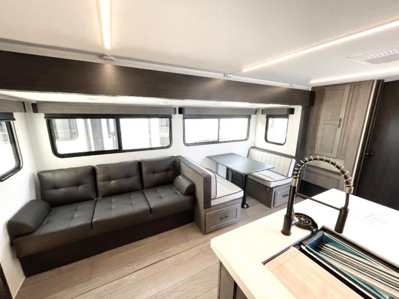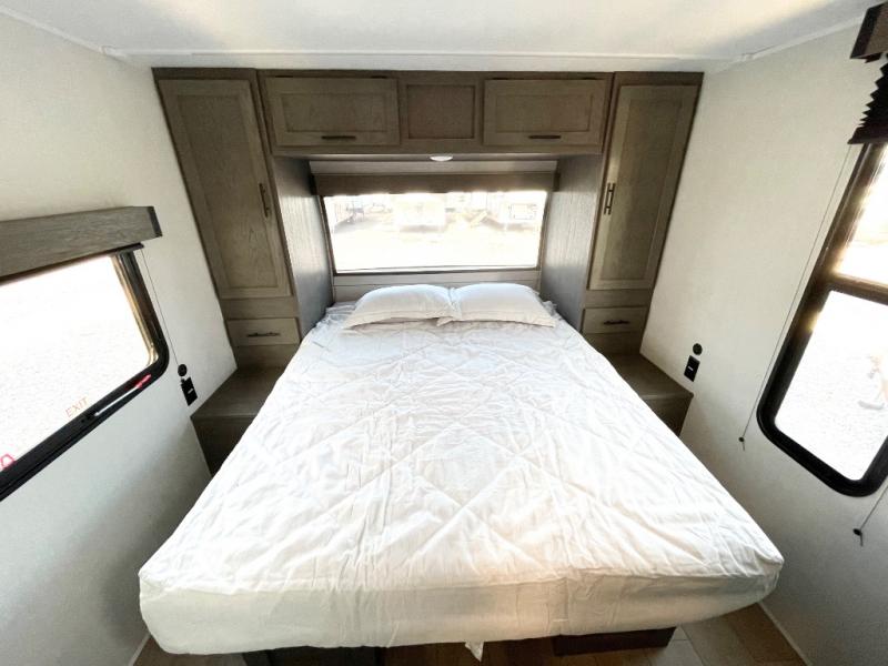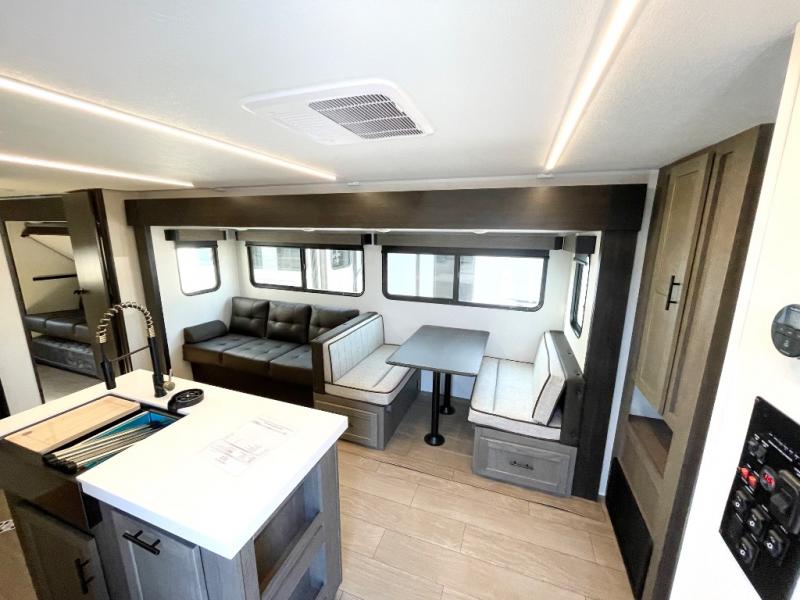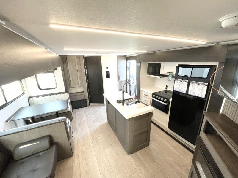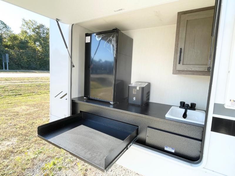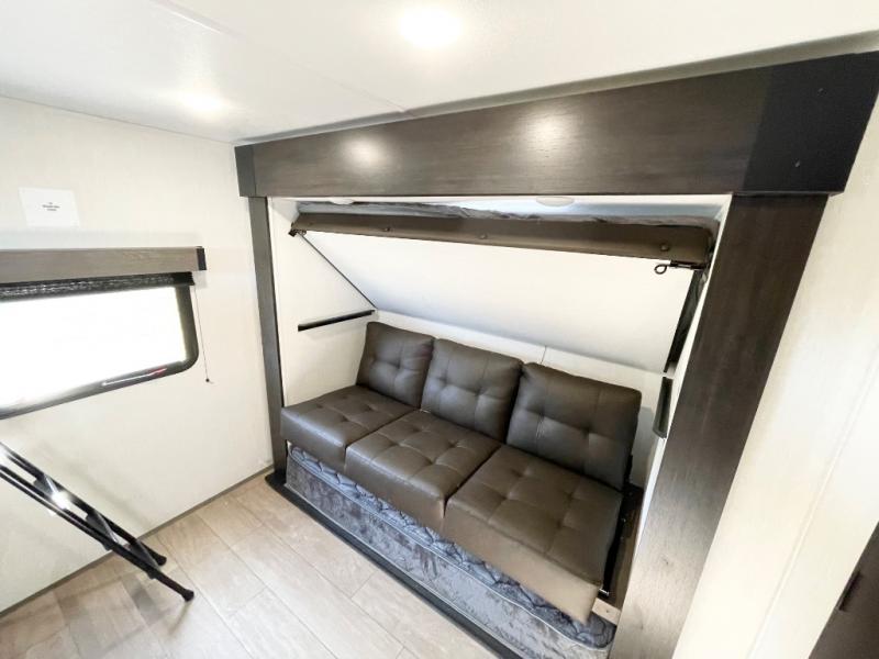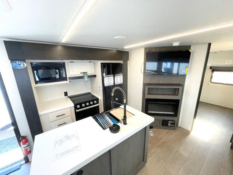 Load up your clothes, food, and outdoor gear to enjoy a long weekend away from the city in this travel trailer! There are triple slide outs, a private bunkhouse with a half bathroom with a second exterior entry/door for convenience, plus an outside kitchen, complete with ice! The bunkhouse also has two bunks, a jackknife sofa and a trundle bed, plus a slide out for more interior floor space. The main living and kitchen area is spacious as well with two opposing slides, a kitchen island with a large sink, a pantry, plus a cozy fireplace. The full walk-through bathroom allows double access, and the front bedroom allows you to sleep like royalty.