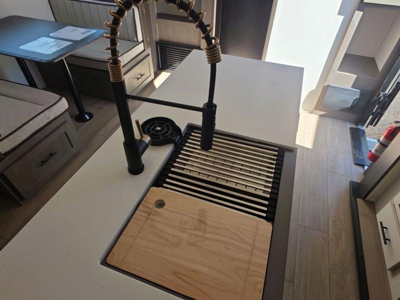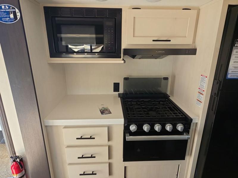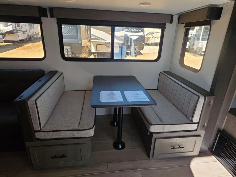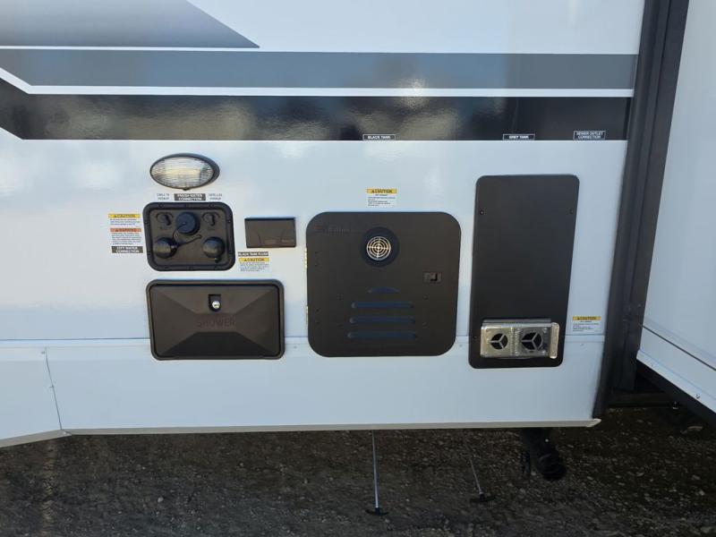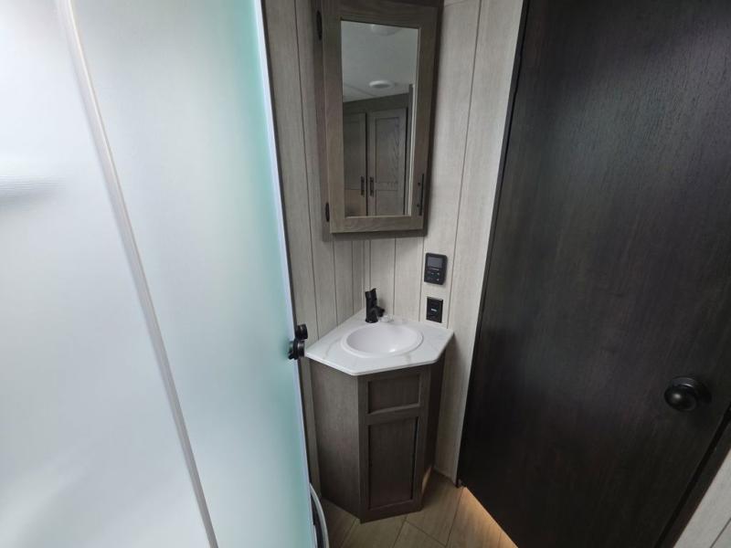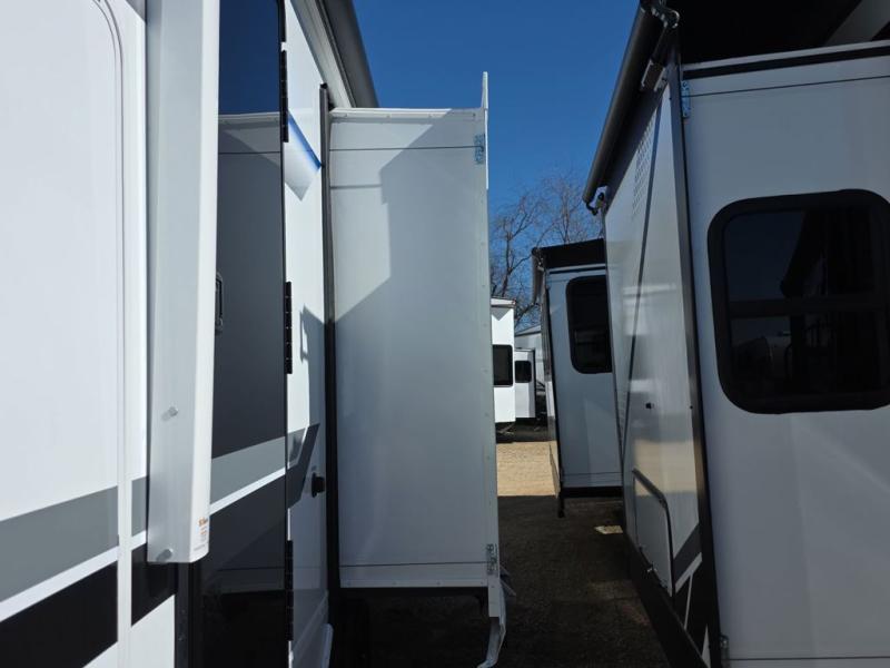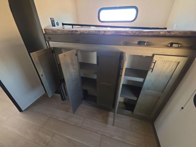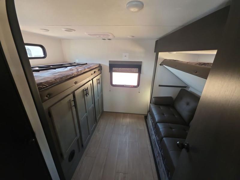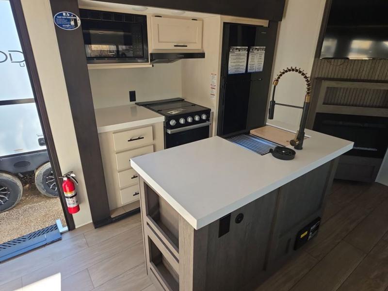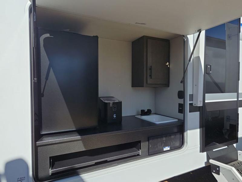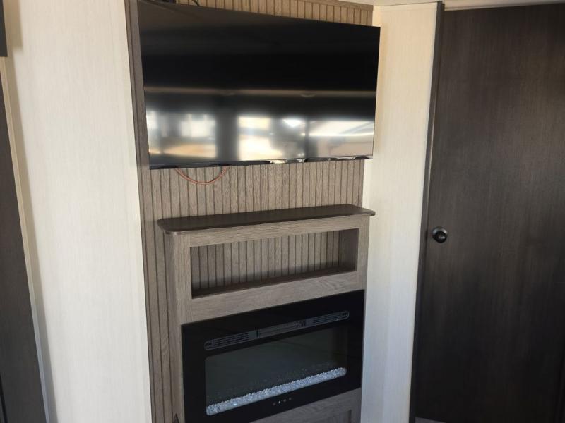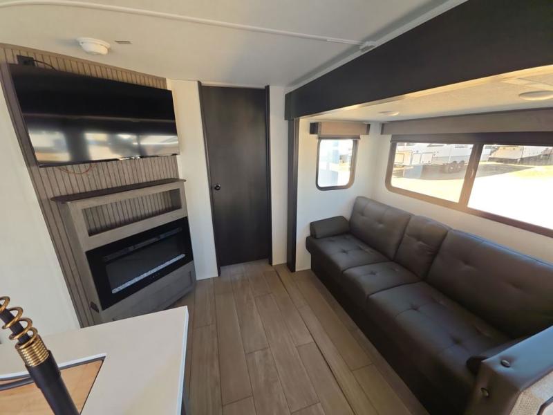 Load up your clothes, food, and outdoor gear to enjoy a long weekend away from the city in this travel trailer! There are triple slide outs, a private bunkhouse with a half bathroom with a second exterior entry/door for convenience, plus an outside kitchen! The bunkhouse also has two bunks, a jackknife sofa and a trundle bed, plus a slide out for more interior floor space. The main living and kitchen area is spacious as well with two opposing slides, a kitchen island with a large sink, a pantry, plus a cozy fireplace. The full walk-through bathroom allows double access, and the front bedroom allows you to sleep like royalty.