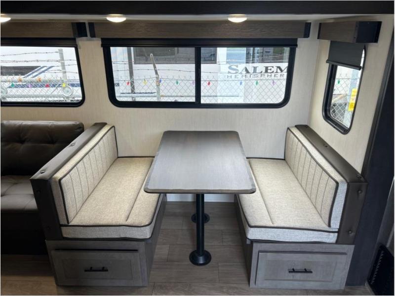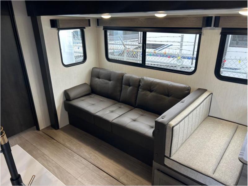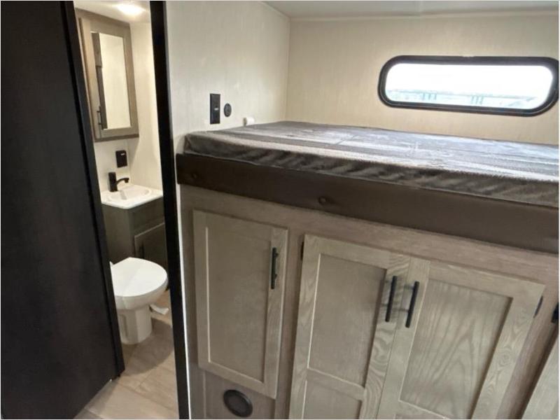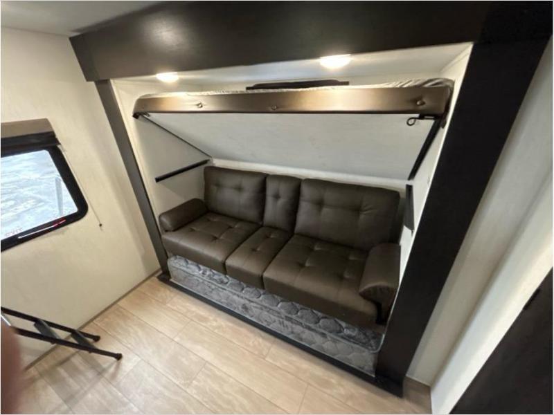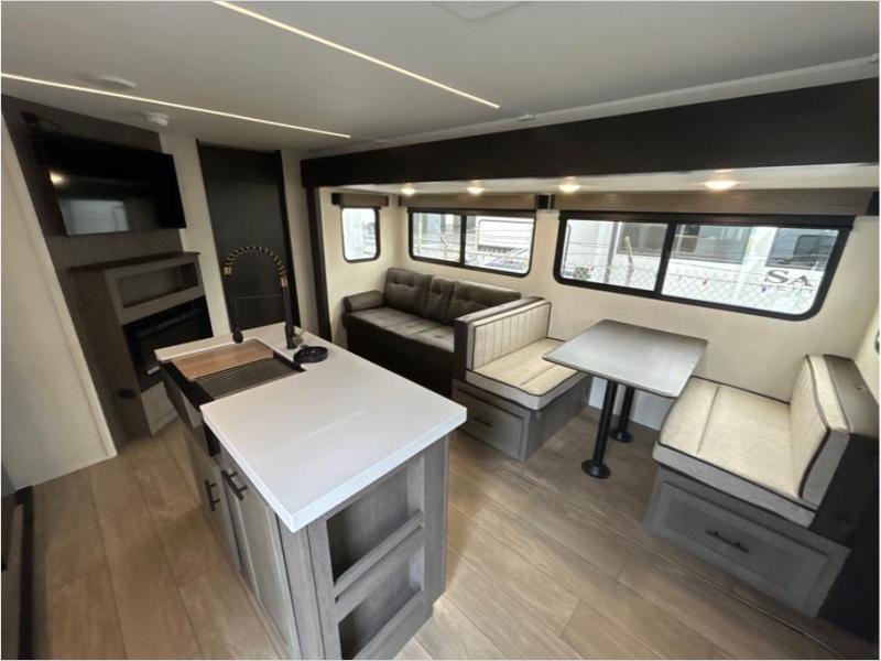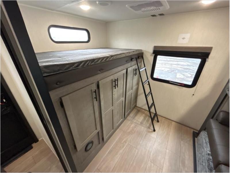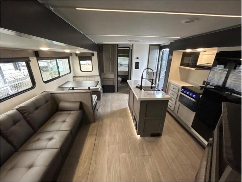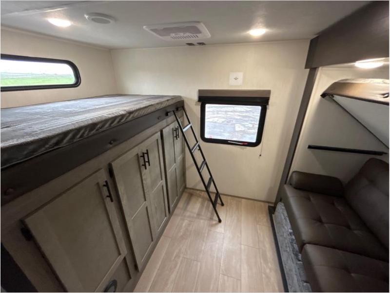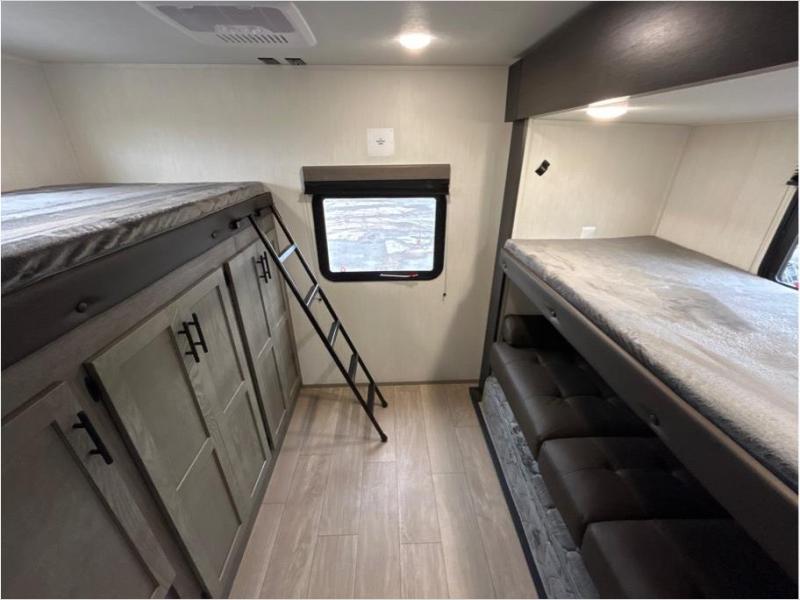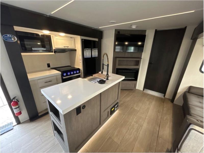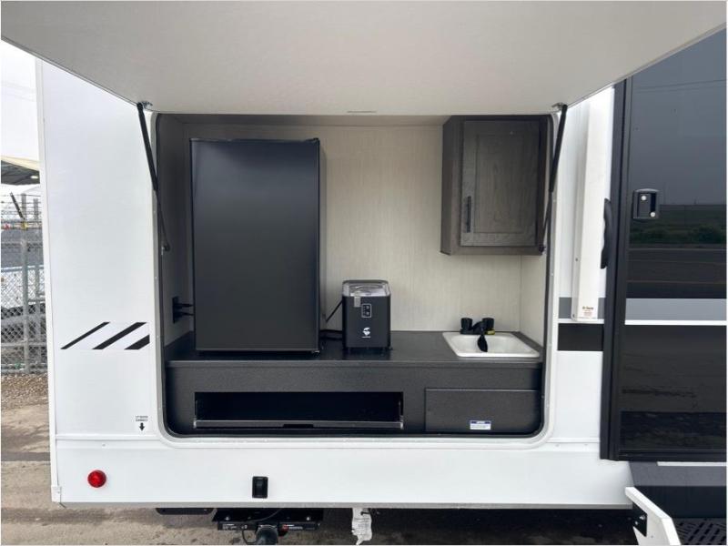 Load up your clothes, food, and outdoor gear to enjoy a long weekend away from the city in this travel trailer! There are triple slide outs, a private bunkhouse with a half bathroom with a second exterior entry/door for convenience, plus an outside kitchen! The bunkhouse also has two bunks, a jackknife sofa and a trundle bed, plus a slide out for more interior floor space. The main living and kitchen area is spacious as well with two opposing slides, a kitchen island with a large sink, a pantry, plus a cozy fireplace. The full walk-through bathroom allows double access, and the front bedroom allows you to sleep like royalty.