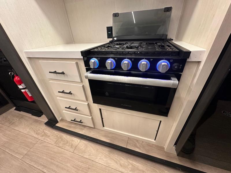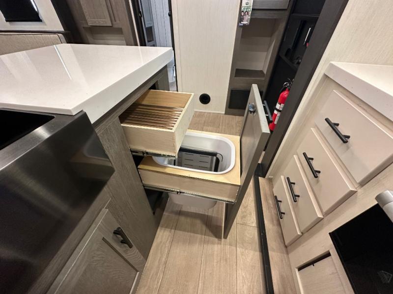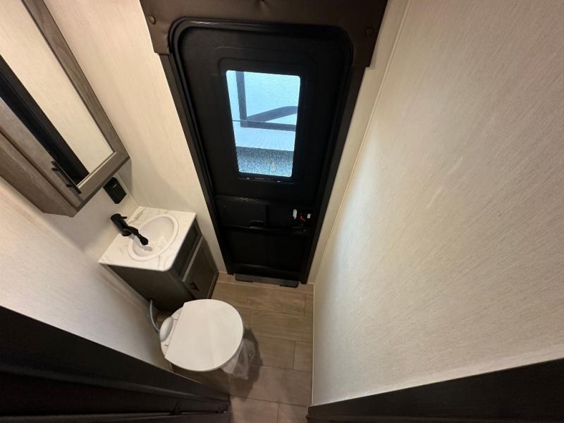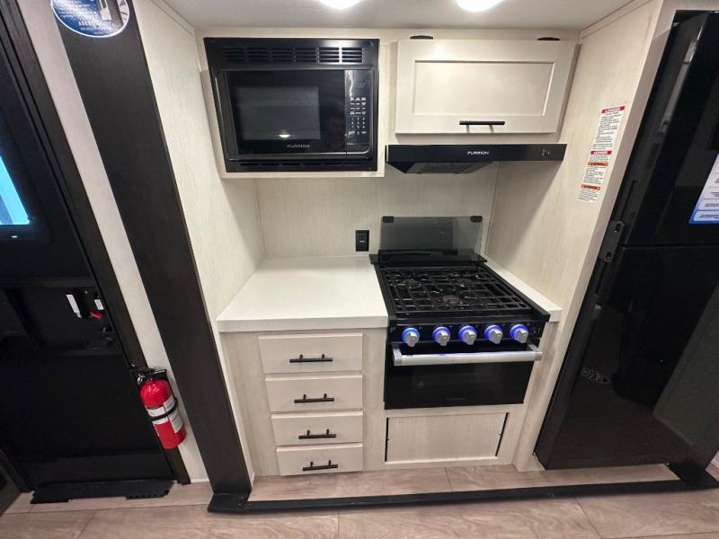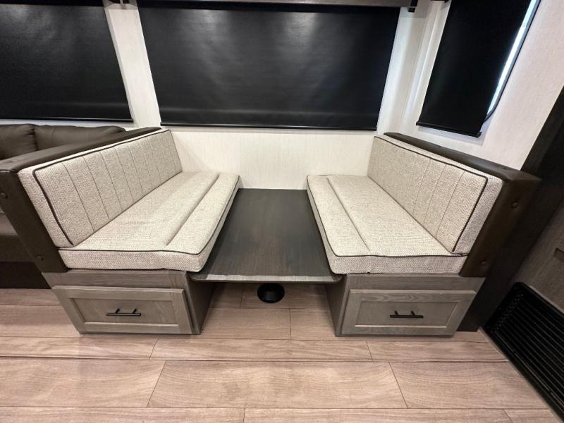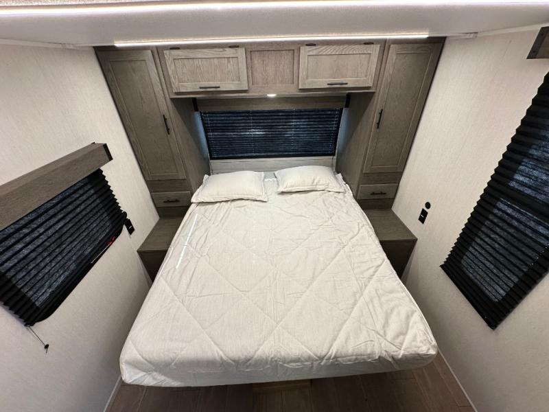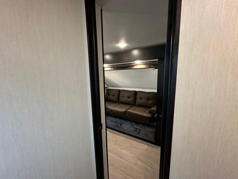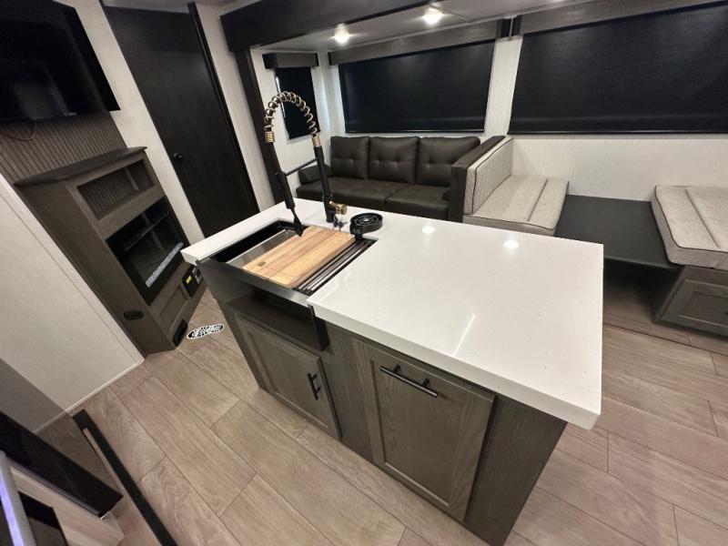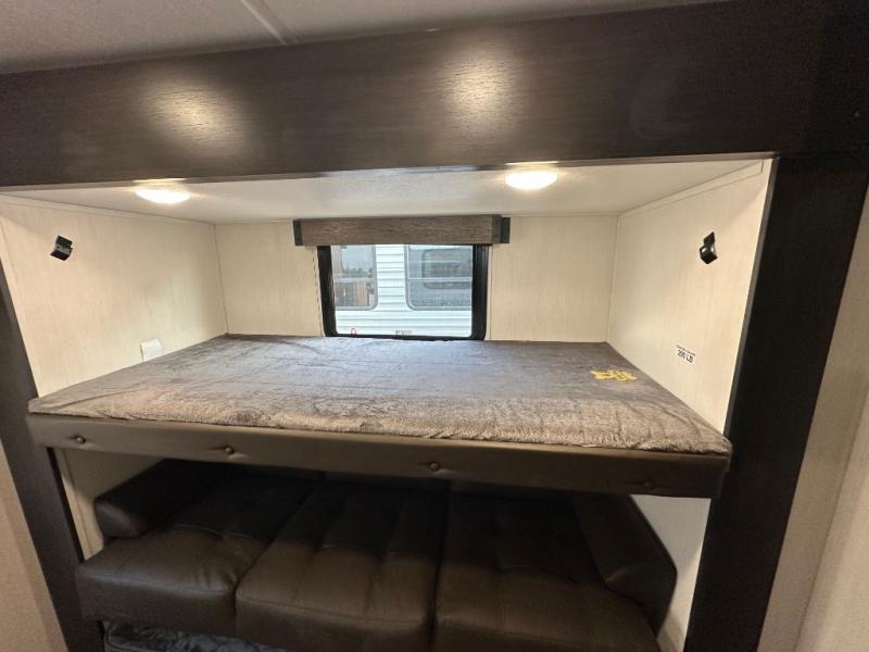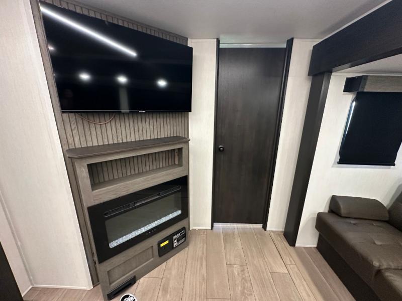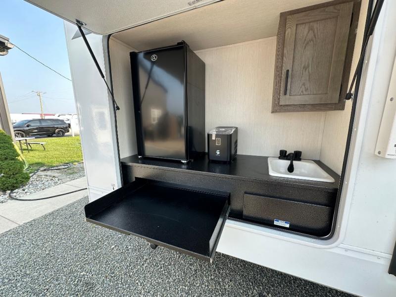 Load up your clothes, food, and outdoor gear to enjoy a long weekend away from the city in this travel trailer! There are triple slide outs, a private bunkhouse with a half bathroom with a second exterior entry/door for convenience, plus an outside kitchen, complete with ice! The bunkhouse also has two bunks, a jackknife sofa and a trundle bed, plus a slide out for more interior floor space. The main living and kitchen area is spacious as well with two opposing slides, a kitchen island with a large sink, a pantry, plus a cozy fireplace. The full walk-through bathroom allows double access, and the front bedroom allows you to sleep like royalty.
