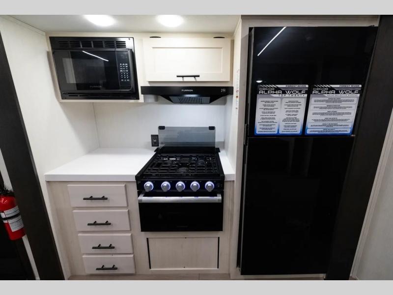 With any Cherokee Alpha Wolf travel trailer by Forest River you'll enjoy outstanding amenities, quality construction, and an affordable price. Each model features a "ToughBend" rigid skirt metal design, 5/8" tongue and groove plywood floor decking, and a "SuperTruss" roof structure that will hold up through years of camping memories. There is a pet friendly "clean sweep" floor design with no heat vents indoors, along with a super lumen lighting system, a 15,000 BTU quick cool central air conditioning, and many more comforts. There are many convenient exterior features such as, Leash Latch pet safety technology, an outside shower with hot and cold water, and exterior steps with oversized landing and quick release. The Weather Guard Package will add protection against the elements with an armored underbelly tank enclosure and forced air heat, thermo-control reflective safety glass windows, and upgraded laminated walls with block foam insulation!