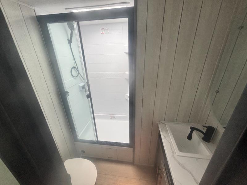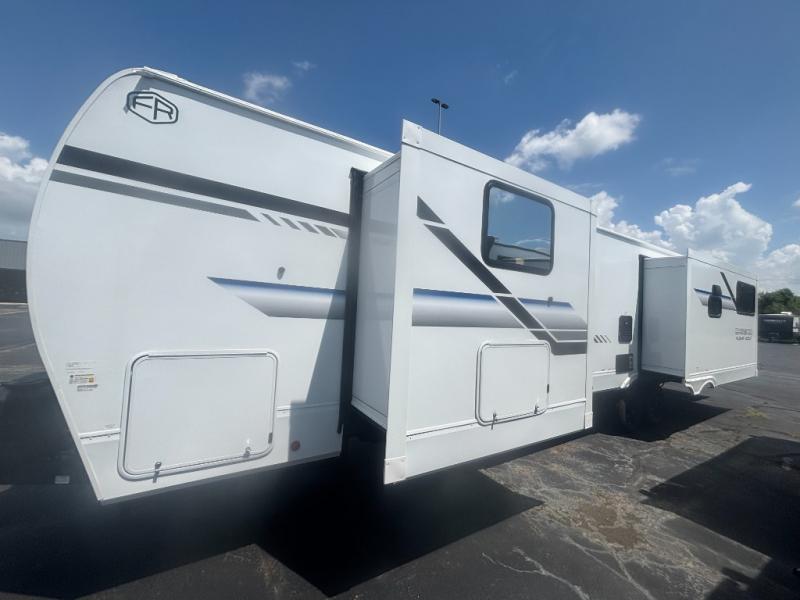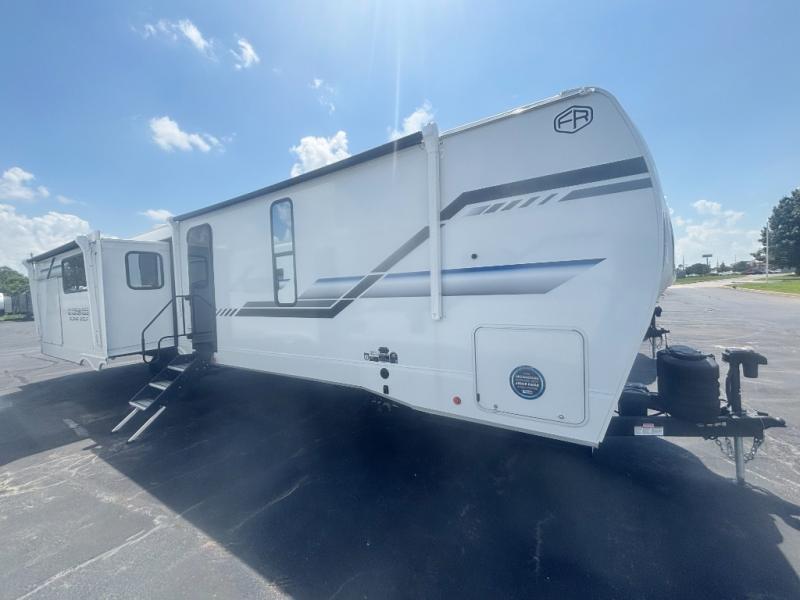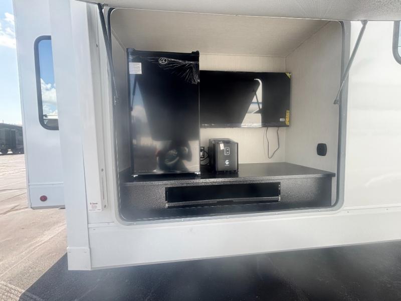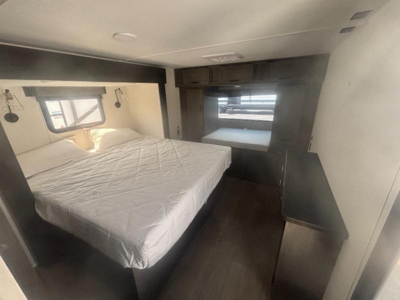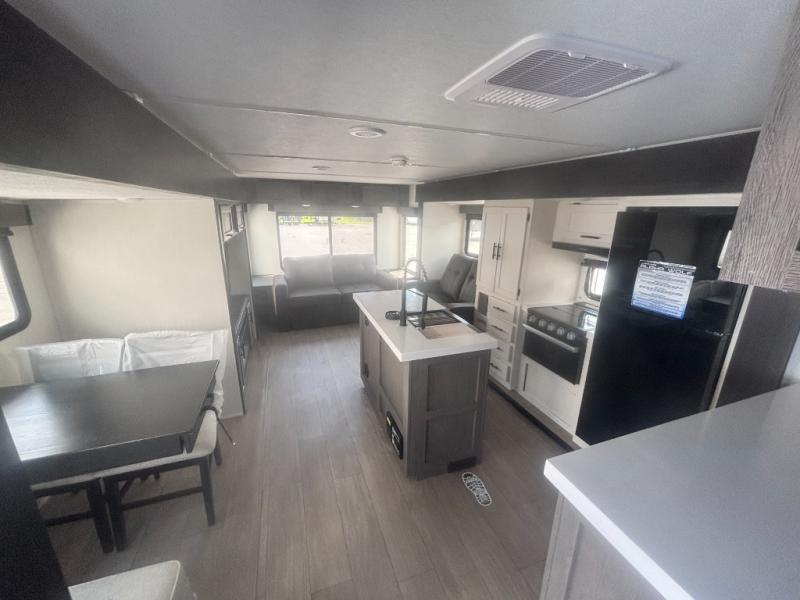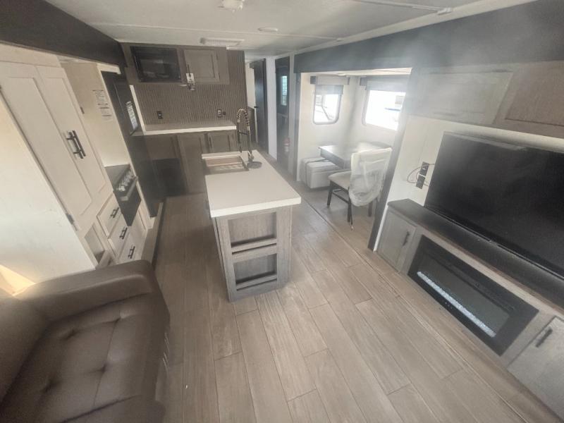 It will be so easy to find comfort in this travel trailer! The dual opposing slides in the combined kitchen and living room will create an open floorplan you are sure to love. There is a rear tri-fold sofa, theater seating across from an entertainment center, plus a table with chairs and a storage ottoman seat to keep games organized. The chef of your group will love having extra counter space provided by the kitchen island, and there is a hutch to keep nice dishes stored away. Up front, the private bedroom includes a king bed slide out, dual wardrobes and a dresser, plus a front sun bench where you can sit to pull your hiking boots on. There is even a wardrobe with washer and dryer prep if you choose to add those appliances!