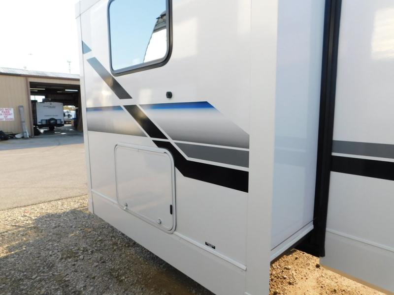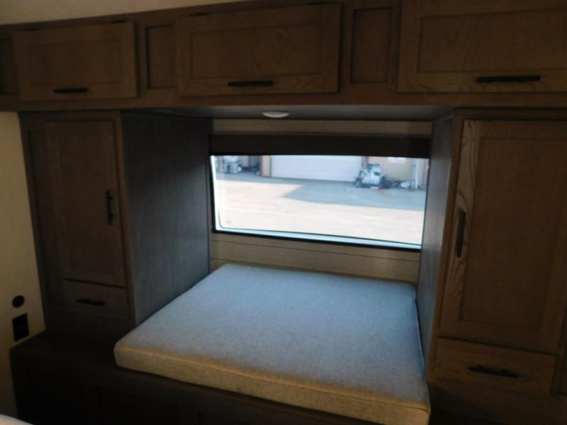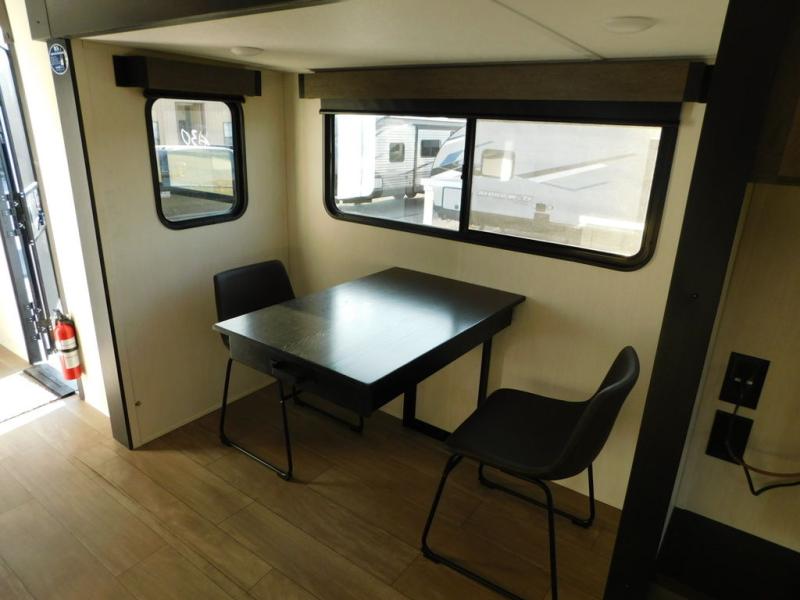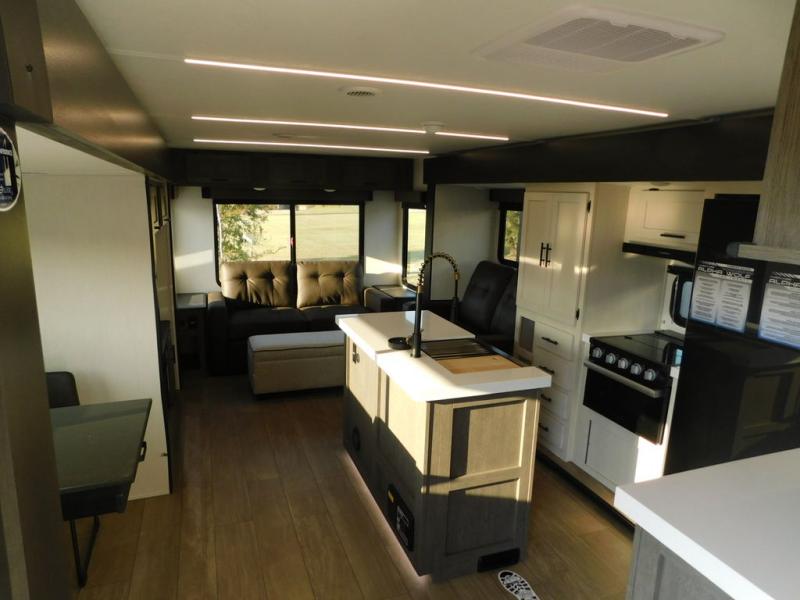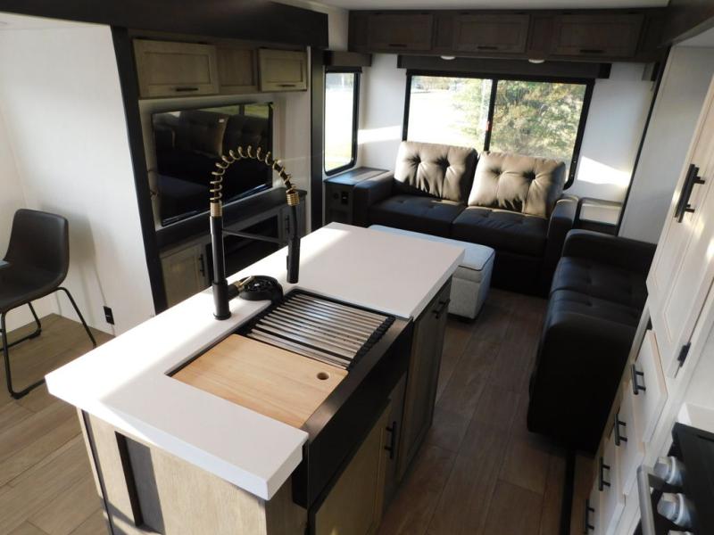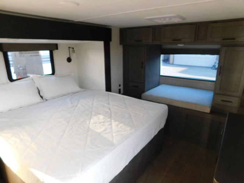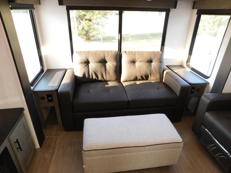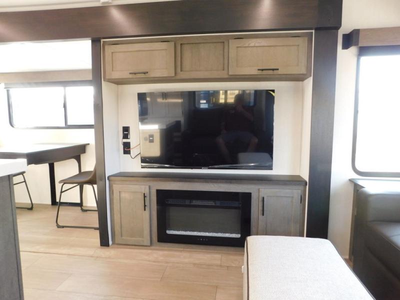 It will be so easy to find comfort in this travel trailer! The dual opposing slides in the combined kitchen and living room will create an open floorplan you are sure to love. There is a rear tri-fold sofa, theater seating across from an entertainment center, plus a table with chairs and a storage ottoman seat to keep games organized. The chef of your group will love having extra counter space provided by the kitchen island, and there is a hutch to keep nice dishes stored away. Up front, the private bedroom includes a king bed slide out, dual wardrobes and a dresser, plus a front sun bench where you can sit to pull your hiking boots on. There is even a wardrobe with washer and dryer prep if you choose to add those appliances!
