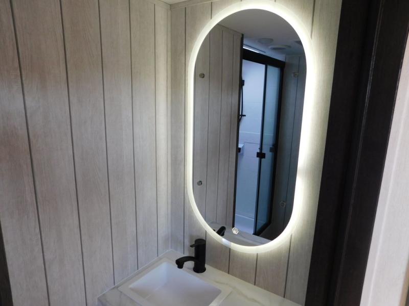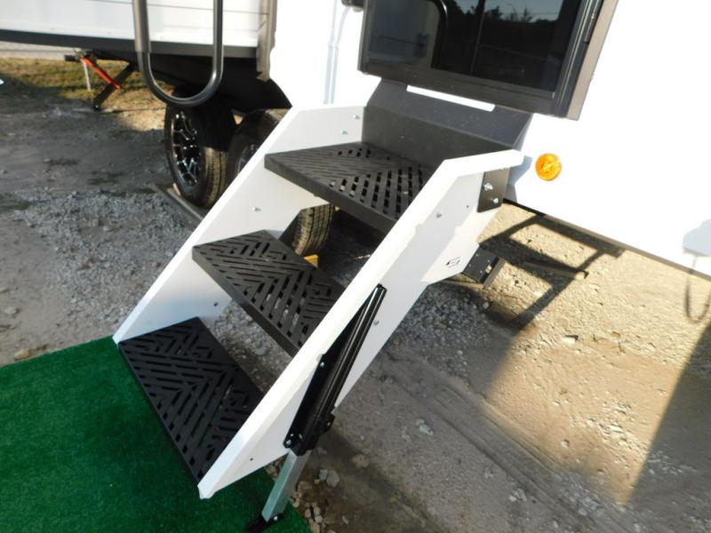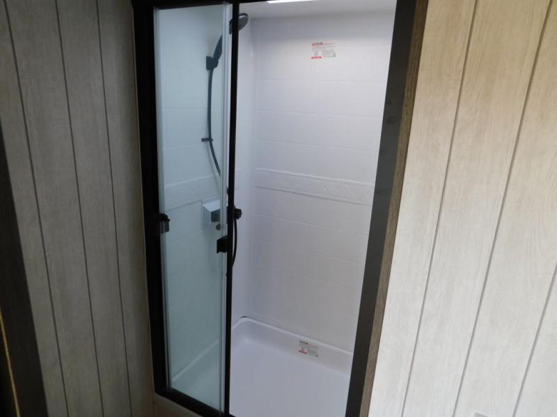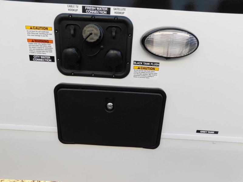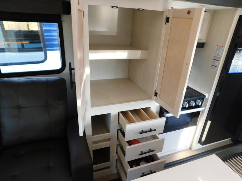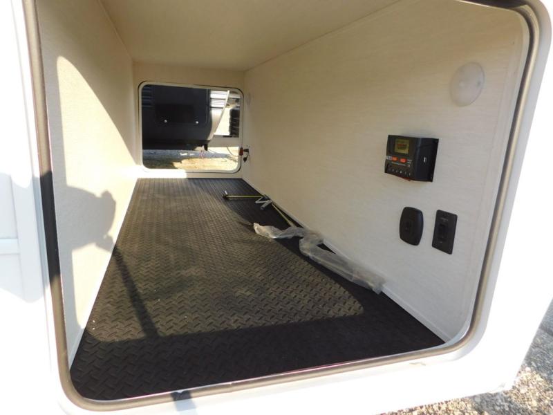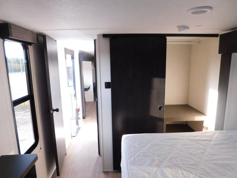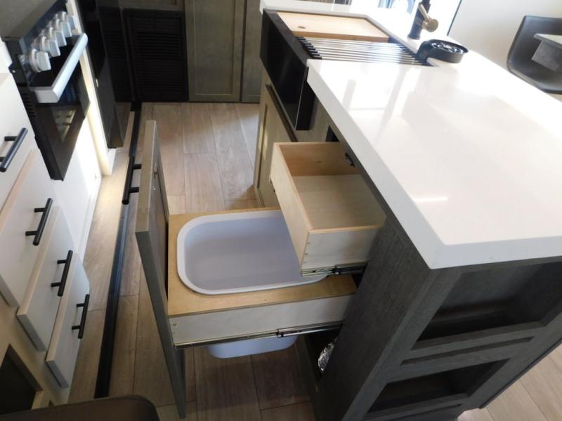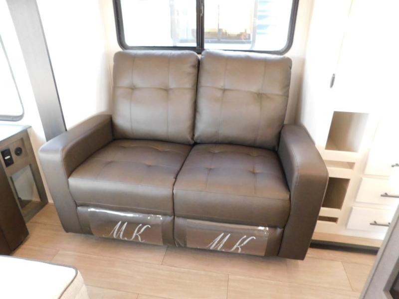 It will be so easy to find comfort in this travel trailer! The dual opposing slides in the combined kitchen and living room will create an open floorplan you are sure to love. There is a rear tri-fold sofa, theater seating across from an entertainment center, plus a table with chairs and a storage ottoman seat to keep games organized. The chef of your group will love having extra counter space provided by the kitchen island, and there is a hutch to keep nice dishes stored away. Up front, the private bedroom includes a king bed slide out, dual wardrobes and a dresser, plus a front sun bench where you can sit to pull your hiking boots on. There is even a wardrobe with washer and dryer prep if you choose to add those appliances!