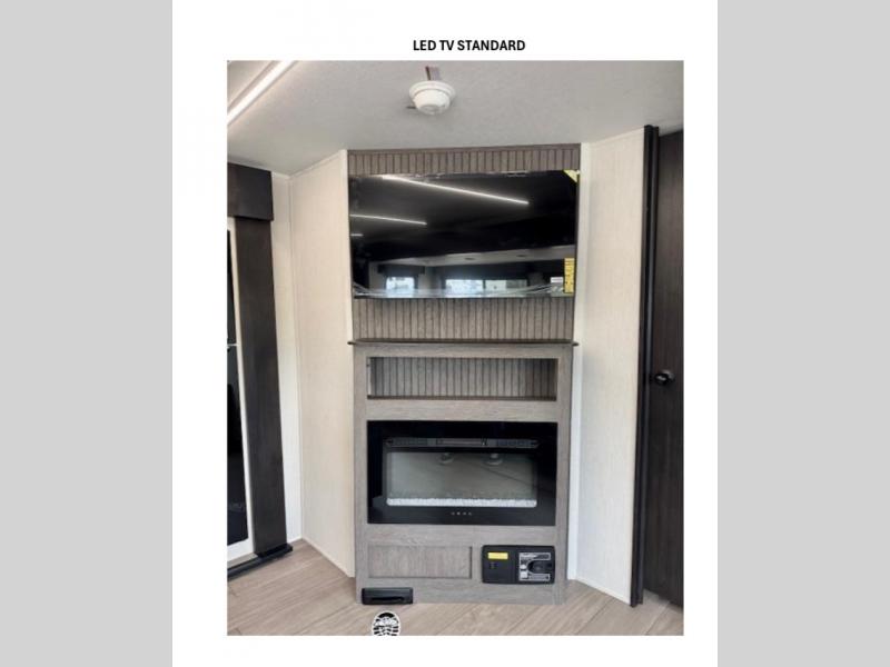 It will be so easy to find comfort in this travel trailer! The dual opposing slides in the combined kitchen and living room will create an open floorplan you are sure to love. There is a rear tri-fold sofa, theater seating across from an entertainment center, plus a table with chairs and a storage ottoman seat to keep games organized. The chef of your group will love having extra counter space provided by the kitchen island, and there is a hutch to keep nice dishes stored away. Up front, the private bedroom includes a king bed slide out, dual wardrobes and a dresser, plus a front sun bench where you can sit to pull your hiking boots on. There is even a wardrobe with washer and dryer prep if you choose to add those appliances!