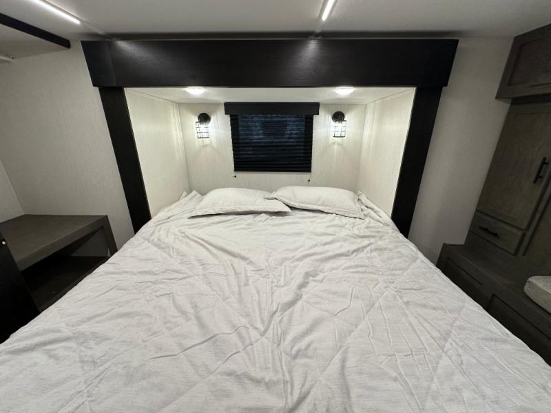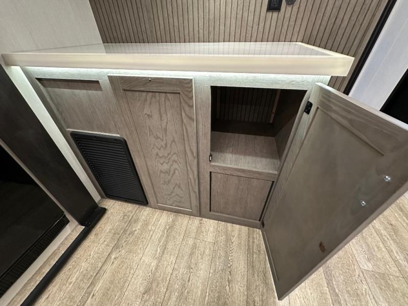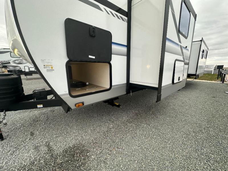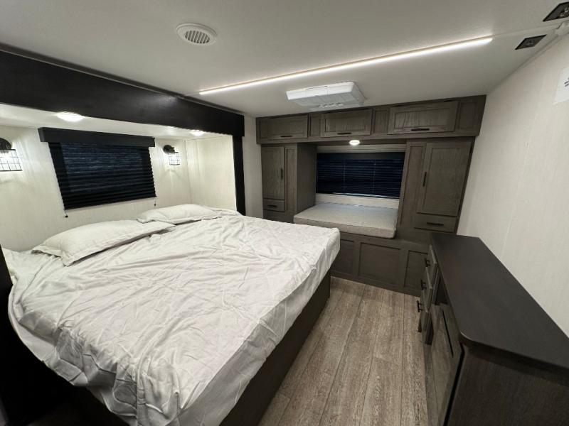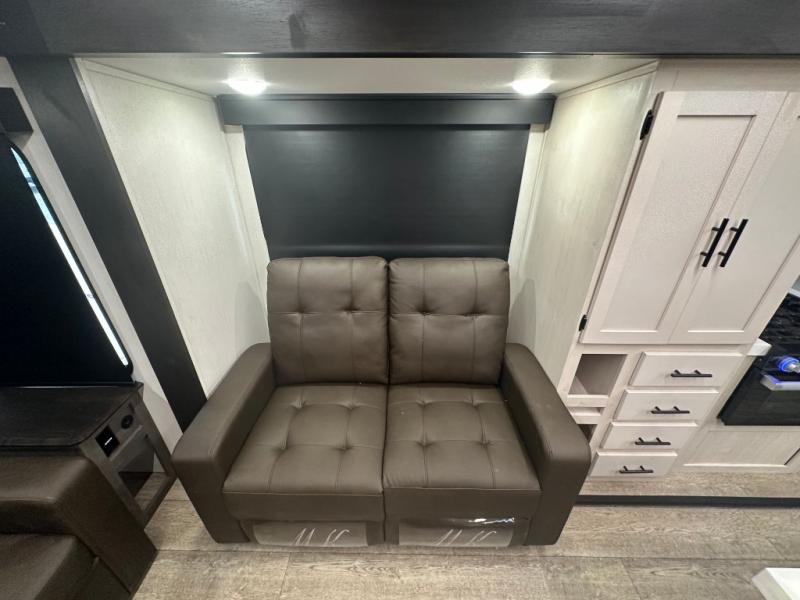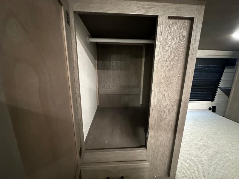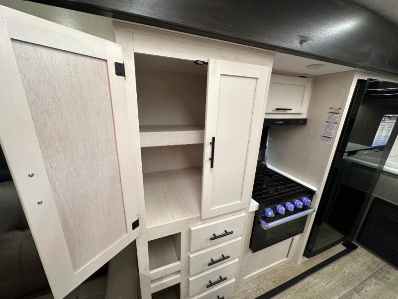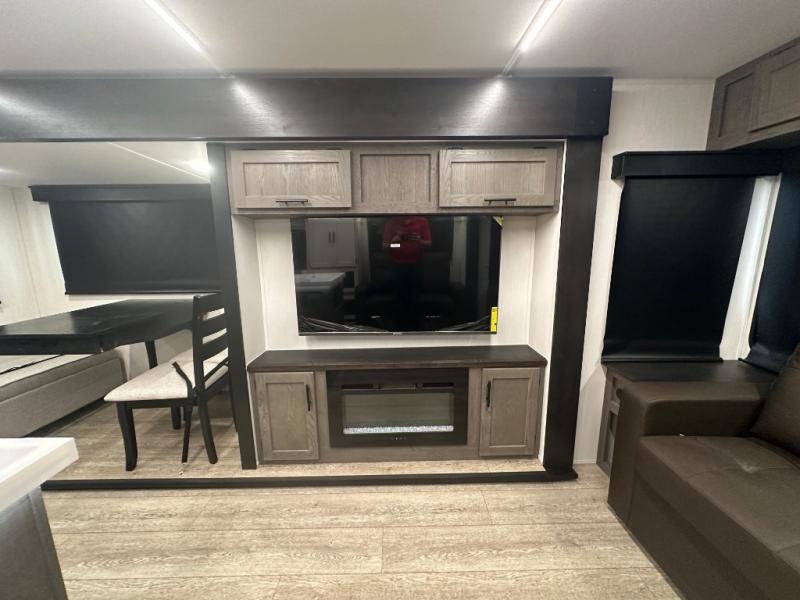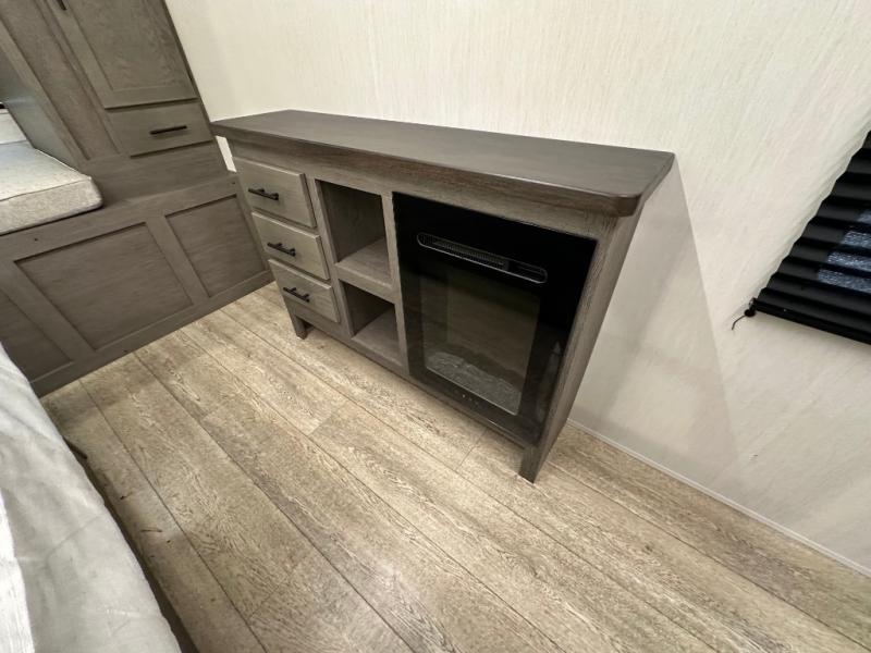 It will be so easy to find comfort in this travel trailer! The dual opposing slides in the combined kitchen and living room will create an open floorplan you are sure to love. There is a rear tri-fold sofa, theater seating across from an entertainment center, plus a table with chairs and a storage ottoman seat to keep games organized. The chef of your group will love having extra counter space provided by the kitchen island, and there is a hutch to keep nice dishes stored away. Up front, the private bedroom includes a king bed slide out, dual wardrobes and a dresser, plus a front sun bench where you can sit to pull your hiking boots on. There is even a wardrobe with washer and dryer prep if you choose to add those appliances!