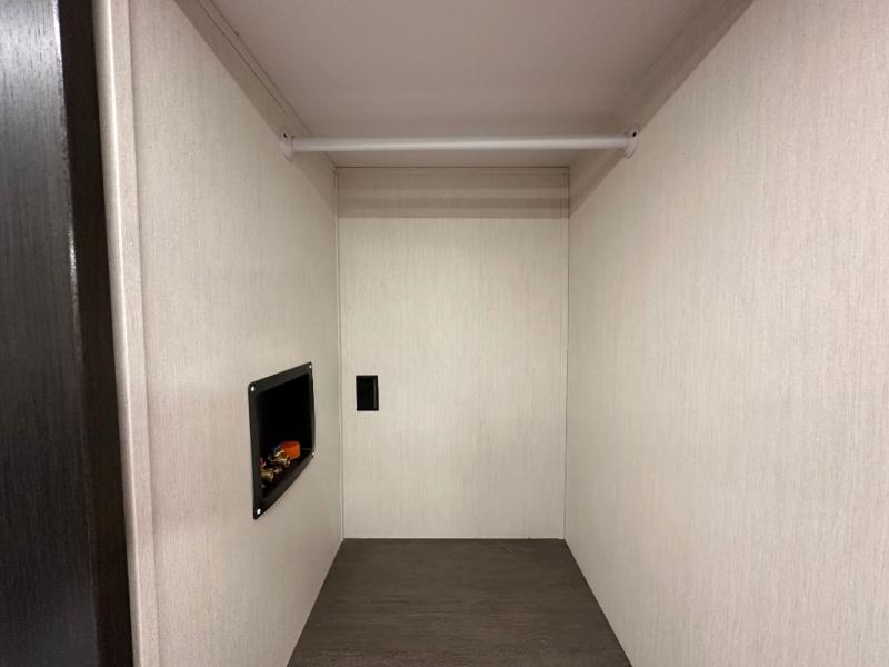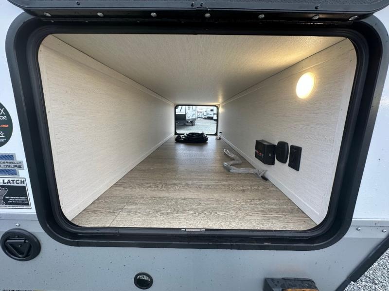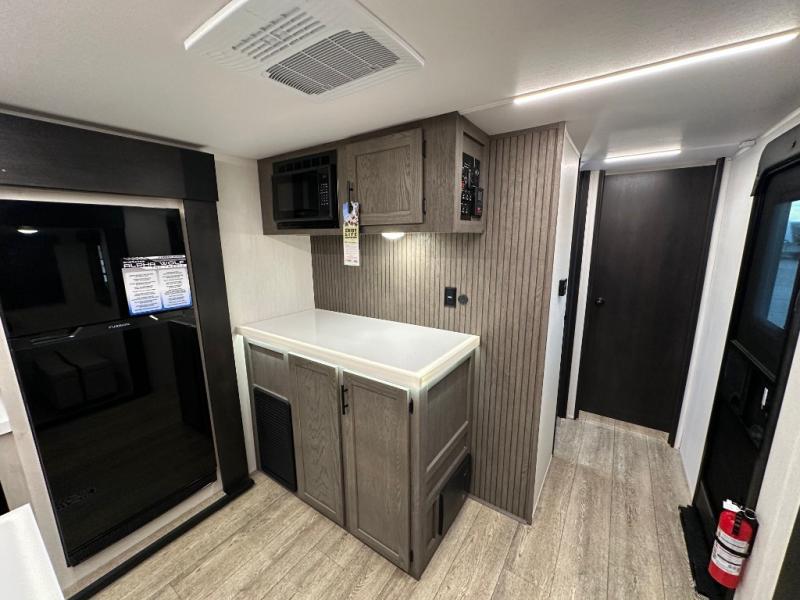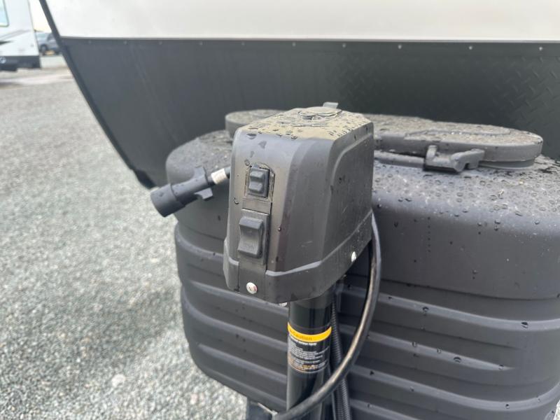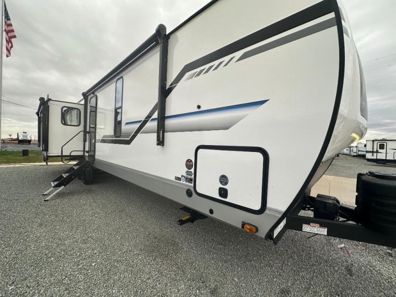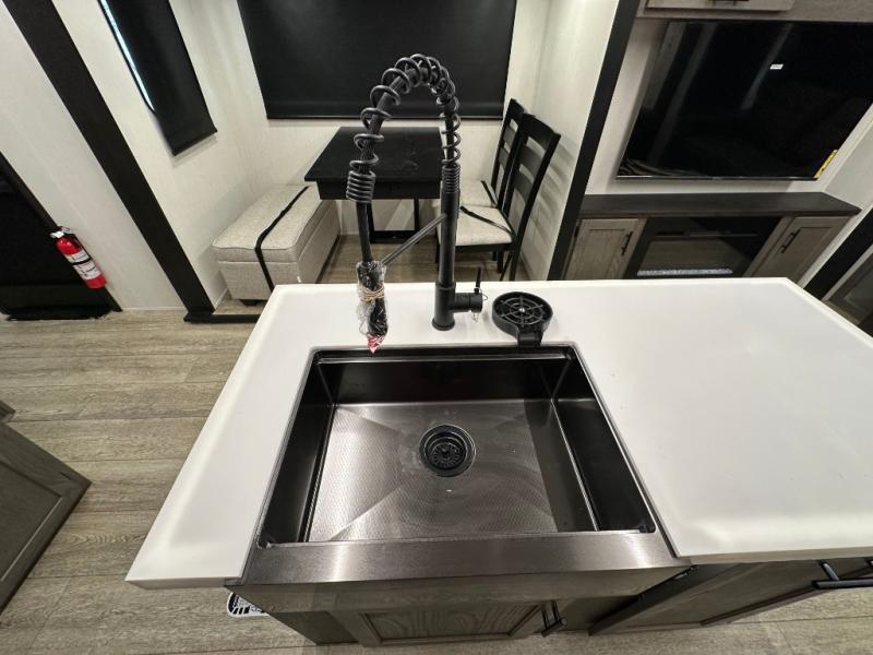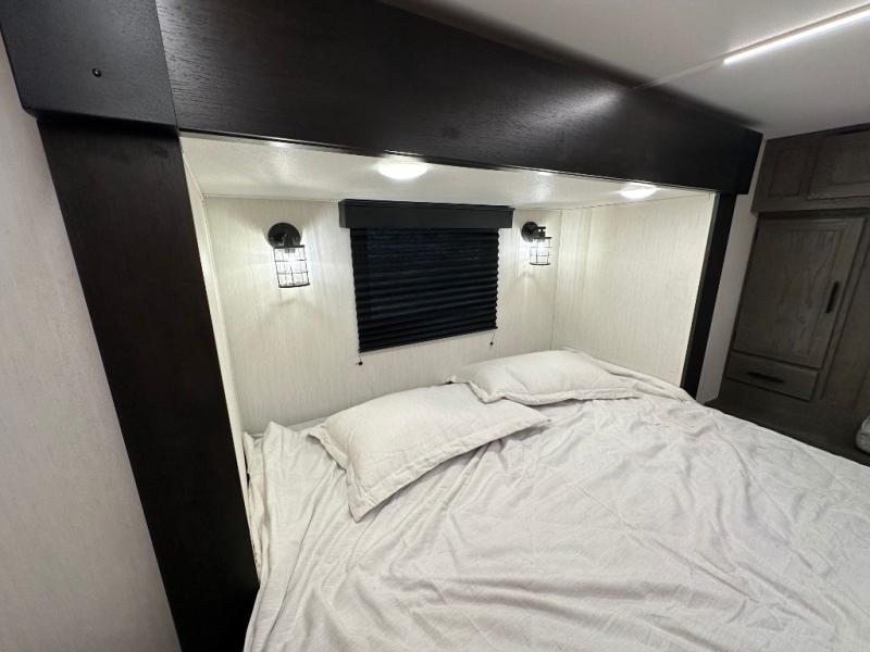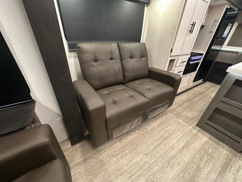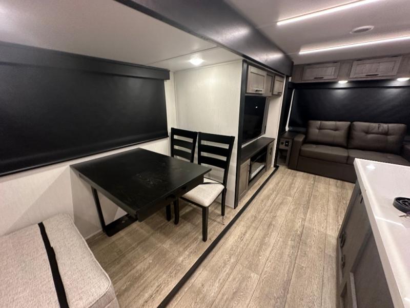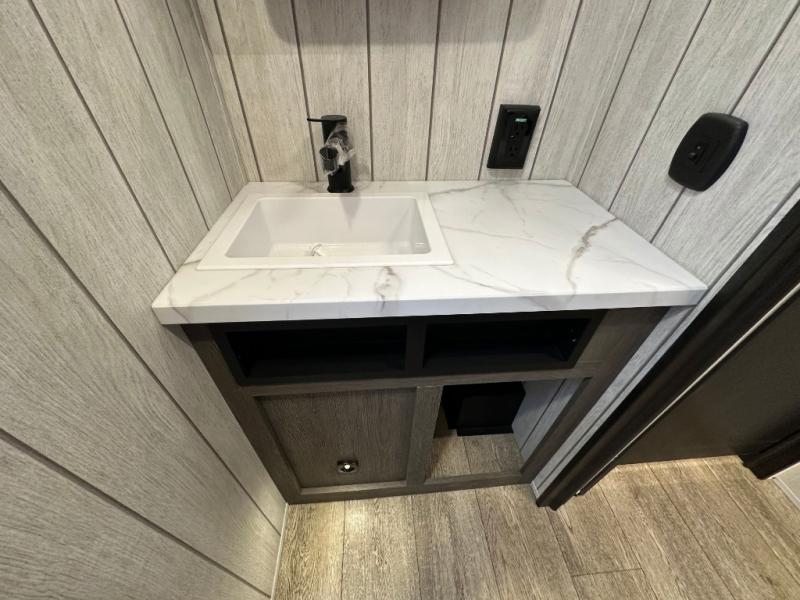 It will be so easy to find comfort in this travel trailer! The dual opposing slides in the combined kitchen and living room will create an open floorplan you are sure to love. There is a rear tri-fold sofa, theater seating across from an entertainment center, plus a table with chairs and a storage ottoman seat to keep games organized. The chef of your group will love having extra counter space provided by the kitchen island, and there is a hutch to keep nice dishes stored away. Up front, the private bedroom includes a king bed slide out, dual wardrobes and a dresser, plus a front sun bench where you can sit to pull your hiking boots on. There is even a wardrobe with washer and dryer prep if you choose to add those appliances!