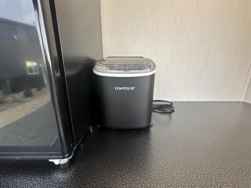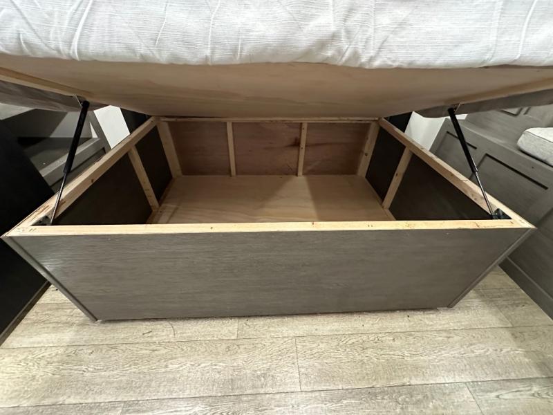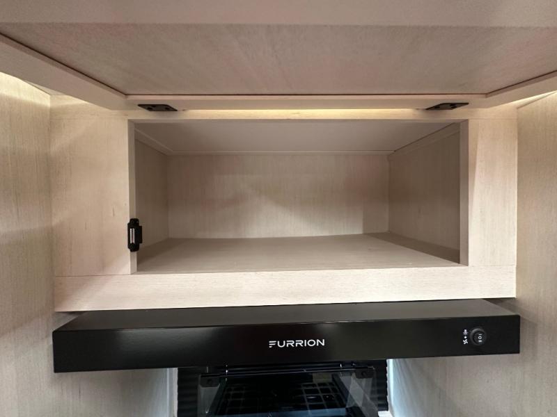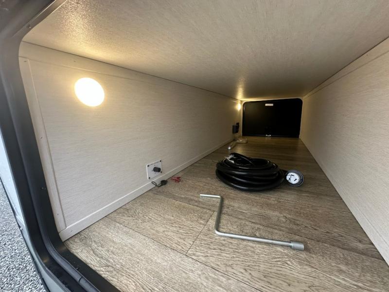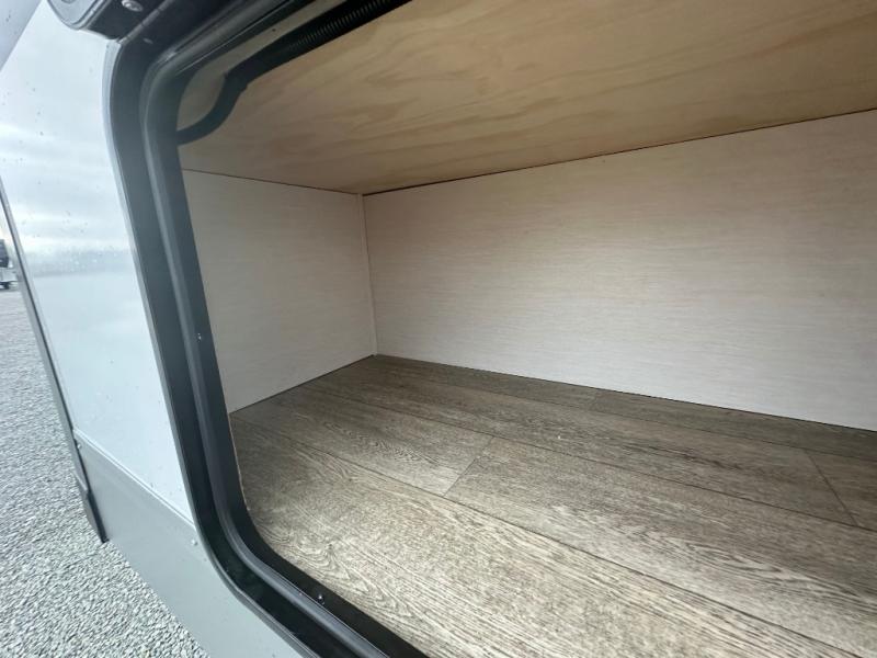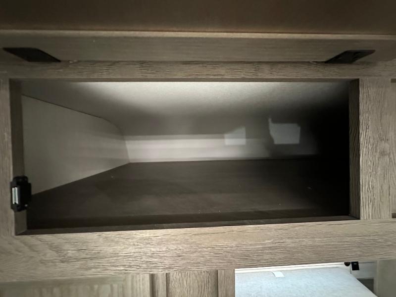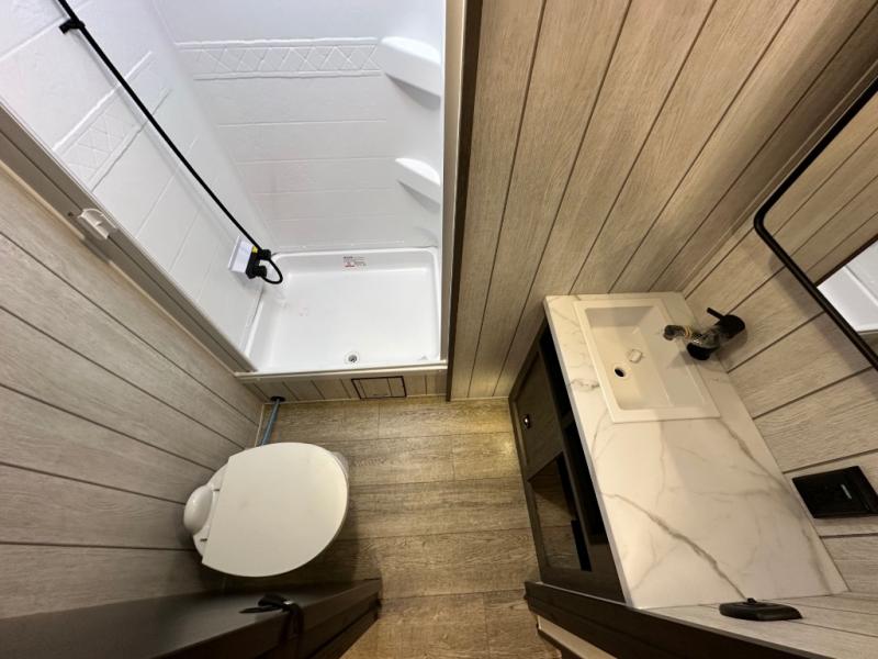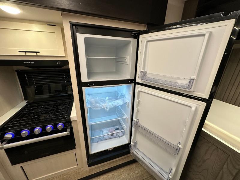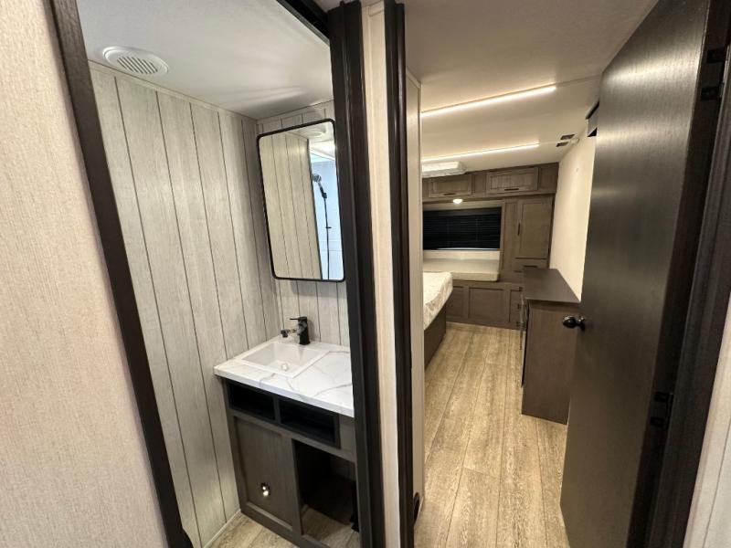 It will be so easy to find comfort in this travel trailer! The dual opposing slides in the combined kitchen and living room will create an open floorplan you are sure to love. There is a rear tri-fold sofa, theater seating across from an entertainment center, plus a table with chairs and a storage ottoman seat to keep games organized. The chef of your group will love having extra counter space provided by the kitchen island, and there is a hutch to keep nice dishes stored away. Up front, the private bedroom includes a king bed slide out, dual wardrobes and a dresser, plus a front sun bench where you can sit to pull your hiking boots on. There is even a wardrobe with washer and dryer prep if you choose to add those appliances!