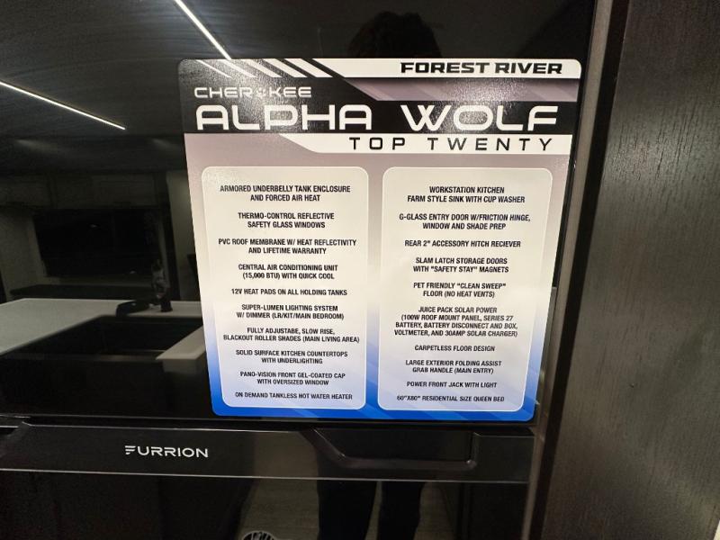 With any Cherokee Alpha Wolf travel trailer by Forest River you'll enjoy outstanding amenities, quality construction, and an affordable price. Each model features a "ToughBend" rigid skirt metal design, 5/8" tongue and groove plywood floor decking, and a "SuperTruss" roof structure that will hold up through years of camping memories. There is a pet friendly "clean sweep" floor design with no heat vents indoors, along with a super lumen lighting system, a 15,000 BTU quick cool central air conditioning, and many more comforts. There are many convenient exterior features such as, Leash Latch pet safety technology, an outside shower with hot and cold water, On The Go rear ladder prep, and exterior steps with oversized landing and quick release. The Weather Guard Package will add protection against the elements with an armored underbelly tank enclosure and forced air heat, thermo-control reflective safety glass windows, and upgraded laminated walls with block foam insulation!
