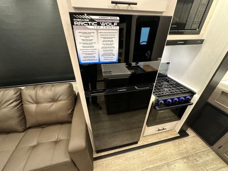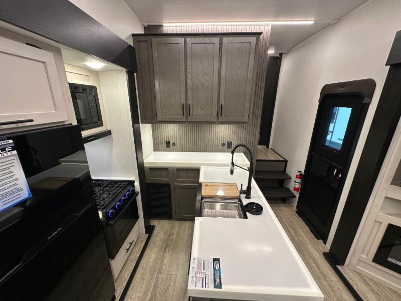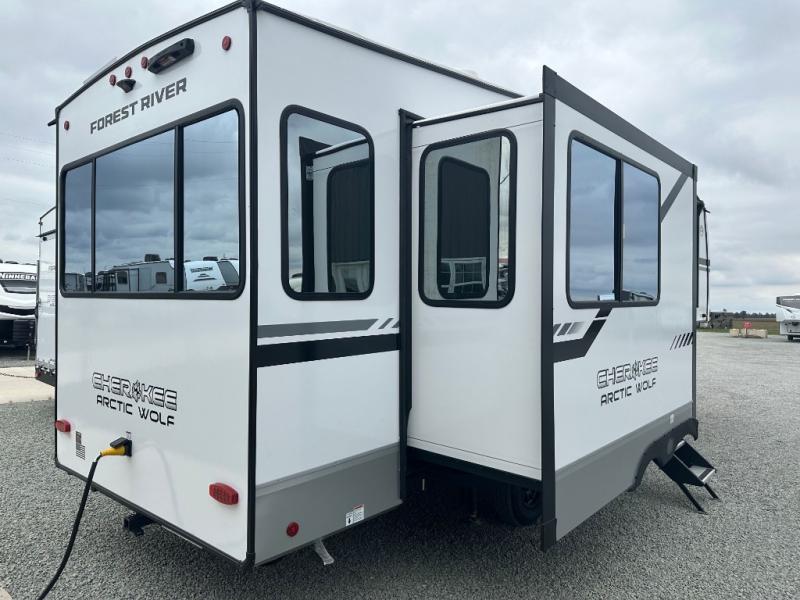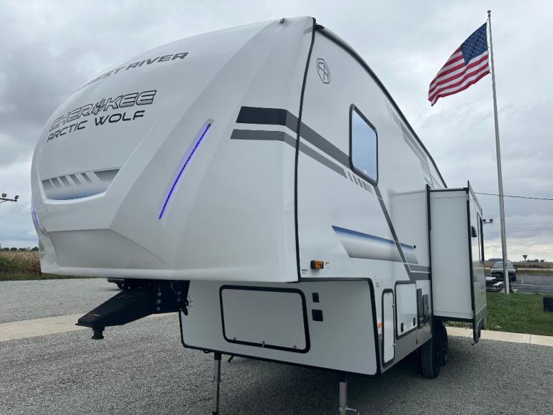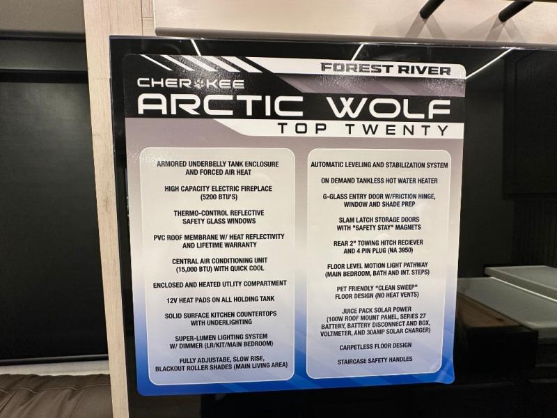 You'll have the very best time tackling outdoor adventures with the Forest River Cherokee Arctic Wolf fifth wheel! Each model has been constructed with a “ToughBend” rigid skirt metal design, Leash Latch pet safety technology, an outside shower with hot/cold water, and a 1x engineered wood “SuperTruss” roof structure with 3/8" decking for added durability. There is also an automatic leveling and stabilization system, slam latch storage doors with "Safety Stay" magnets, plus 12V heat pads on all holding tanks with help withstand colder temperatures. Inside, you'll love the solid surface kitchen countertops with underlighting, along with a carpetless floor design, and fully adjustable, slow rise, blackout roller shades. The on-demand tankless hot water heater will provide endless hot water and the central A/C unit with Quick Cool will ensure your comfort during those hot summer camping months. There are many more stand-out features found on these fifth wheels; check them out!