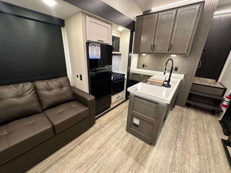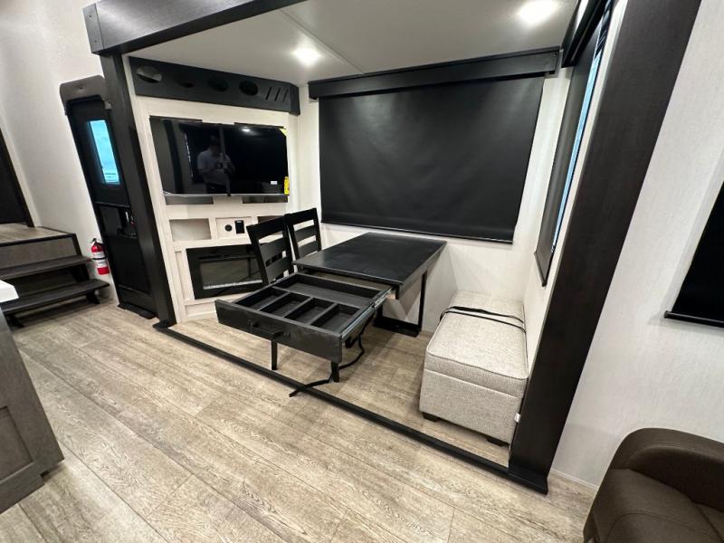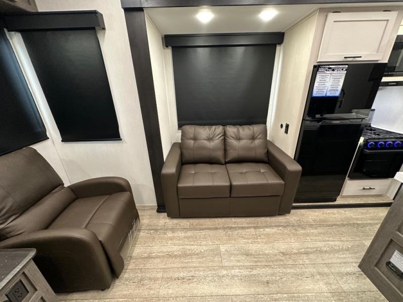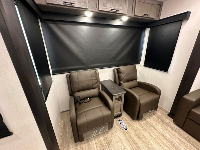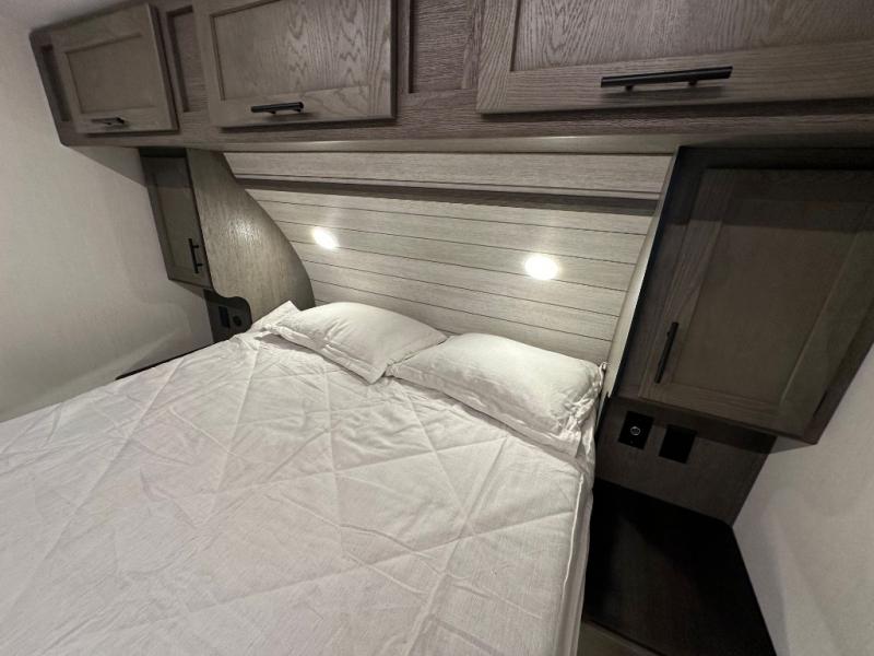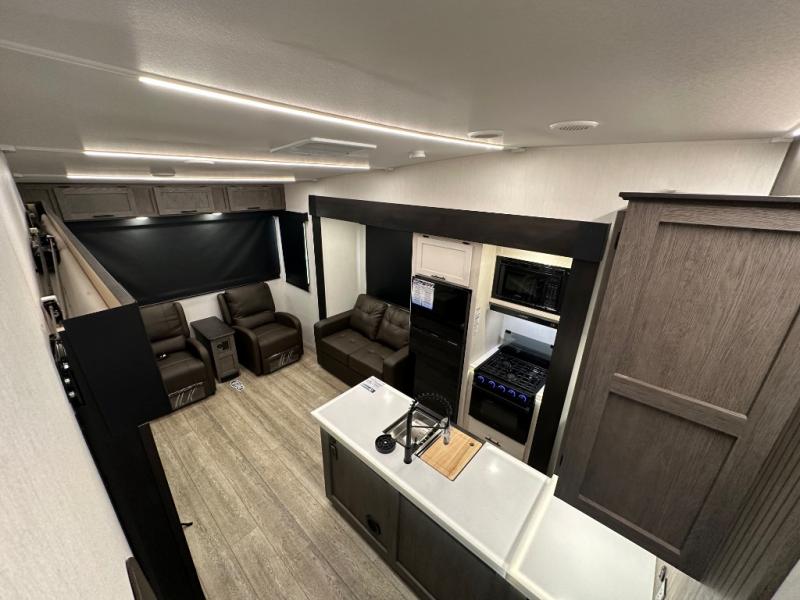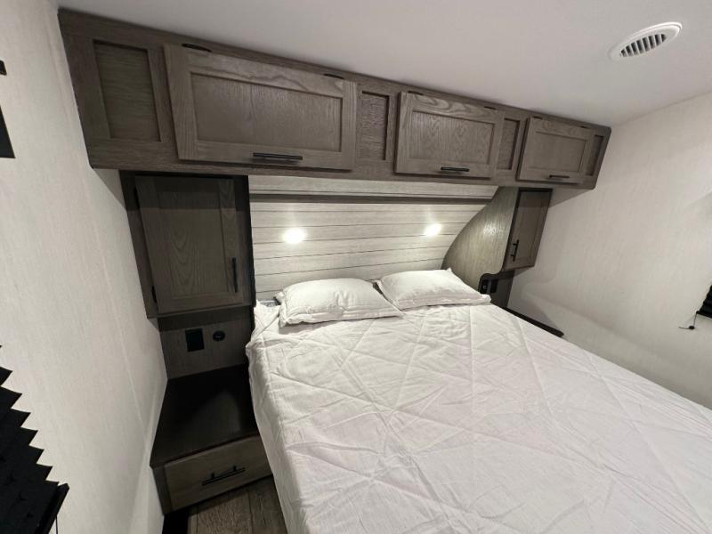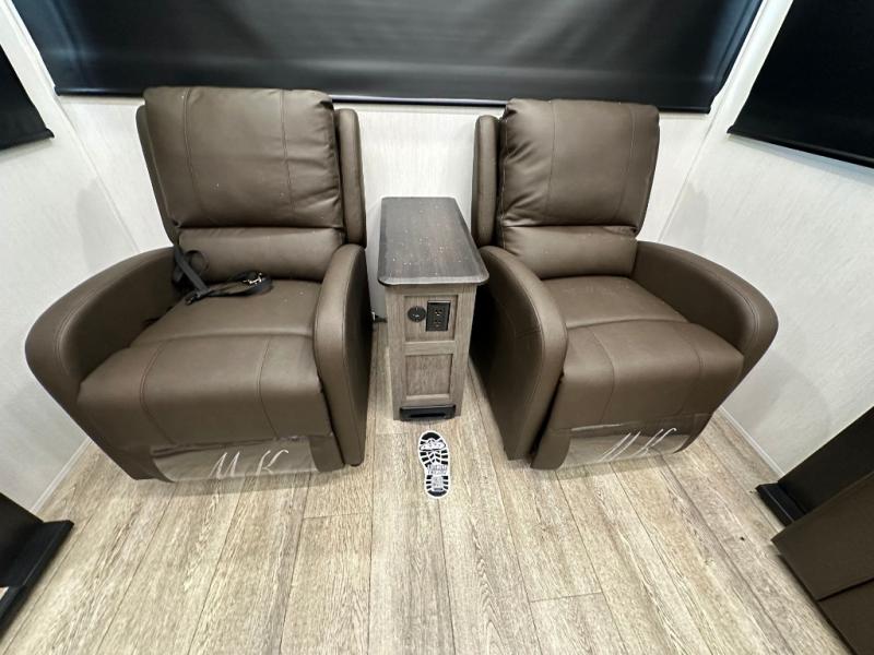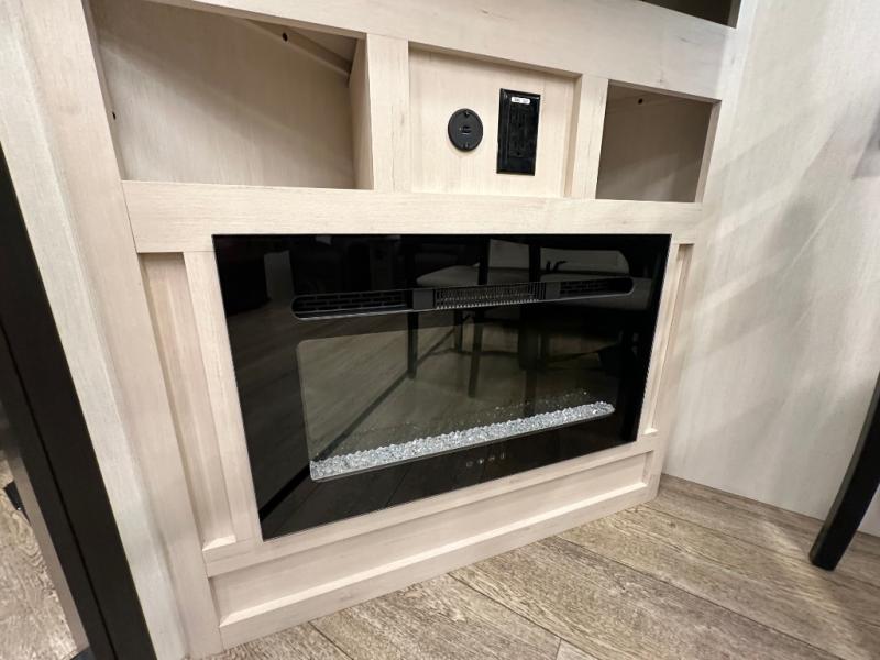 This fifth wheel is perfect for couple's but also has enough space for company too! The rear living area features two recliners with a middle table side to set your cup of coffee, a tri-fold sofa that can transform into an extra sleeping space, and free standing table with chairs and storage ottoman seat to enjoy your meals by the electric fireplace. The fully equipped kitchen has everything you need including a counter peninsula, 12V refrigerator, and plenty of storage. After a fun-filled day at the beach, rinse off in the full bathroom that includes a spacious shower, porcelain toilet, and convenient shower caddy. The front private bedroom has a queen bed to lay your head on at night and there is even USB ports on either side to charge your electronics!
