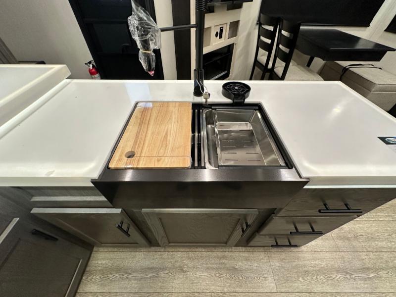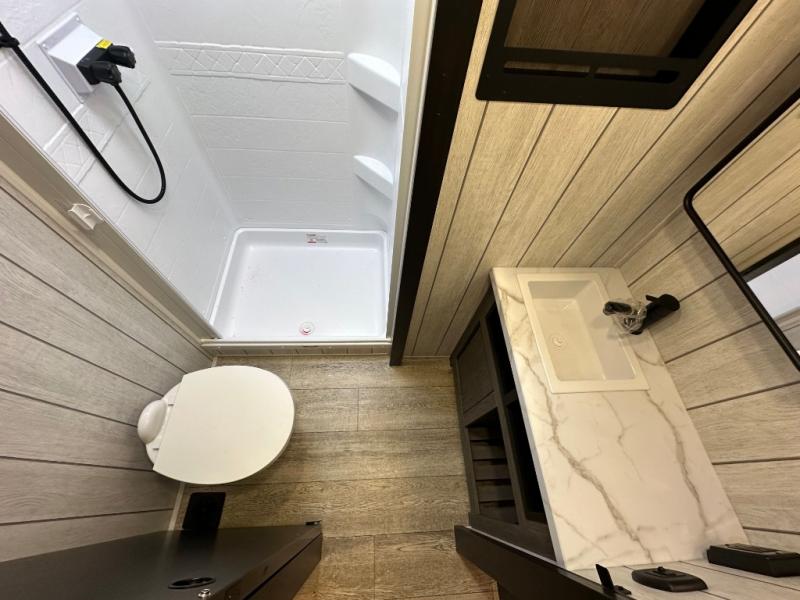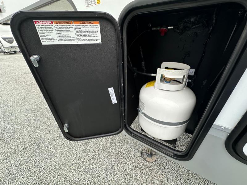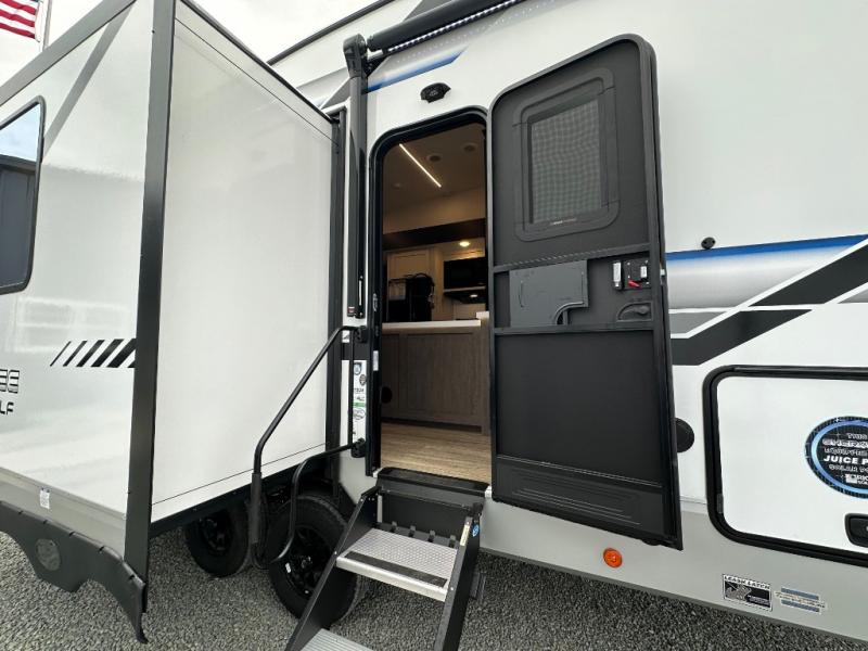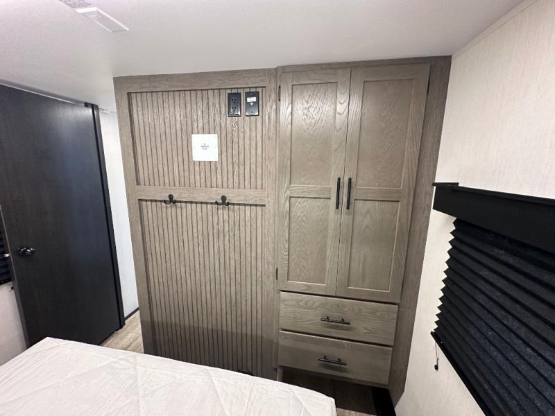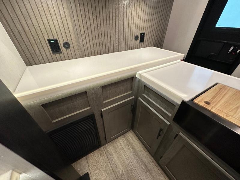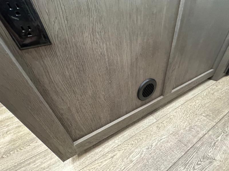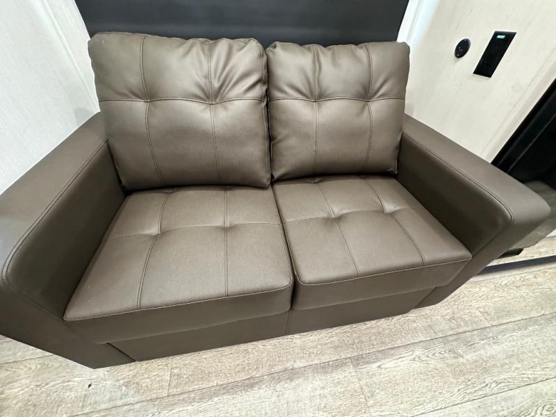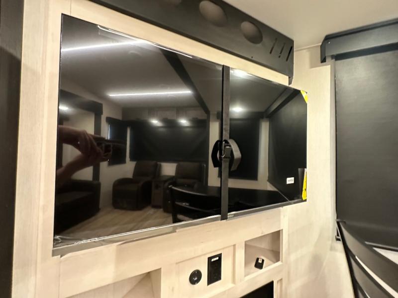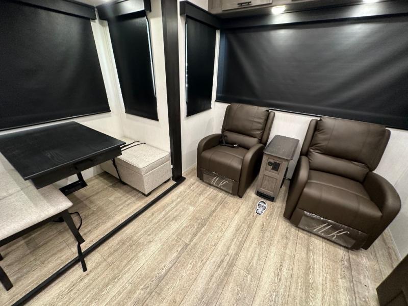 This fifth wheel is perfect for couple's but also has enough space for company too! The rear living area features two recliners with a middle table side to set your cup of coffee, a tri-fold sofa that can transform into an extra sleeping space, and free standing table with chairs and storage ottoman seat to enjoy your meals by the electric fireplace. The fully equipped kitchen has everything you need including a counter peninsula, 12V refrigerator, and plenty of storage. After a fun-filled day at the beach, rinse off in the full bathroom that includes a spacious shower, porcelain toilet, and convenient shower caddy. The front private bedroom has a queen bed to lay your head on at night and there is even USB ports on either side to charge your electronics!