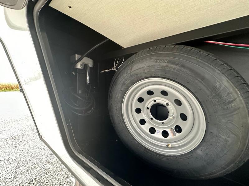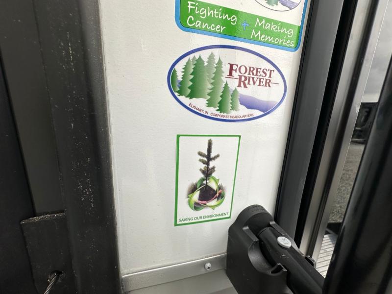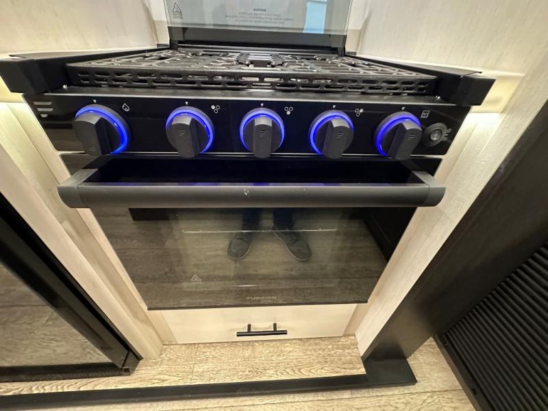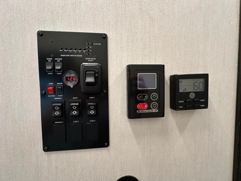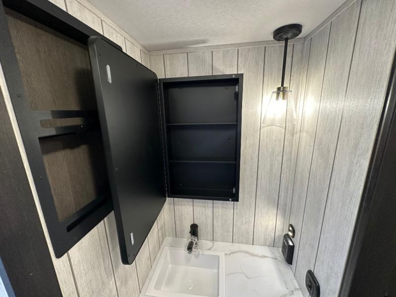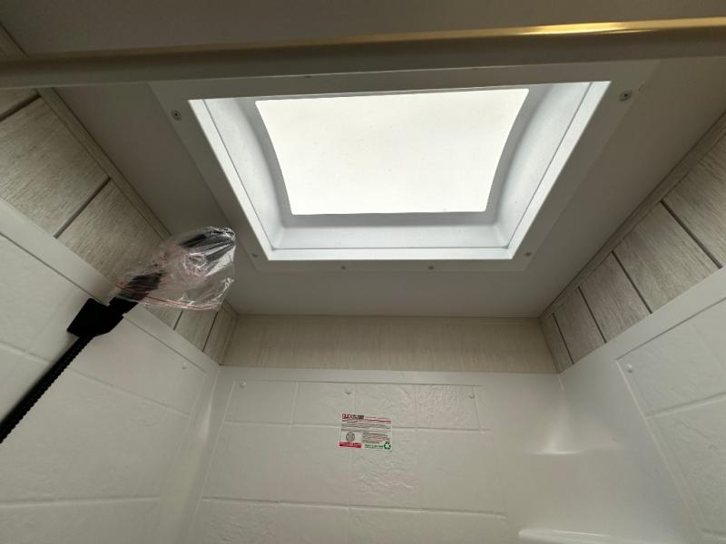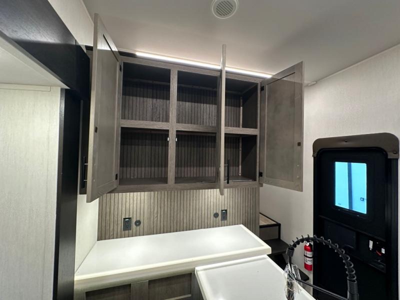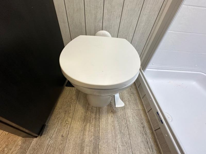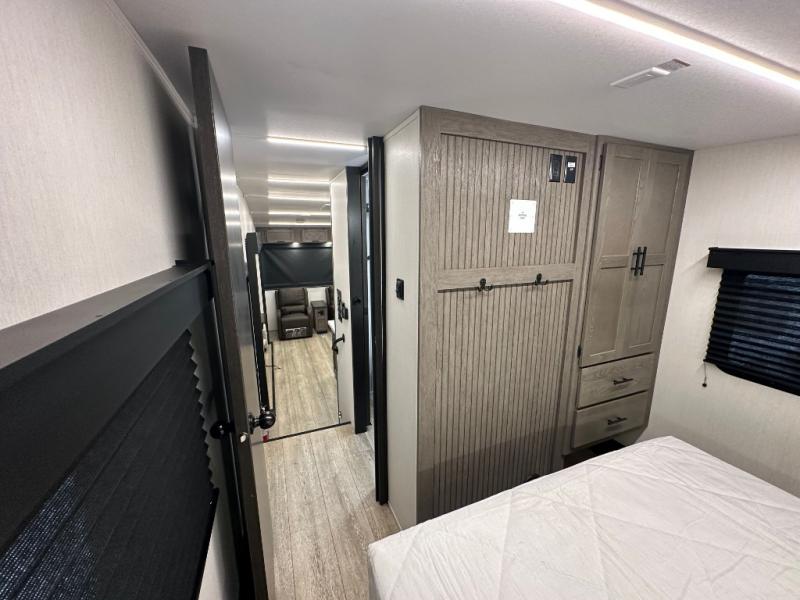This fifth wheel is perfect for couple's but also has enough space for company too! The rear living area features two recliners with a middle table side to set your cup of coffee, a tri-fold sofa that can transform into an extra sleeping space, and free standing table with chairs and storage ottoman seat to enjoy your meals by the electric fireplace. The fully equipped kitchen has everything you need including a counter peninsula, 12V refrigerator, and plenty of storage. After a fun-filled day at the beach, rinse off in the full bathroom that includes a spacious shower, porcelain toilet, and convenient shower caddy. The front private bedroom has a queen bed to lay your head on at night and there is even USB ports on either side to charge your electronics!