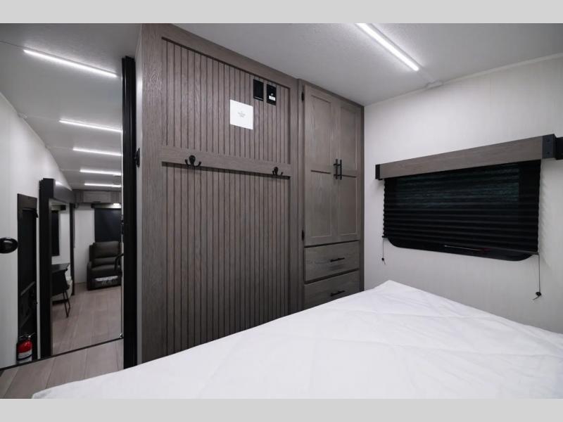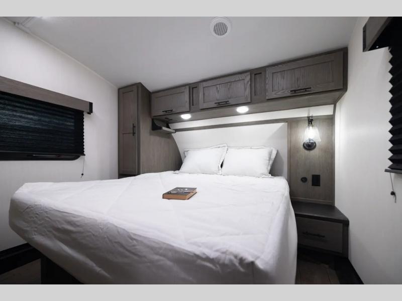 This fifth wheel is perfect for couple's but also has enough space for company too! The rear living area features two recliners with a middle table side to set your cup of coffee, a tri-fold sofa that can transform into an extra sleeping space, and free standing table with chairs and storage ottoman seat to enjoy your meals by the electric fireplace. The fully equipped kitchen has everything you need including a counter peninsula, 12V refrigerator, and plenty of storage. After a fun-filled day at the beach, rinse off in the full bathroom that includes a spacious shower, porcelain toilet, and convenient shower caddy. The front private bedroom has a queen bed to lay your head on at night and there is even USB ports on either side to charge your electronics!
